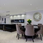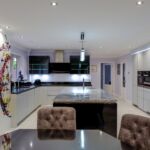These particular clients were looking for a sleek handleless kitchen which made a statement. It had to be a well thought out space for cooking, dining & entertaining. To create this modern kitchen we used high gloss lacquer doors in black and light grey. combined with contrasting worktops in ‘Super white’ and ‘Nero Absolute’ granite. A bespoke hexagon shaped dining table was created using the same Nero absolute quartz to marry the dining area to the kitchen.