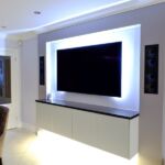 The state of the art Miele ovens are showcased in a tall bank of units, with a light feature above. The same lighting design has been used on the back wall to frame the TV/media area, giving the appearance of floating units.