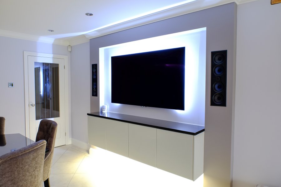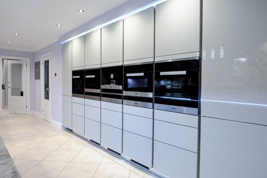 The state of the art Miele ovens are showcased in a tall bank of units, with a light feature above. The same lighting design has been used on the back wall to frame the TV/media area, giving the appearance of floating units.
