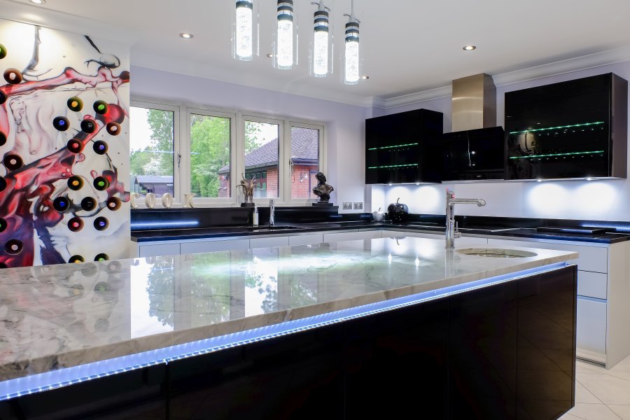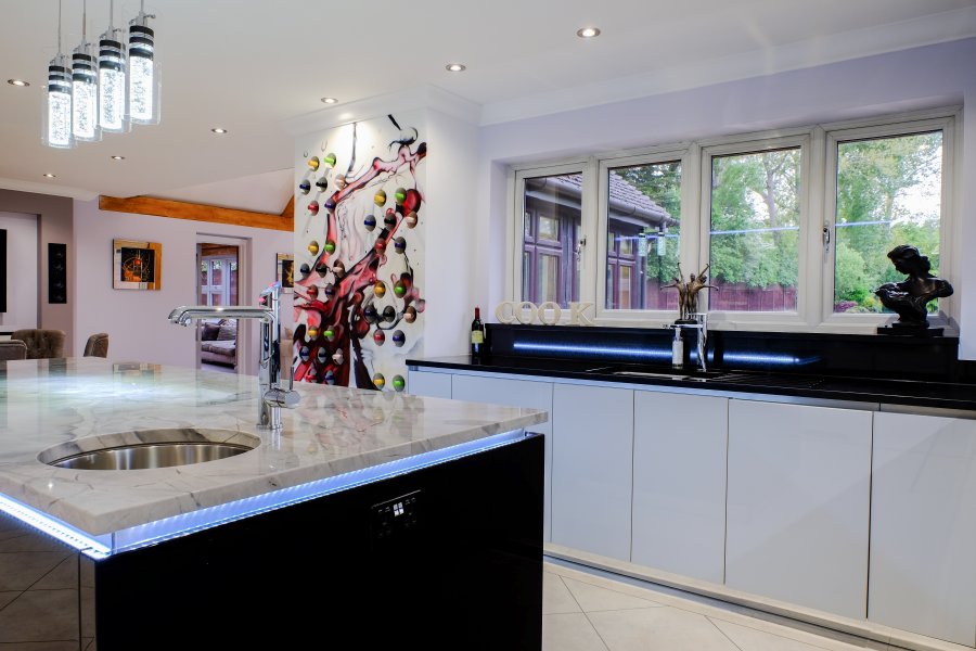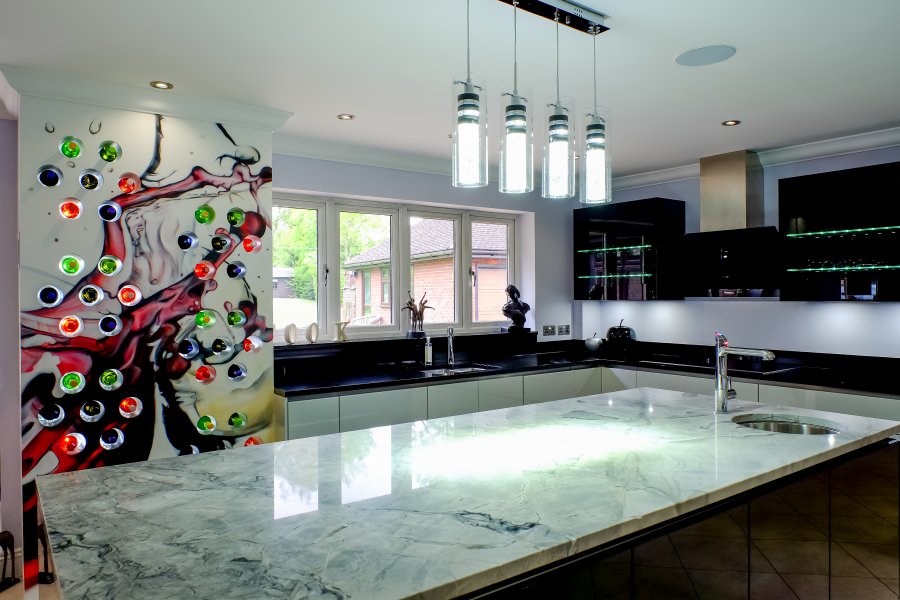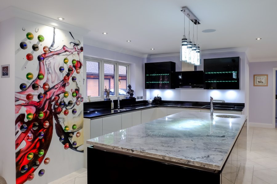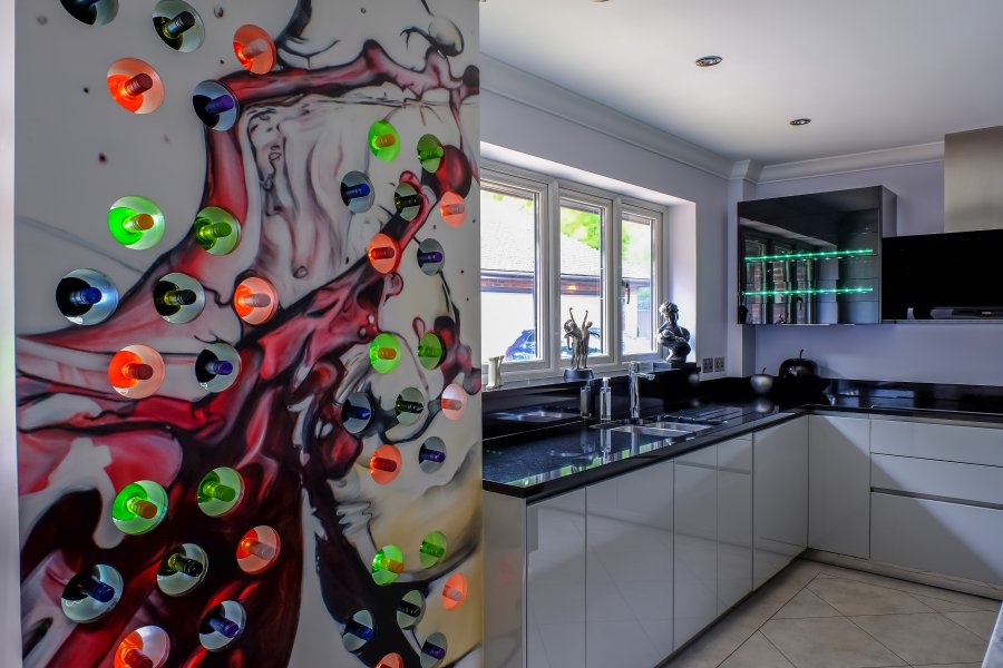 The biggest statement piece in this kitchen is the bespoke feature wine rack. The clients wanted to add an artistic touch so a graffiti artist created a unique design on this exciting feature in their new kitchen.