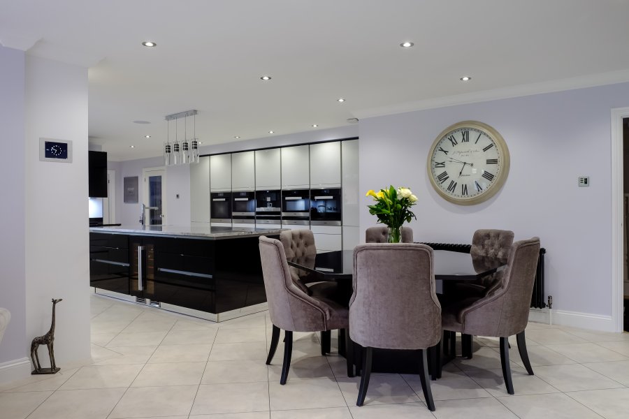 These particular clients were looking for a sleek handleless kitchen which made a statement. It had to be a well thought out space for cooking, dining & entertaining. To create this modern kitchen we used high gloss lacquer doors in black and light grey. combined with contrasting worktops in ‘Super white’ and ‘Nero Absolute’ granite. A bespoke hexagon shaped dining table was created using the same Nero absolute quartz to marry the dining area to the kitchen.