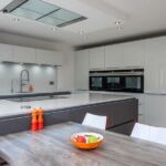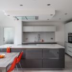 This stunning modern handleless kitchen showcases high gloss lacquer doors in brilliant white and lava grey, paired with sleek worktops in 20mm ‘Blanco Stellar’ quartz. This has also been used as wall cladding on the sink run, providing a seamless-looking surface.