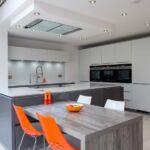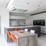 The breakfast table in 50mm laminate wood effect creates texture and warmth in a minimalist design. The base units are illuminated with the use of spot lighting and handle trim strip lights, giving the appearance of a ‘floating’ worktop.