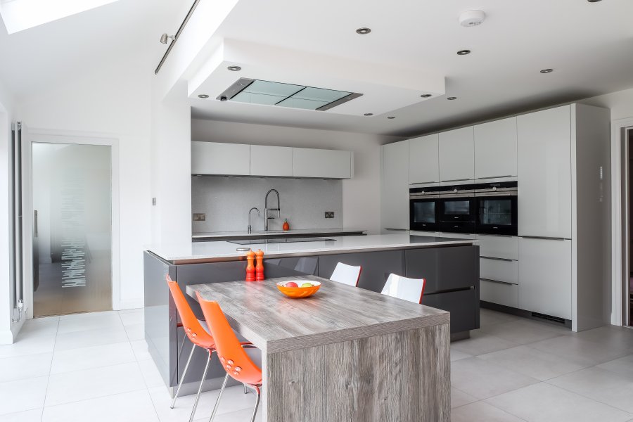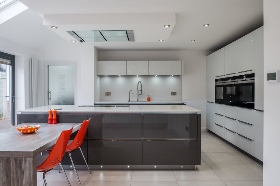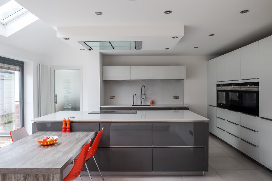 This stunning modern handleless kitchen showcases high gloss lacquer doors in brilliant white and lava grey, paired with sleek worktops in 20mm ‘Blanco Stellar’ quartz. This has also been used as wall cladding on the sink run, providing a seamless-looking surface.