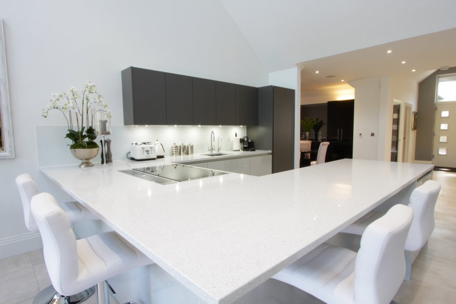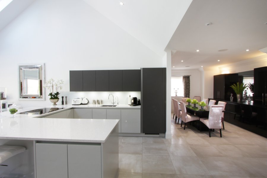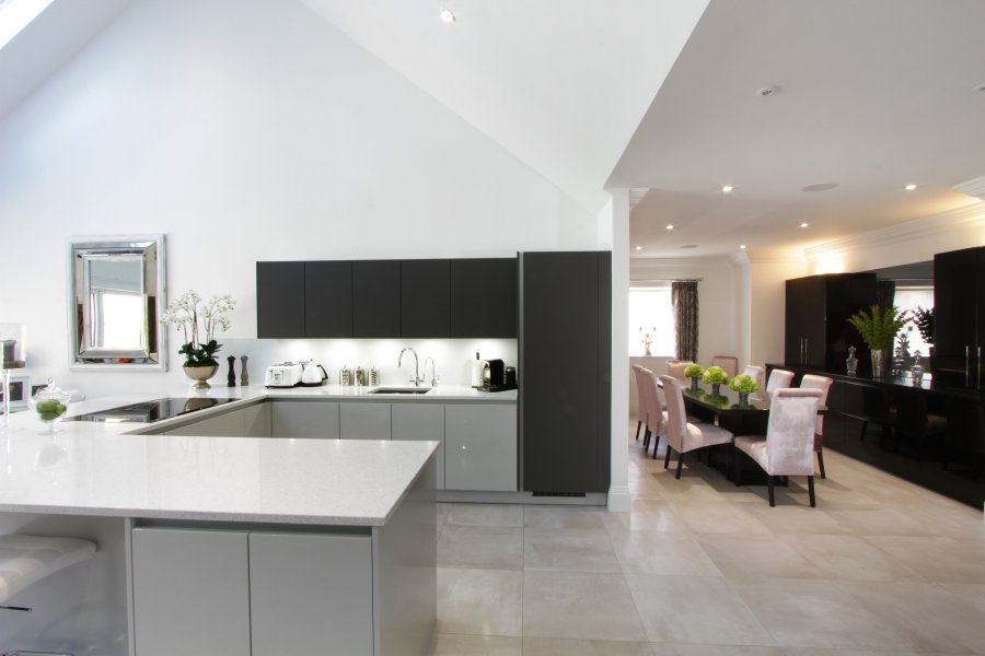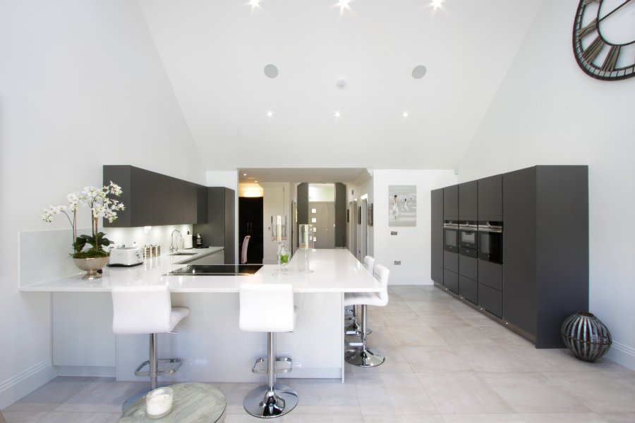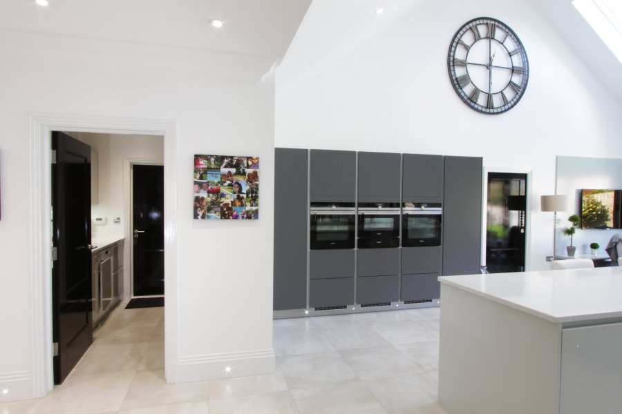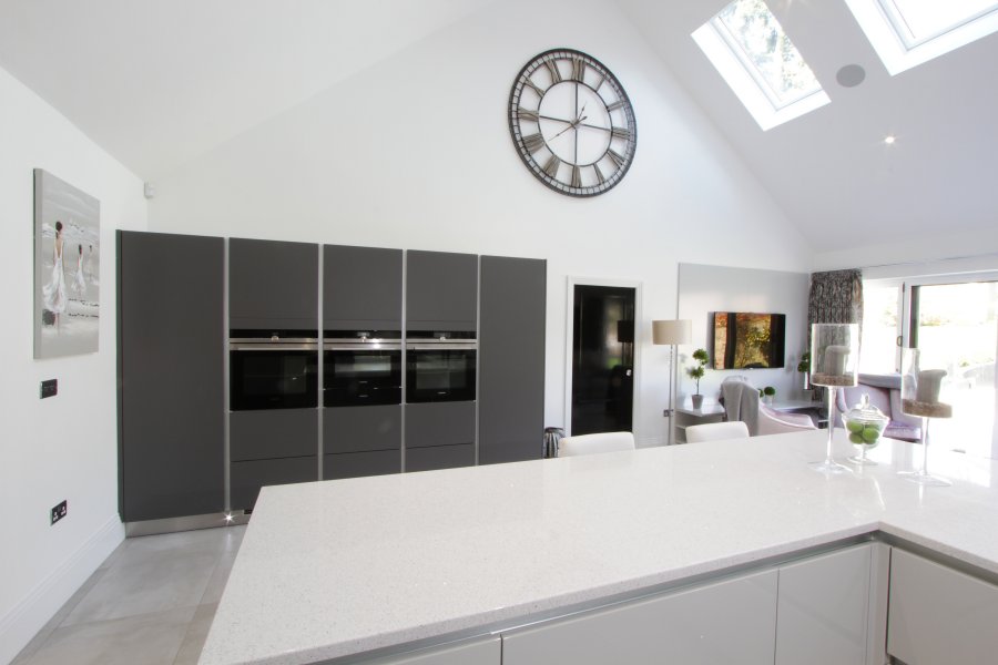 The furniture doors are a mix of gloss lacquered light grey and silk matte graphite, paired with a minimalist white quartz. Our client opted for a peninsular rather than an island, to ensure the flow from the entrance hall was not met by any obstacles.