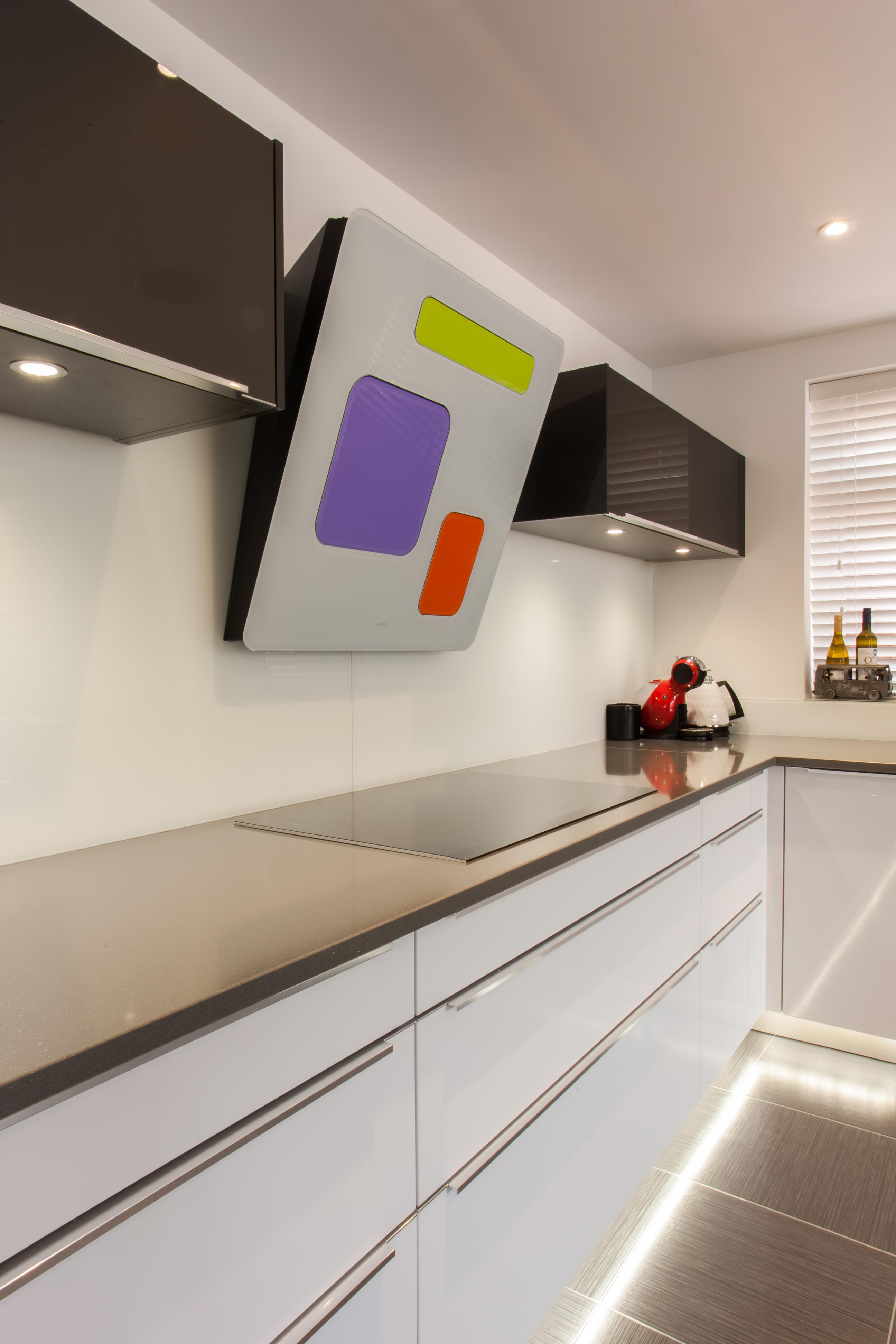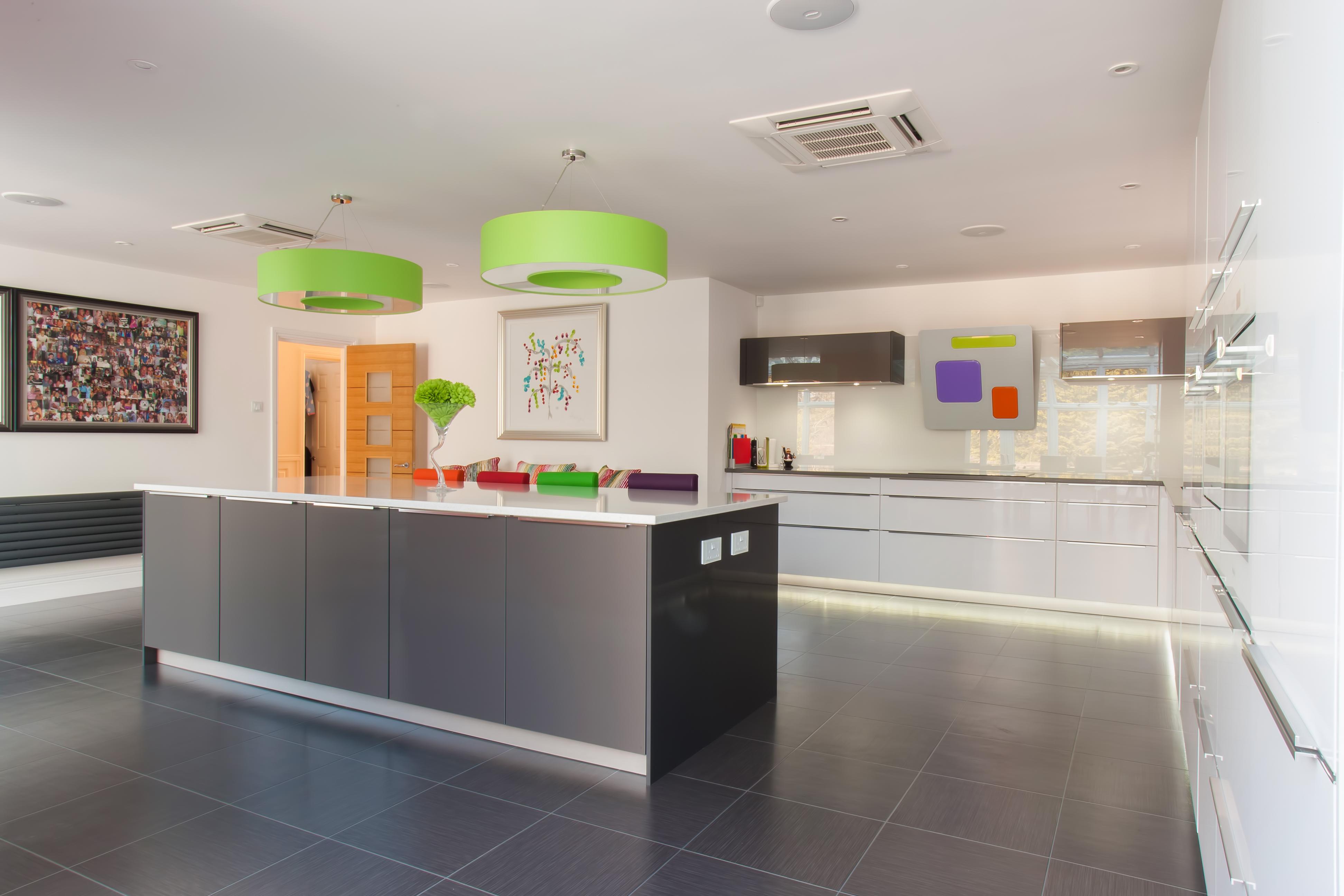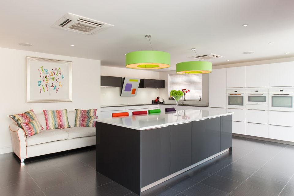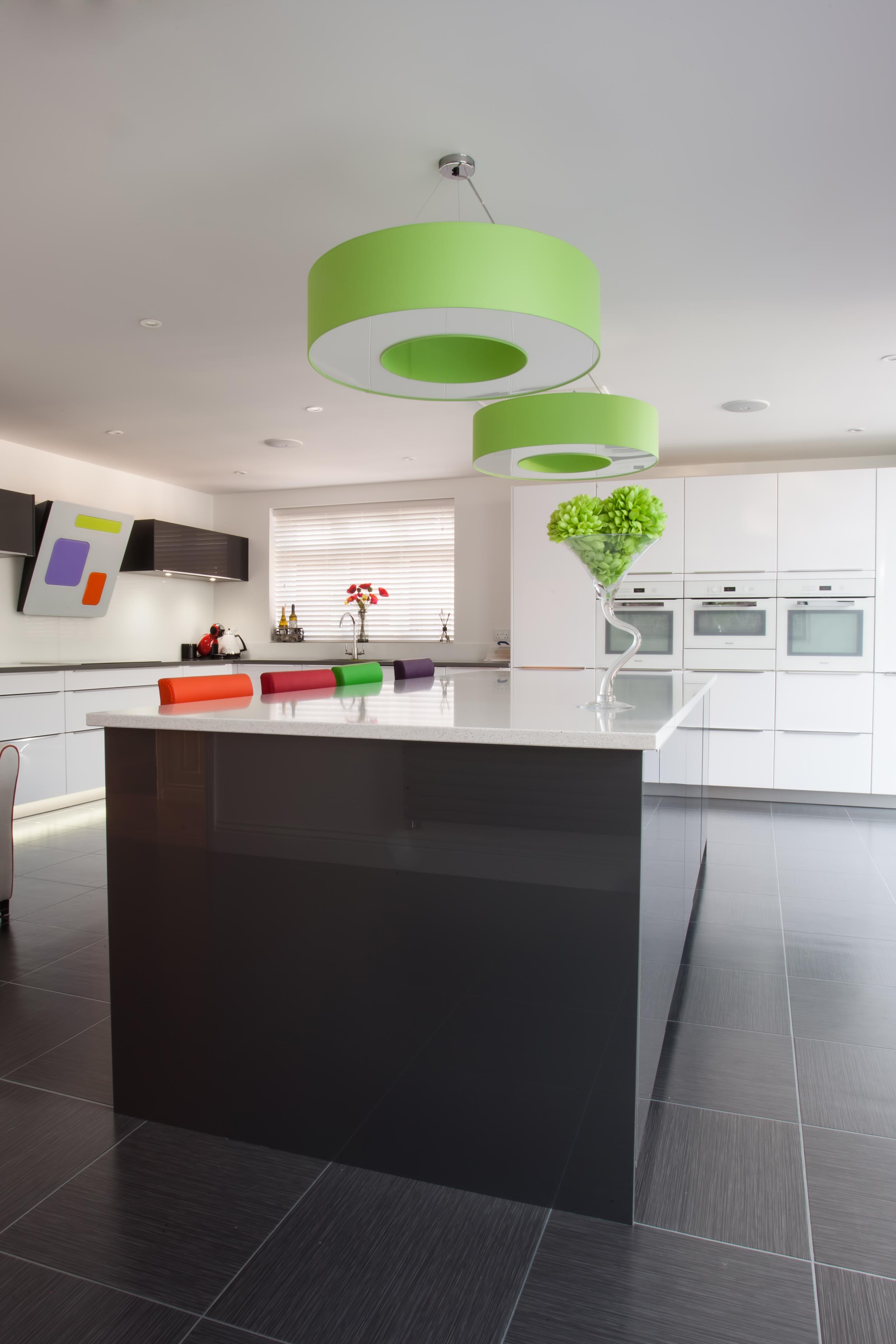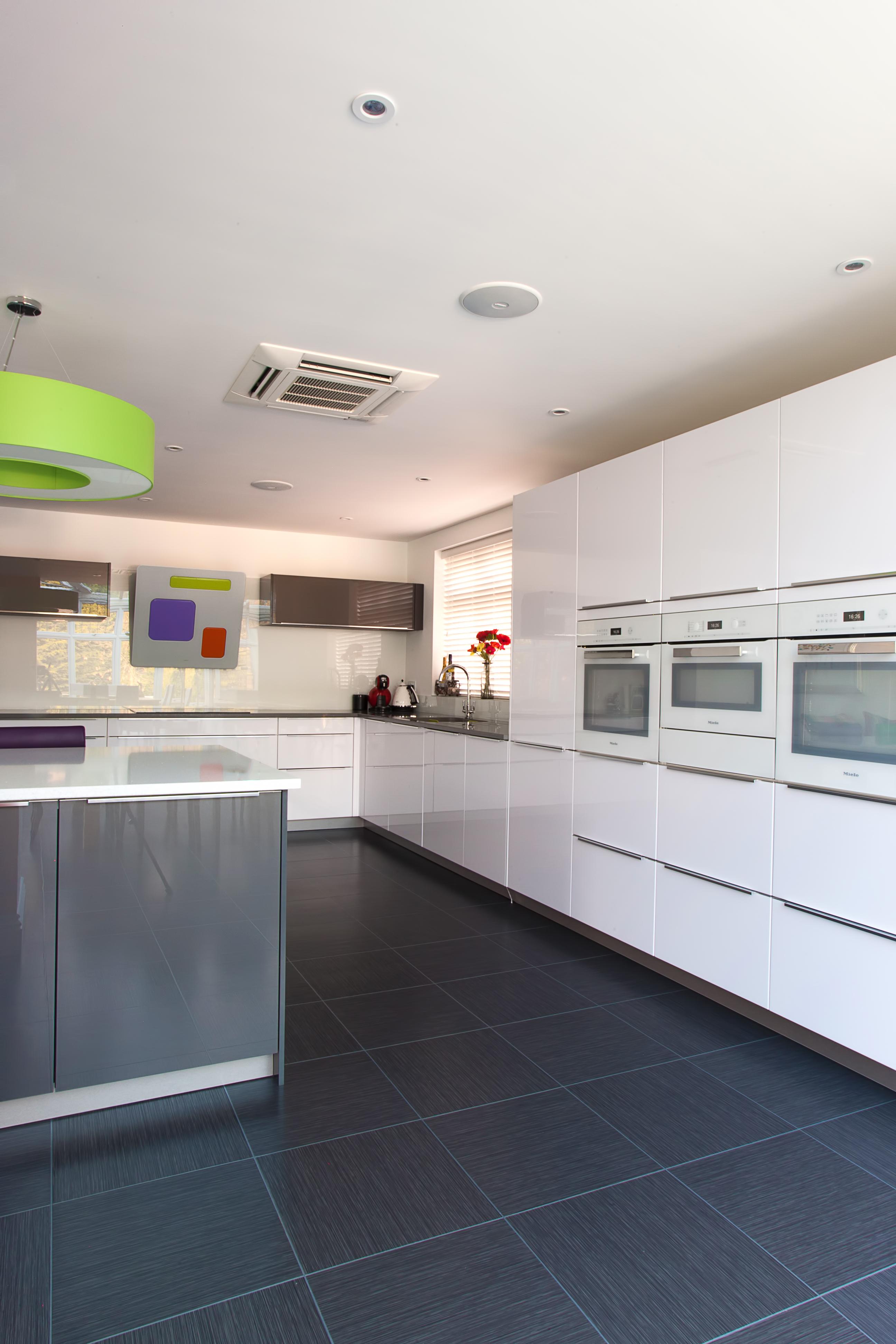 A white high gloss lacquer combines with gunmetal grey in this striking and colourful family kitchen.