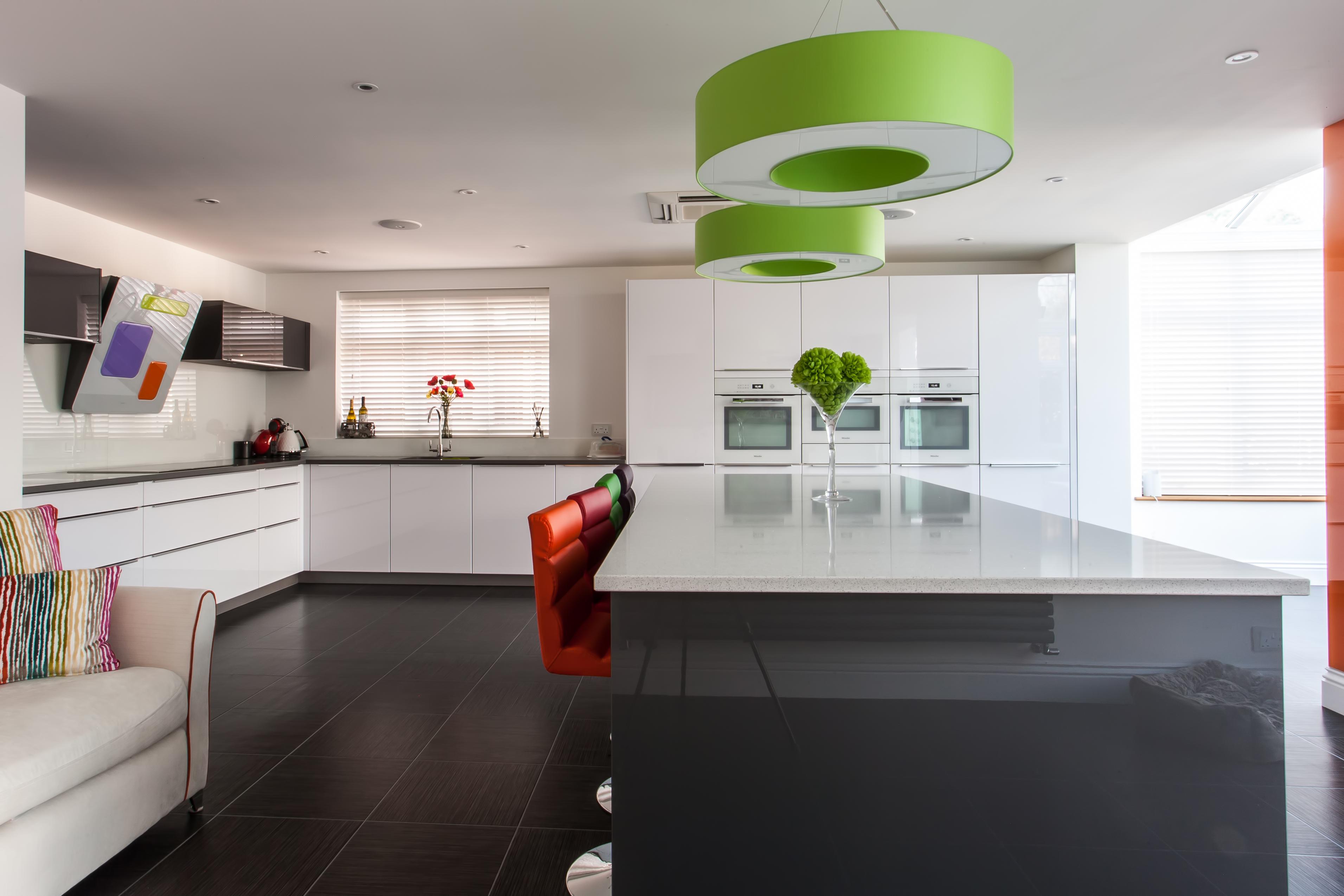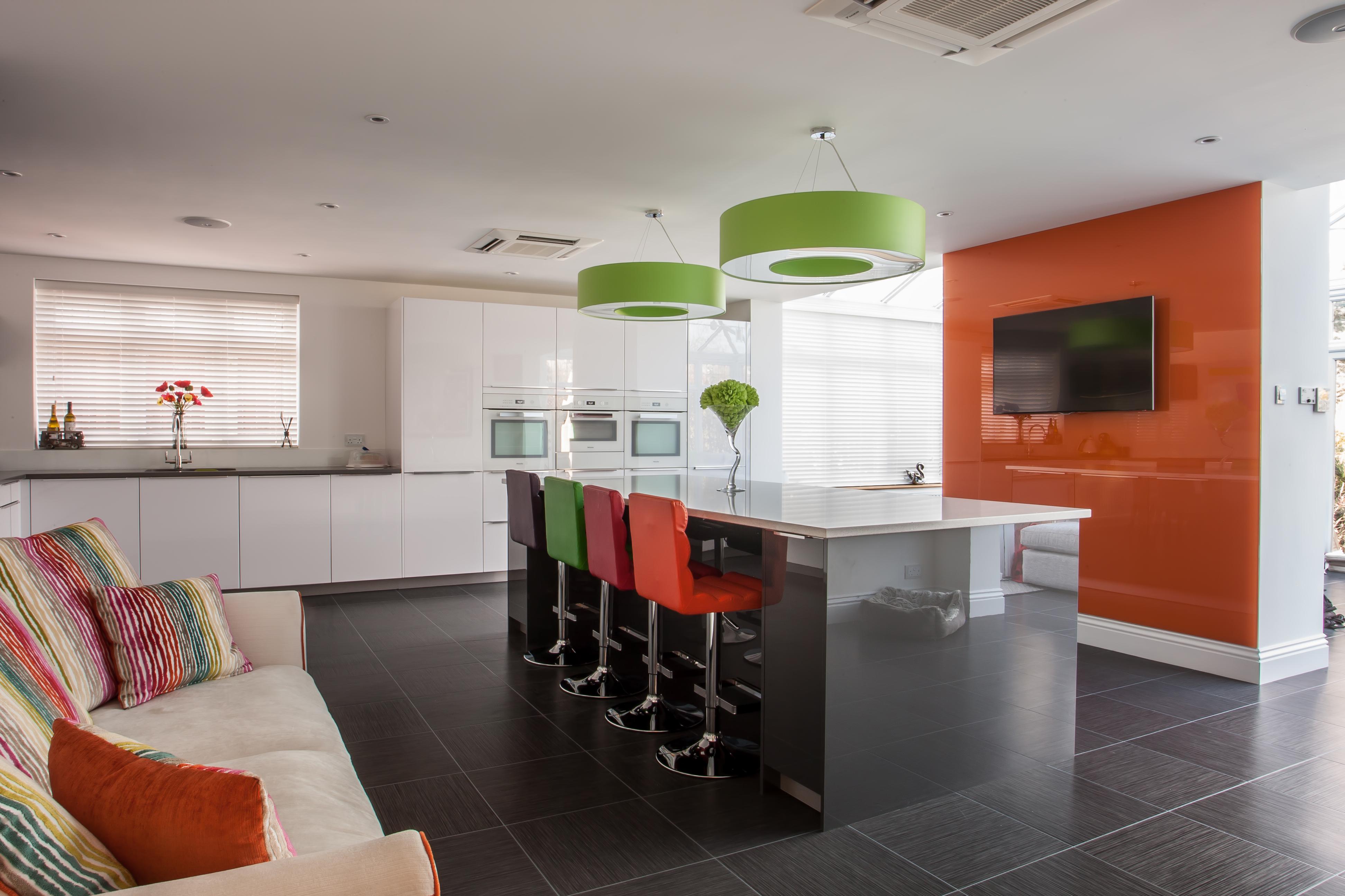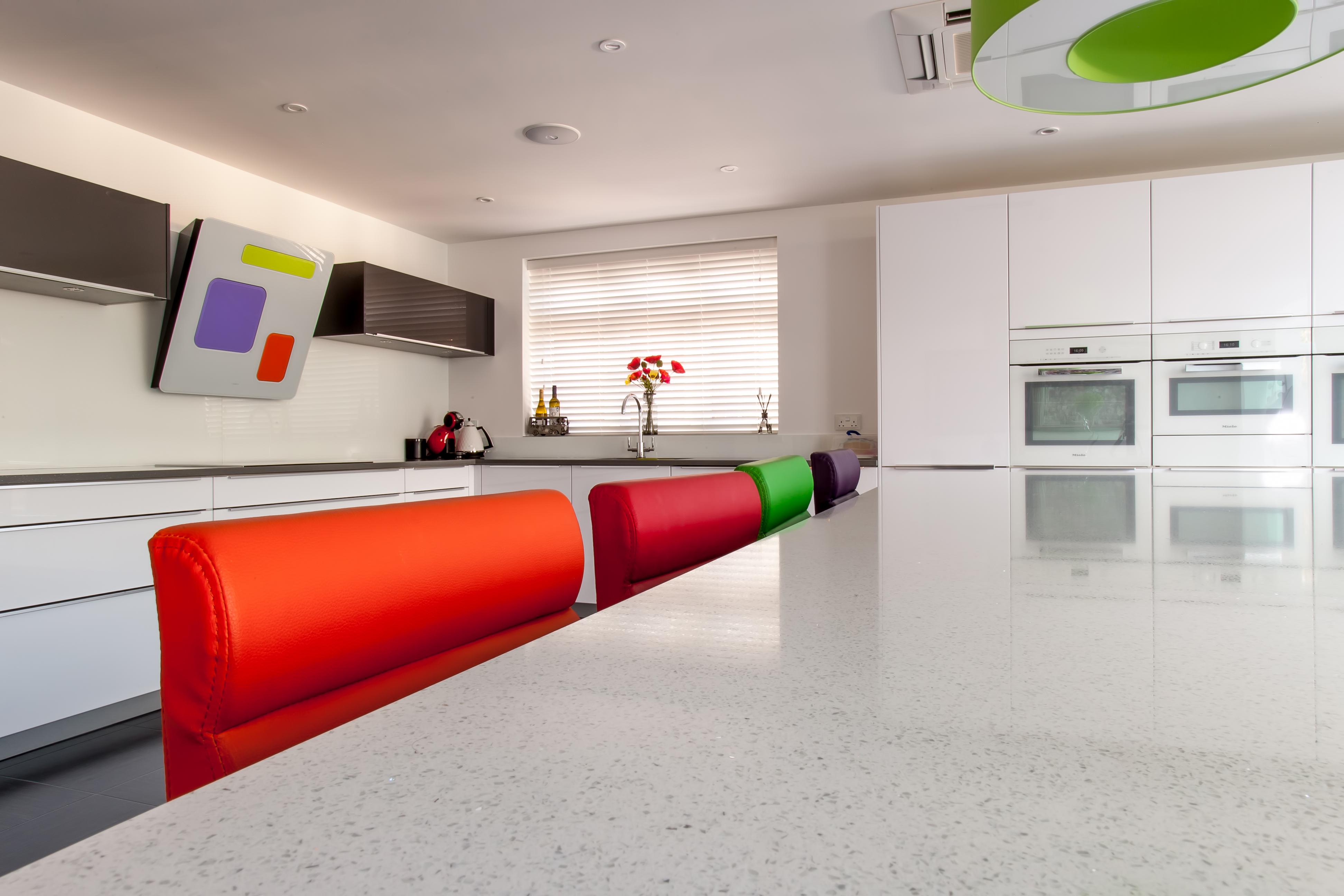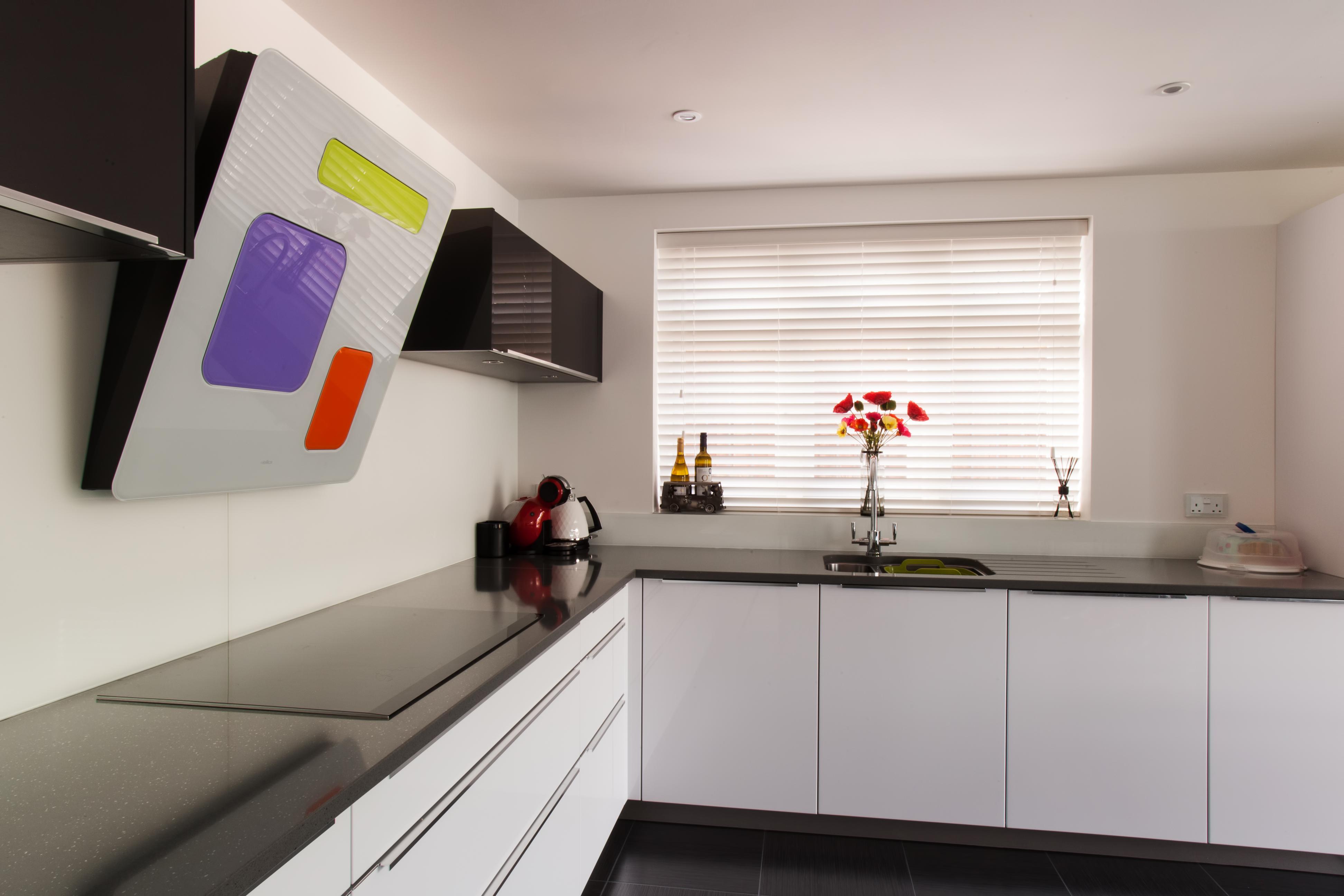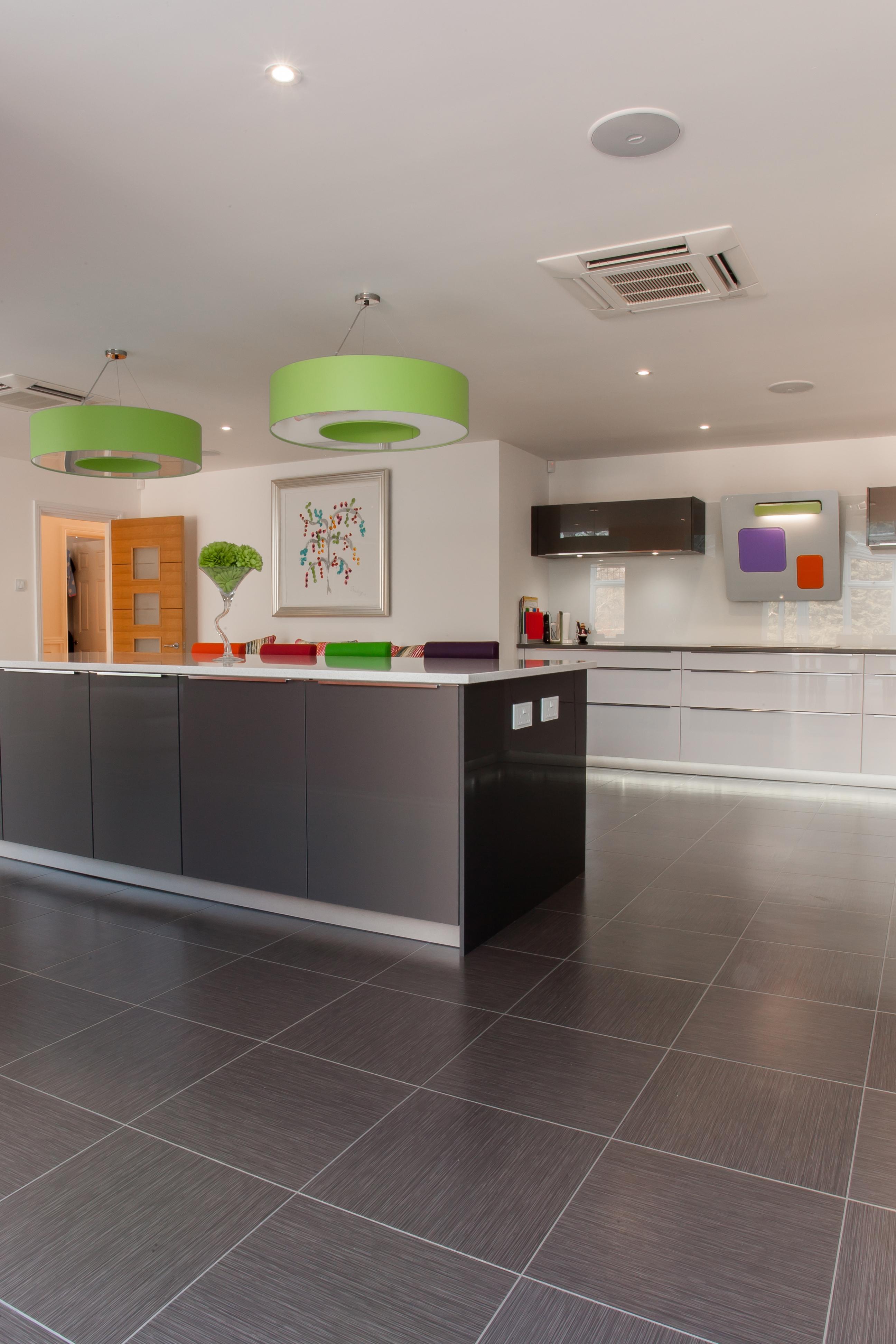 A white high gloss lacquer combines with gunmetal grey in this striking and colourful family kitchen.