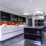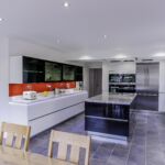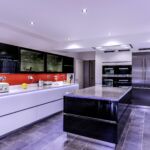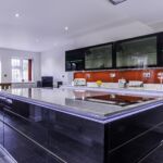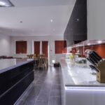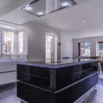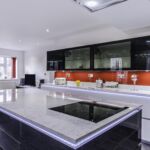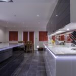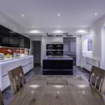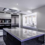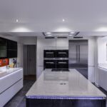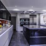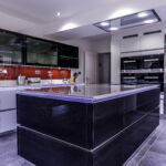 The different types of lighting in this kitchen help to set an atmospheric mood, from the handle trim lighting to the illuminated glass cupboards. The mix of glazed units have been used to break up the solid cabinetry, with black glass doors in the centre and electric glass ‘climbing’ units either side.