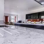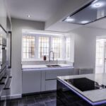 The quartz worktop in ‘Lyra’ has a subtle vein on a light background, which provides an attractive contrast on the island. Integrated into the island is the hob, with a flush ceiling extractor that doesn’t detract from the eye line.