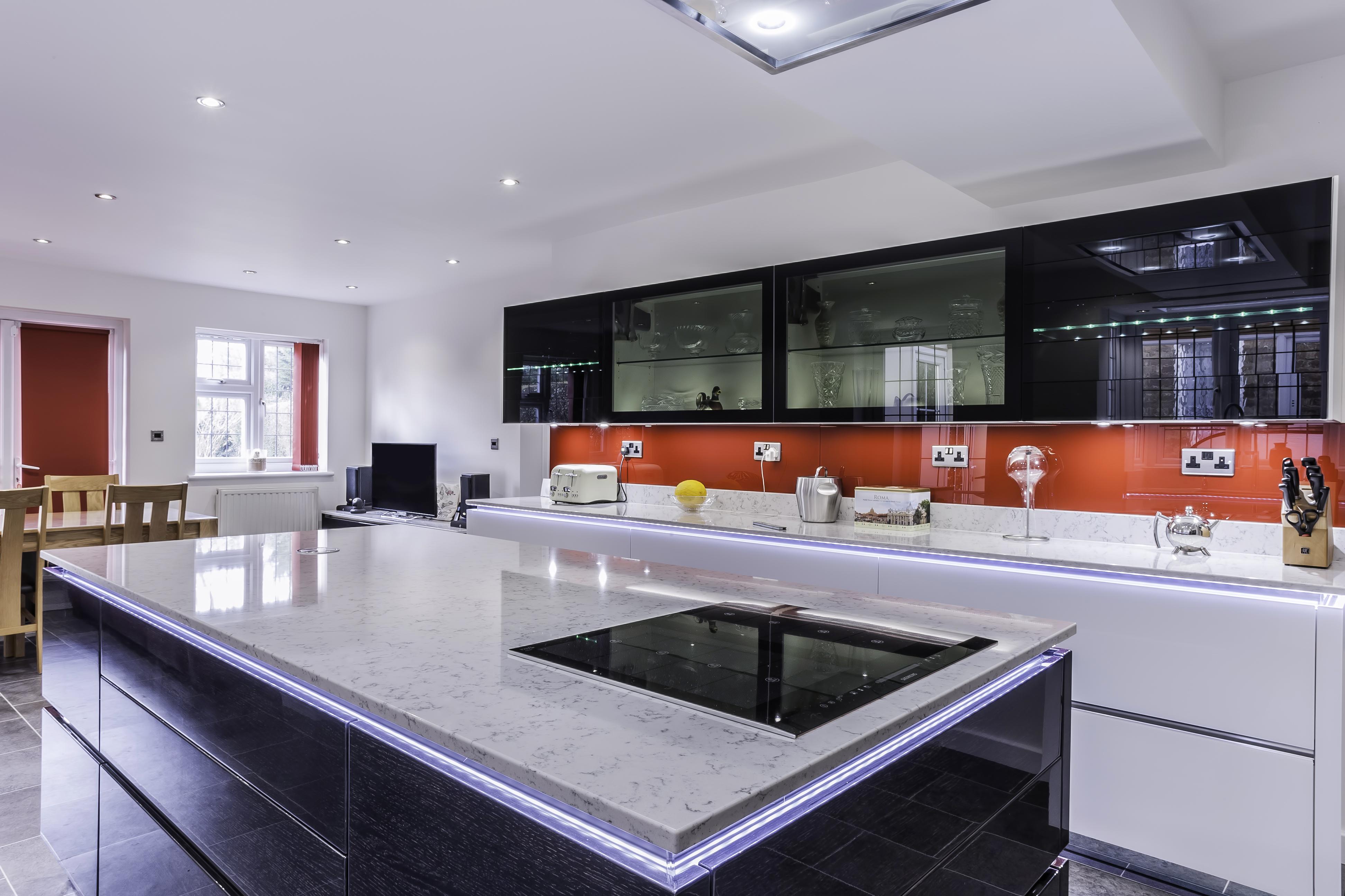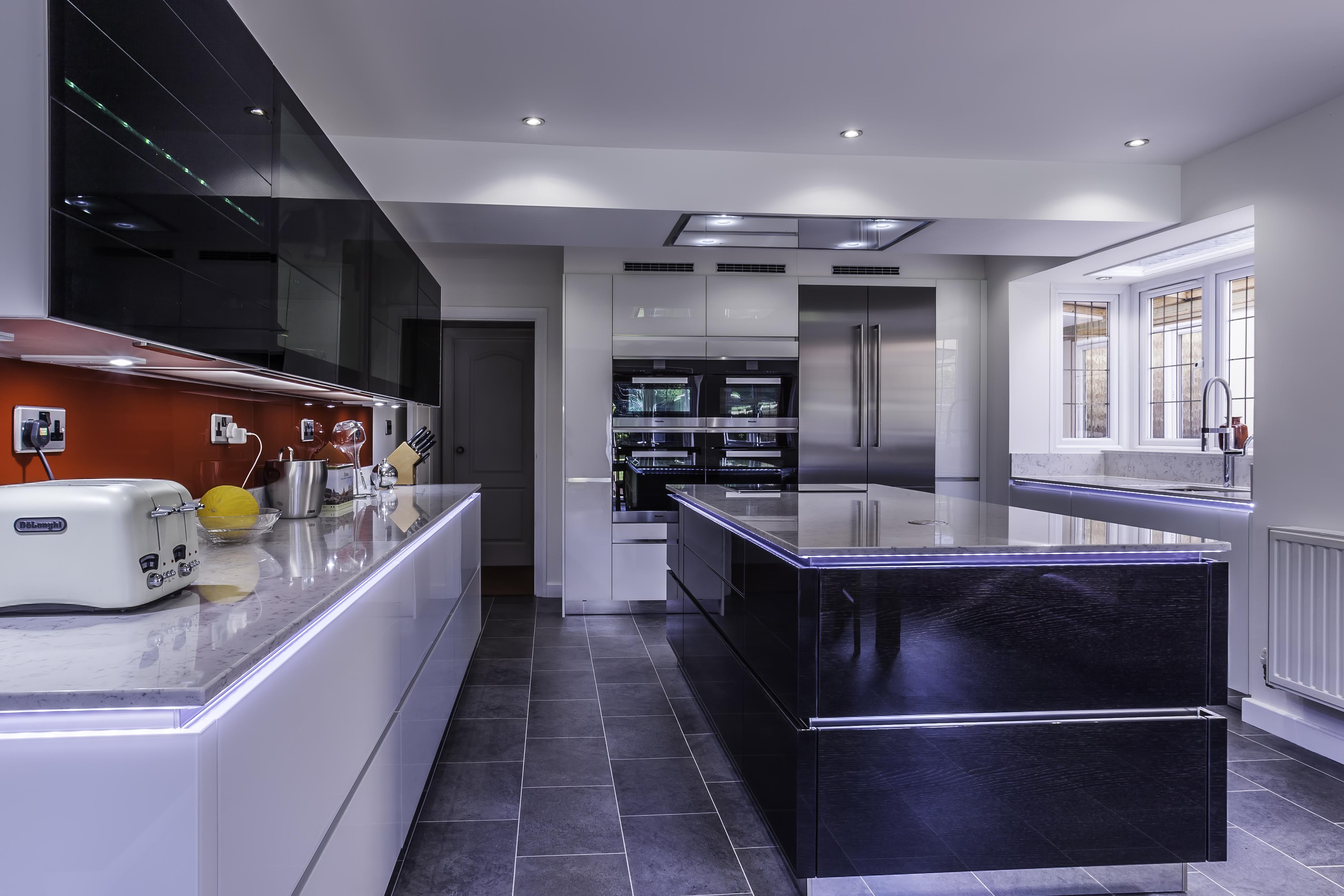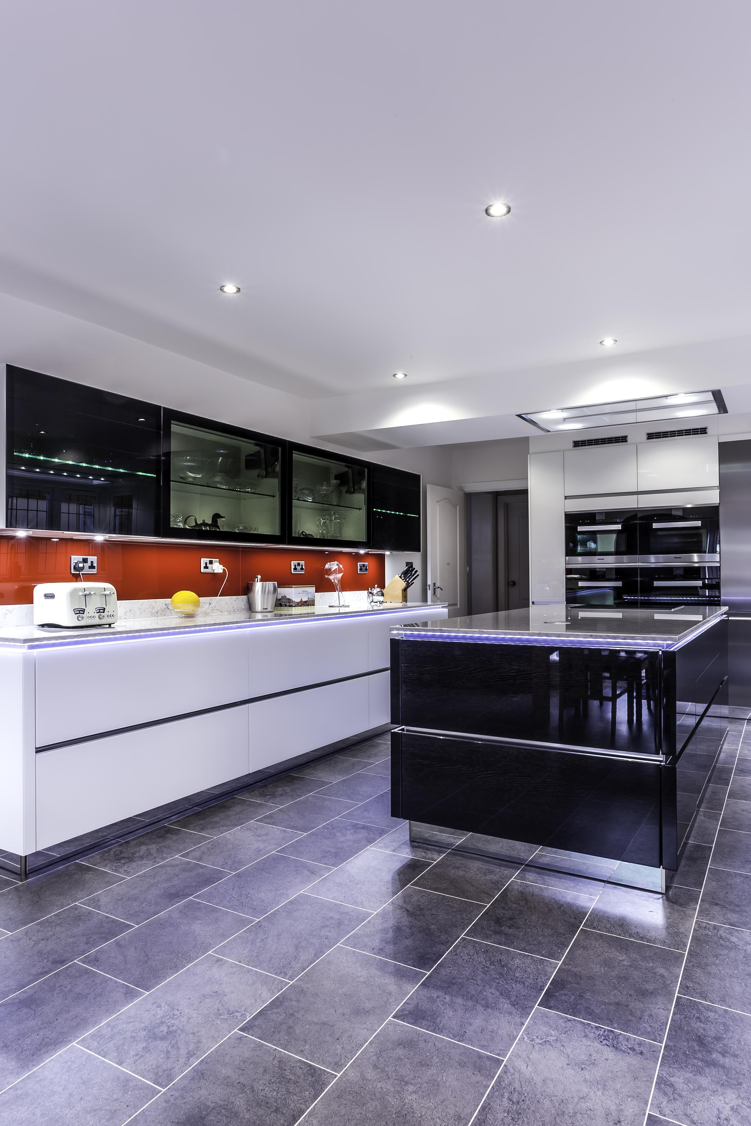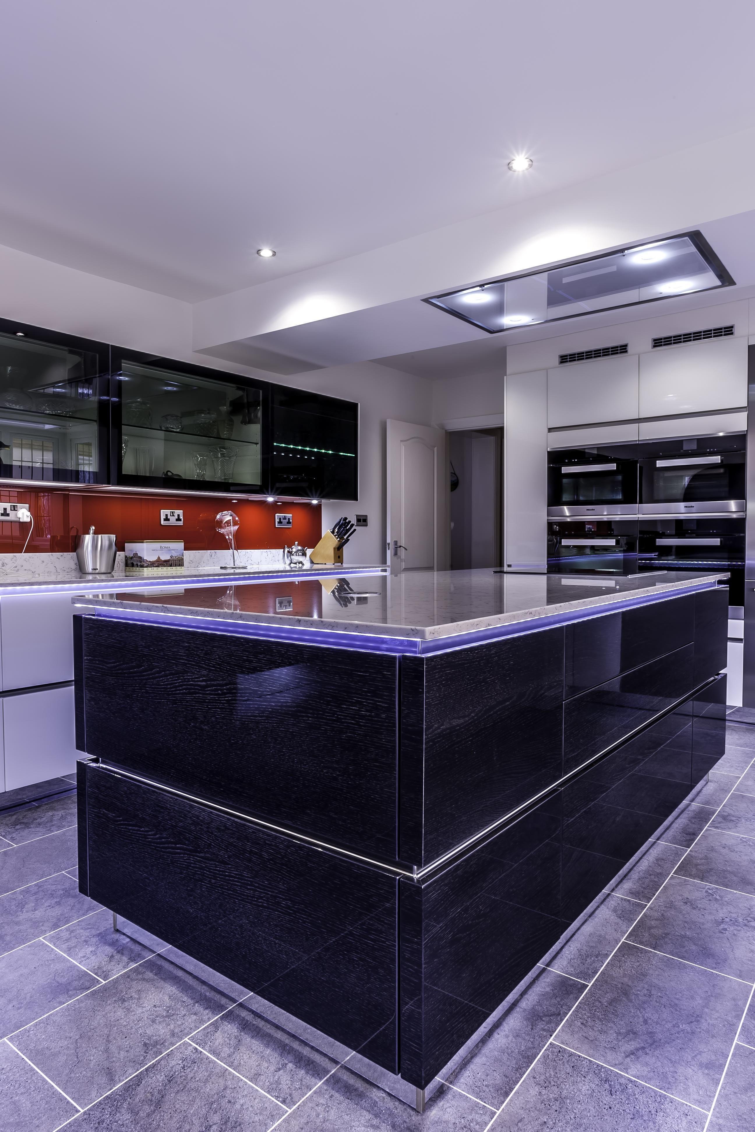 The different types of lighting in this kitchen help to set an atmospheric mood, from the handle trim lighting to the illuminated glass cupboards. The mix of glazed units have been used to break up the solid cabinetry, with black glass doors in the centre and electric glass ‘climbing’ units either side.