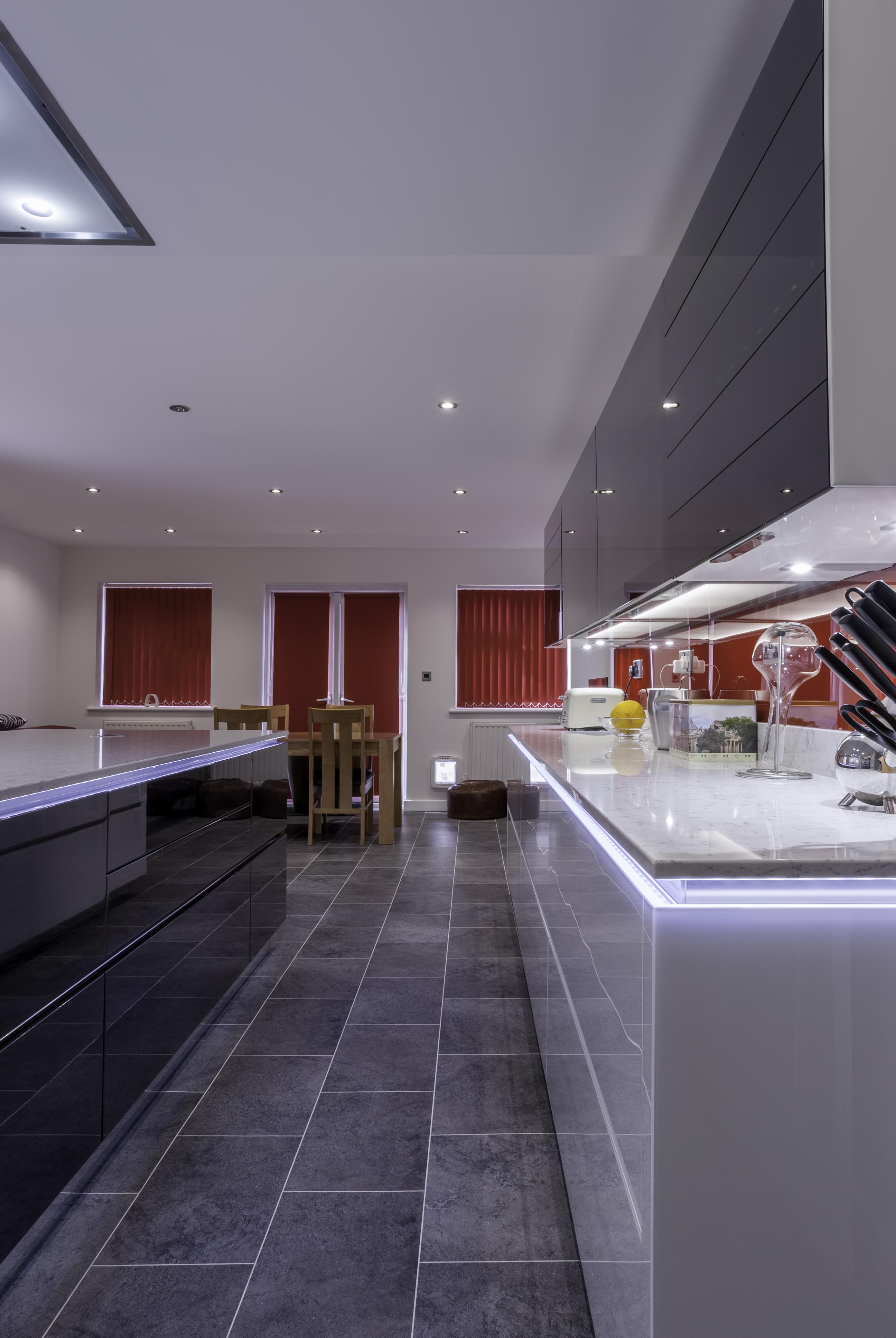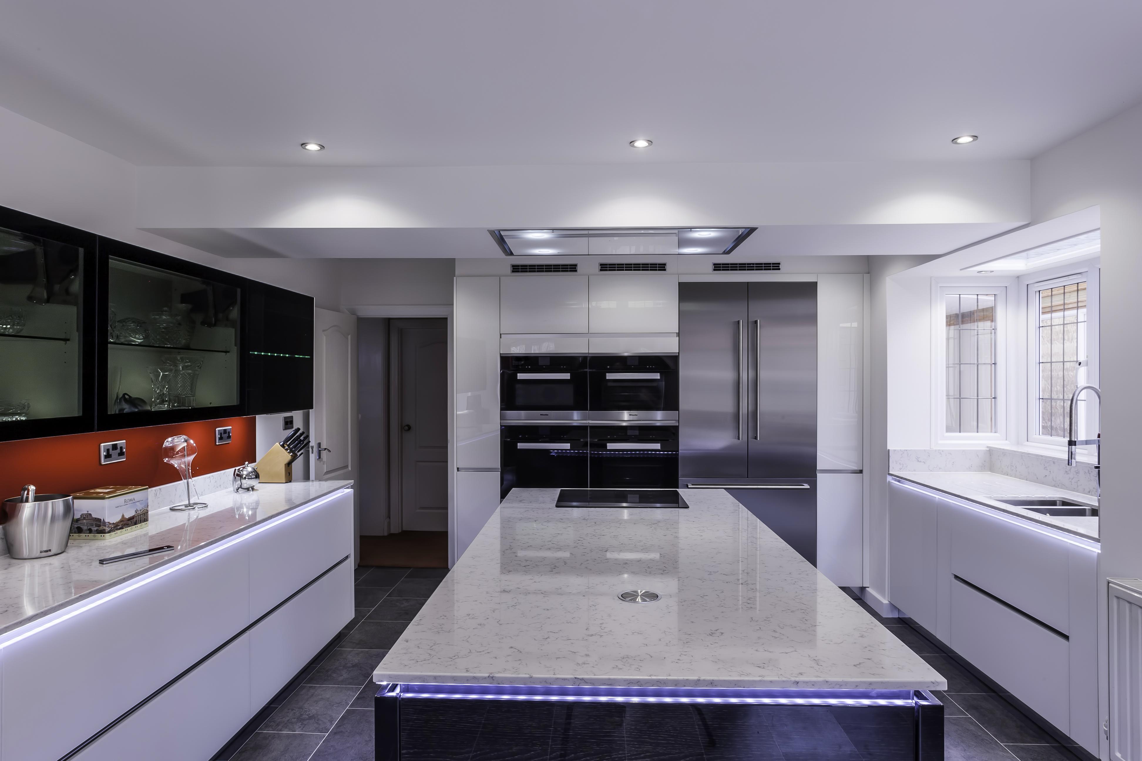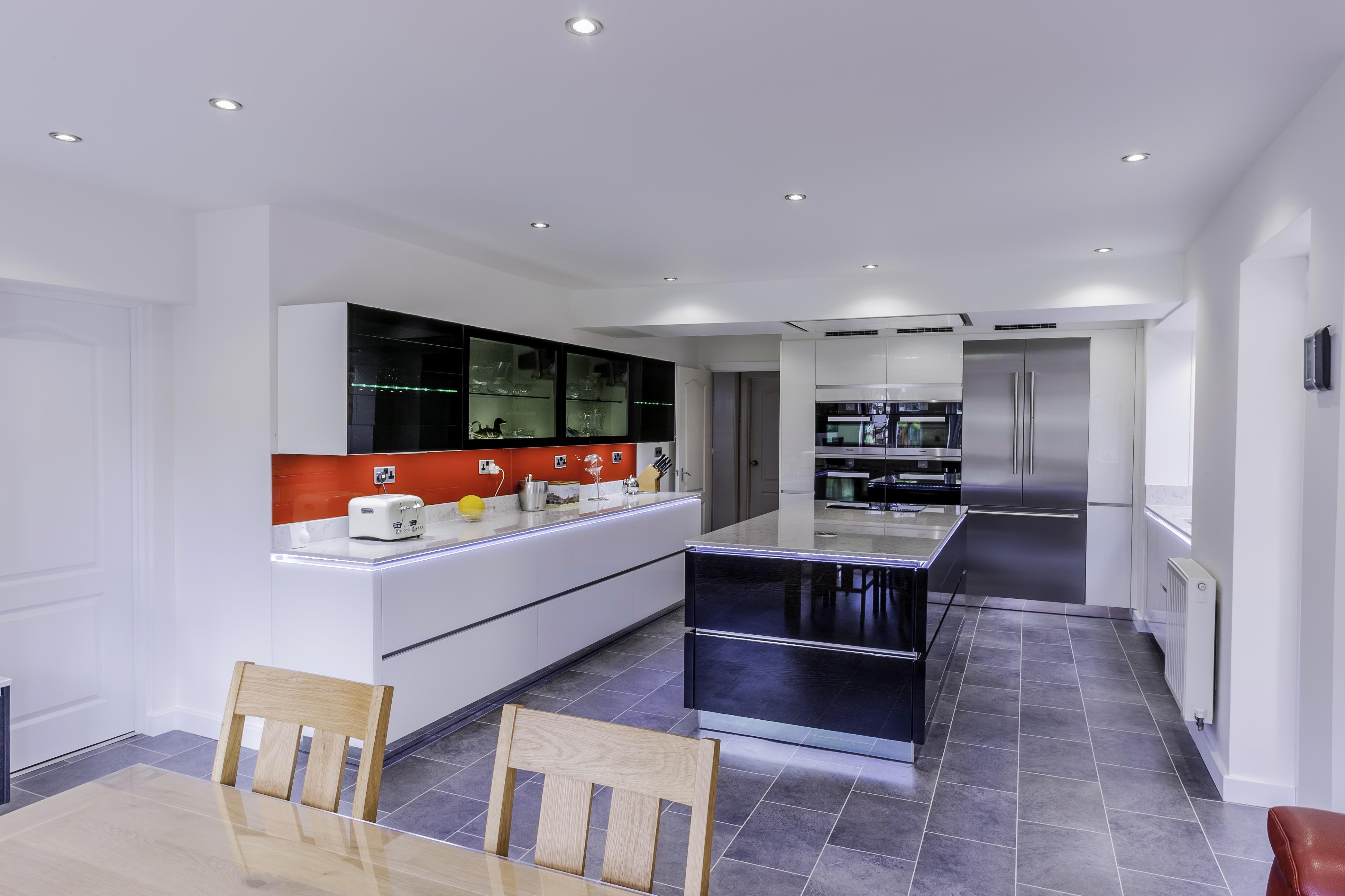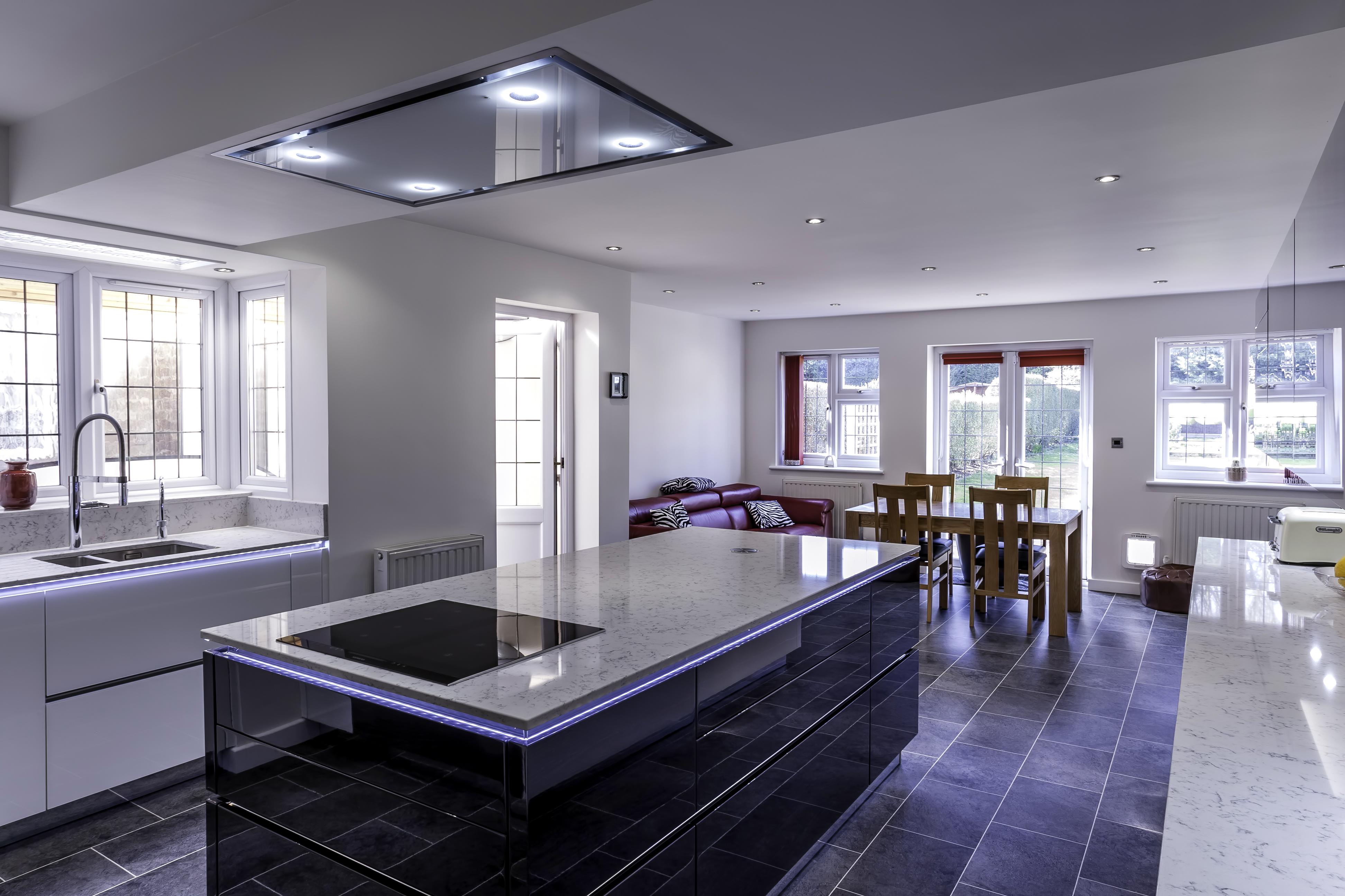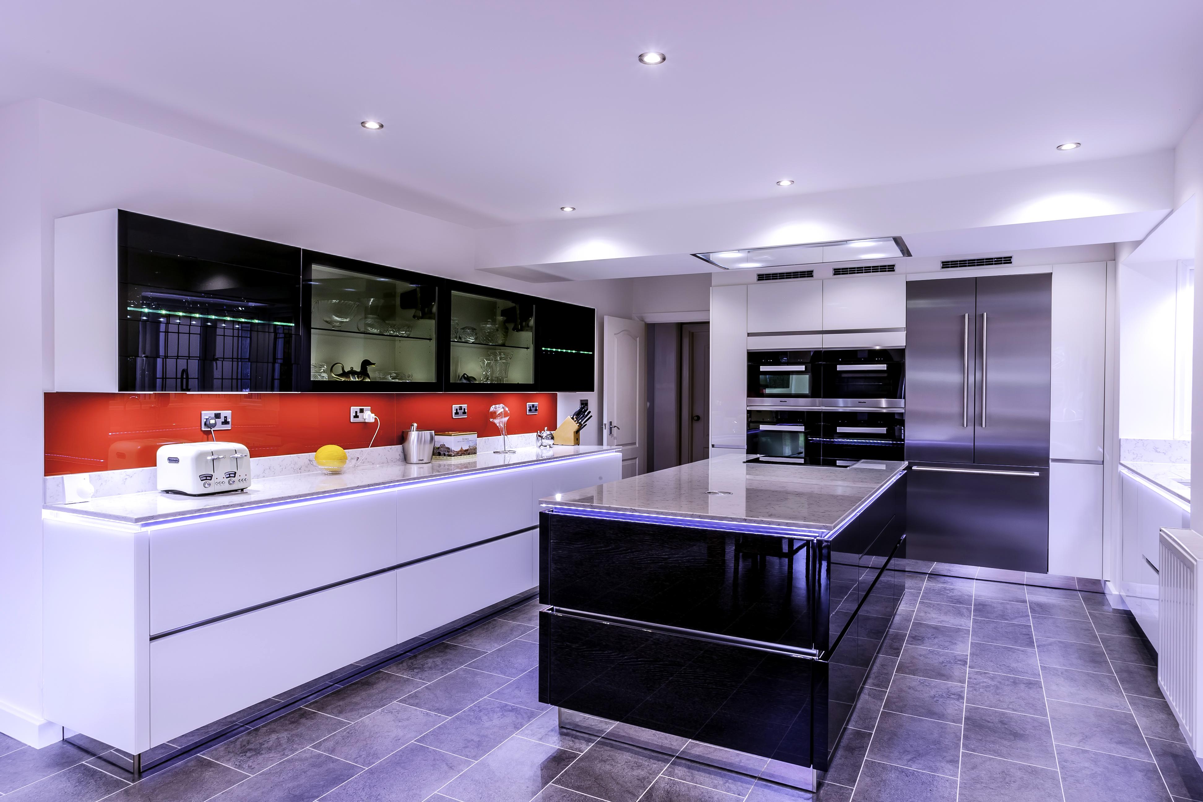 The different types of lighting in this kitchen help to set an atmospheric mood, from the handle trim lighting to the illuminated glass cupboards. The mix of glazed units have been used to break up the solid cabinetry, with black glass doors in the centre and electric glass ‘climbing’ units either side.