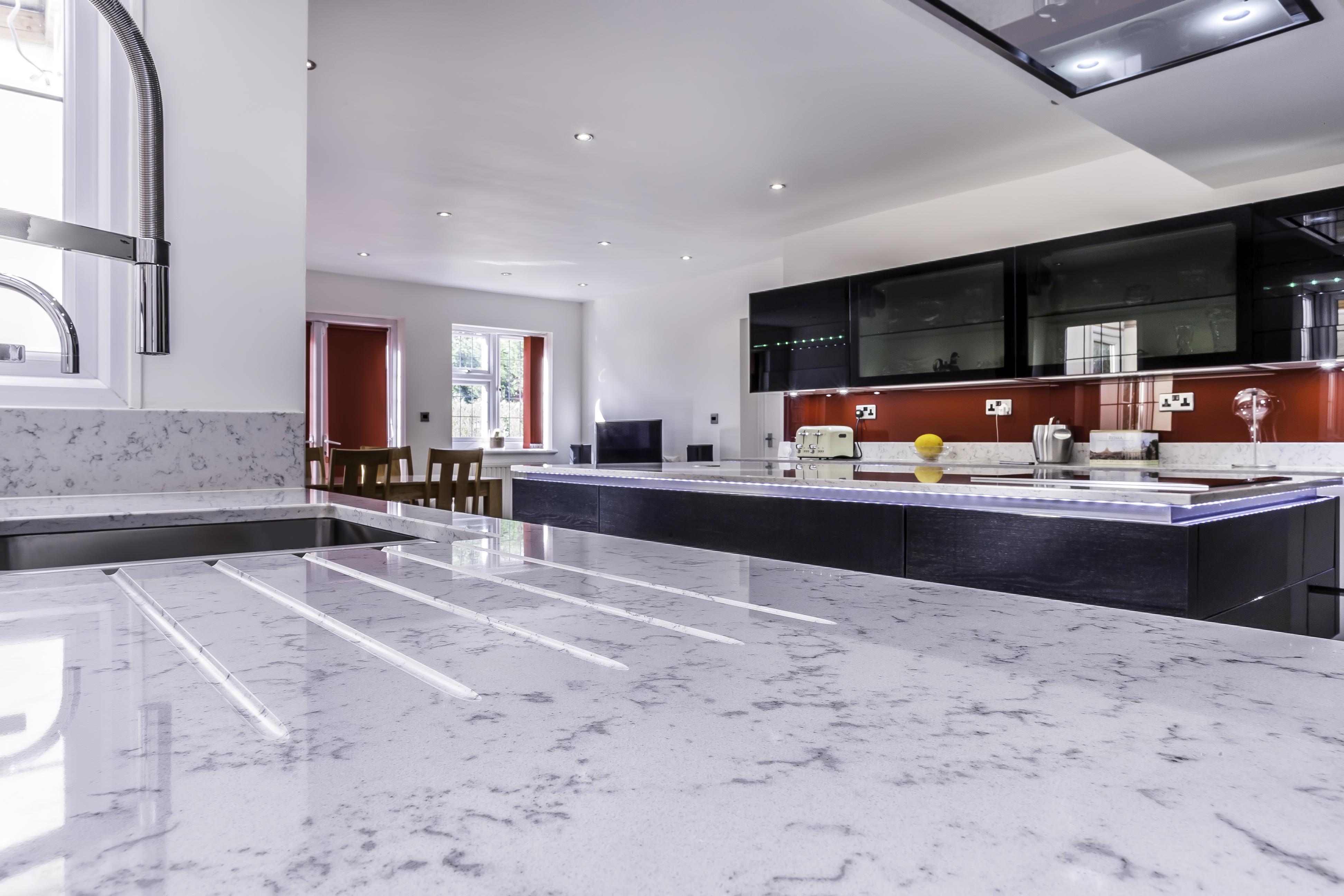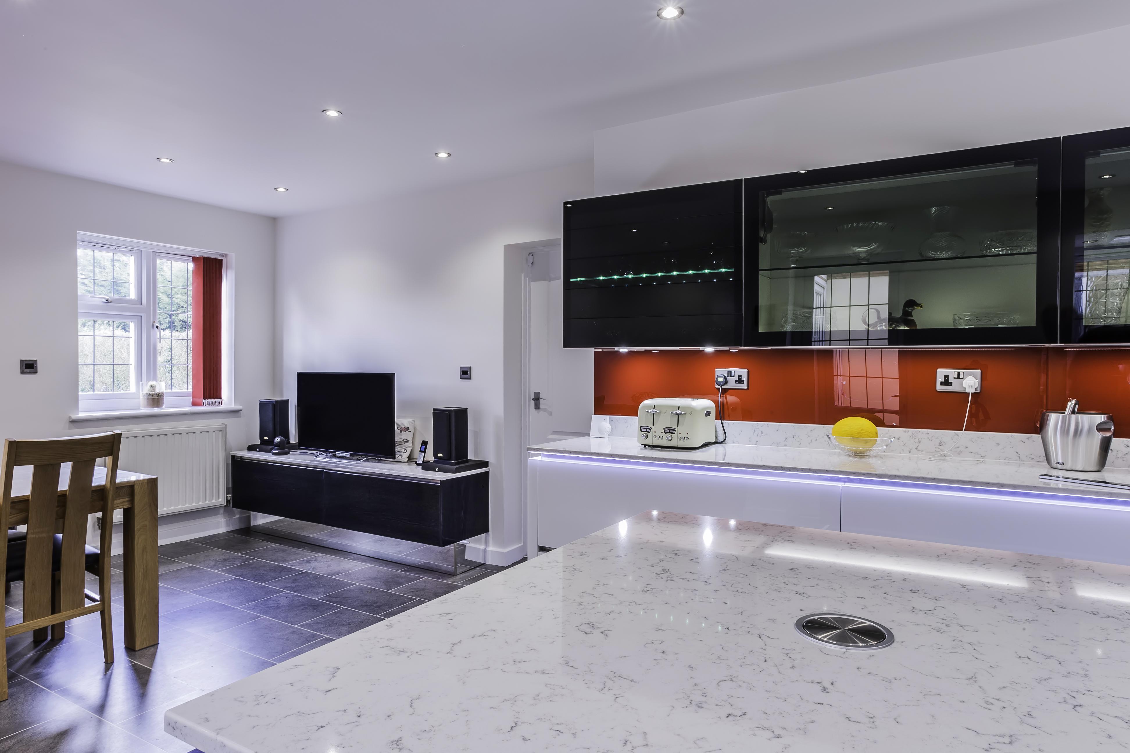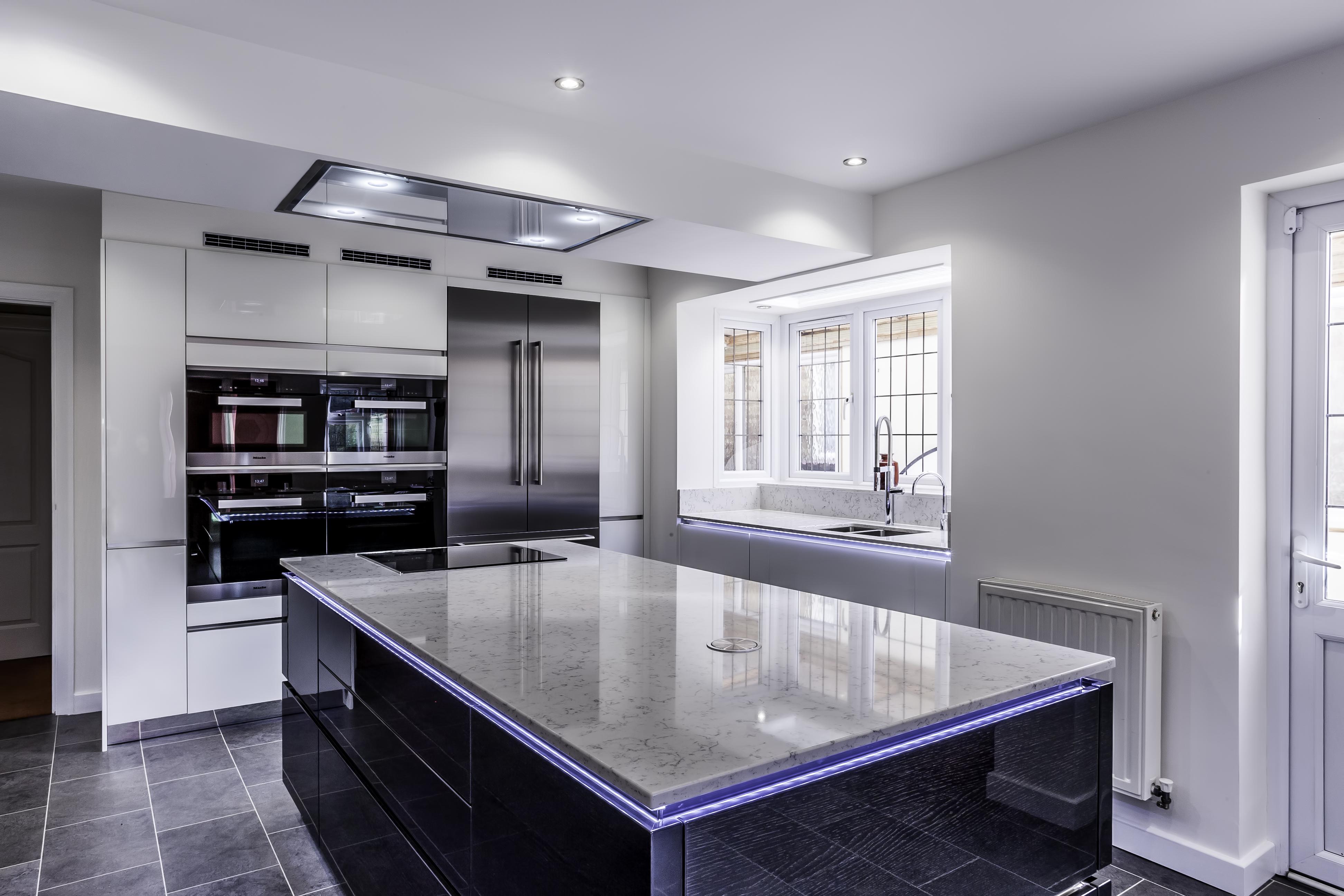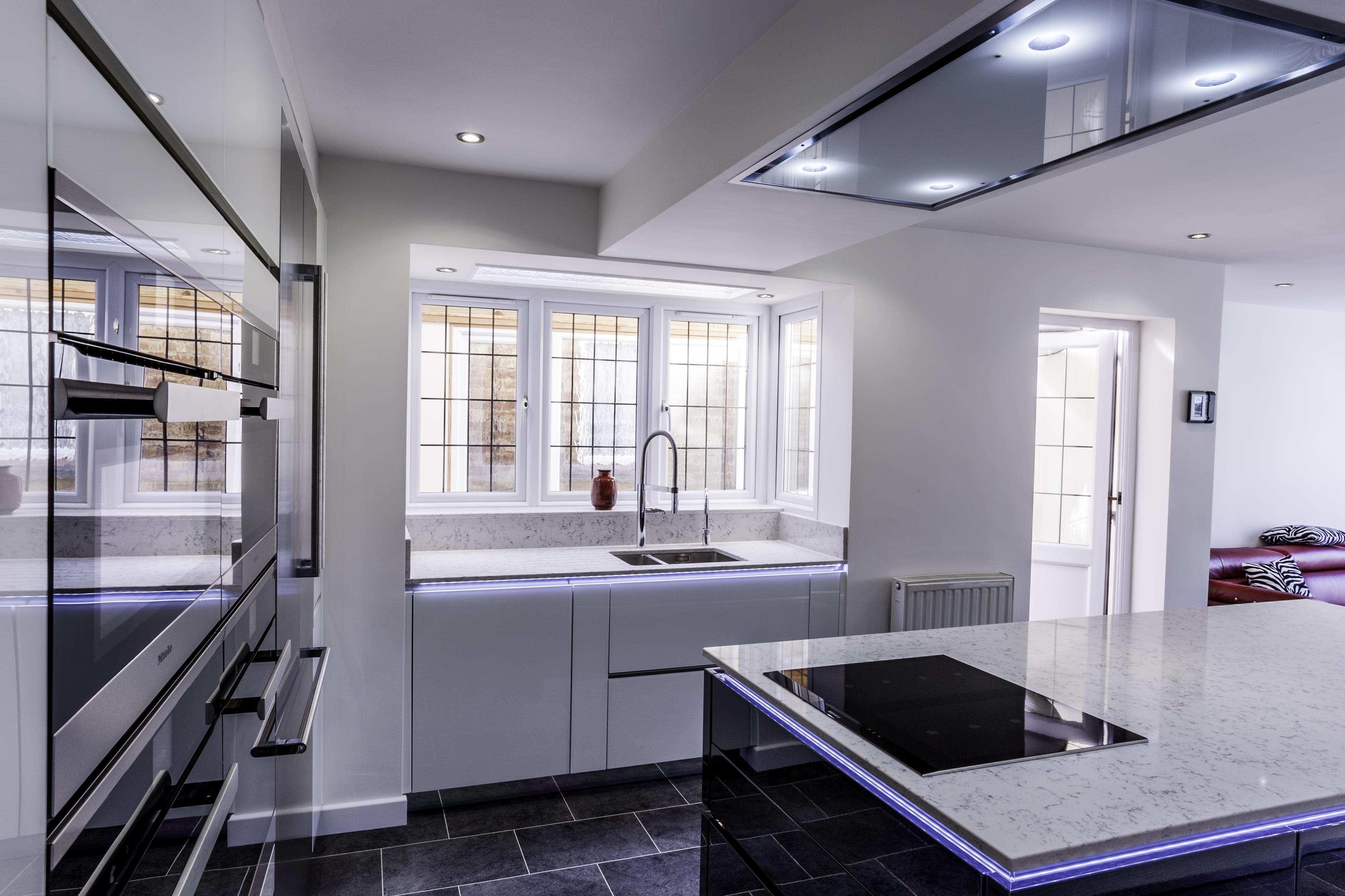The different types of lighting in this kitchen help to set an atmospheric mood, from the handle trim lighting to the illuminated glass cupboards. The mix of glazed units have been used to break up the solid cabinetry, with black glass doors in the centre and electric glass ‘climbing’ units either side.