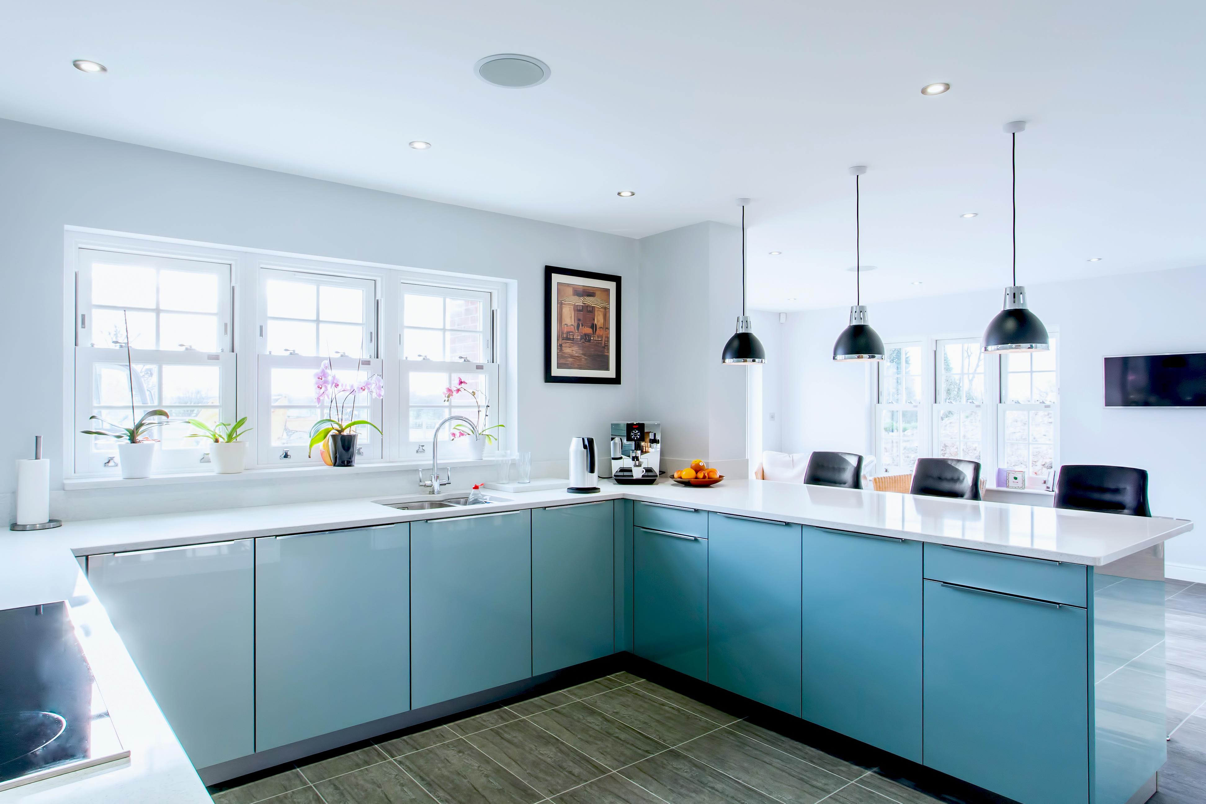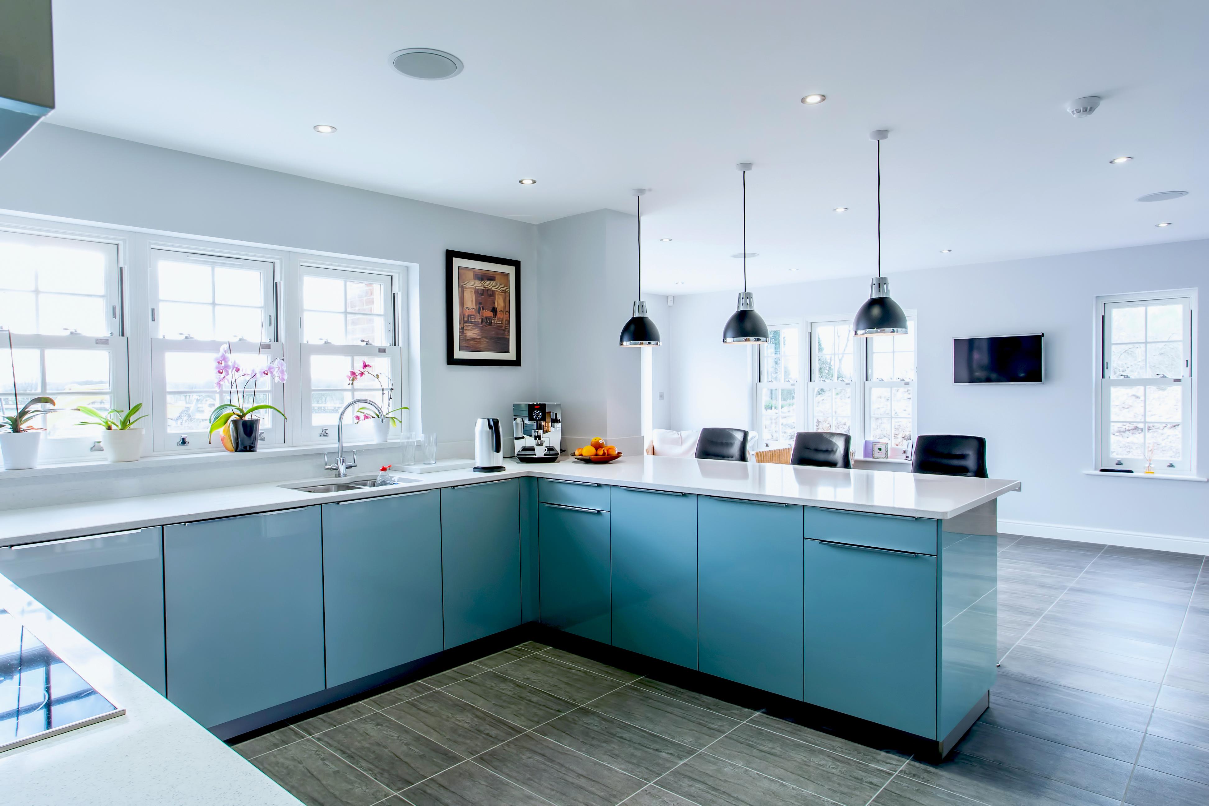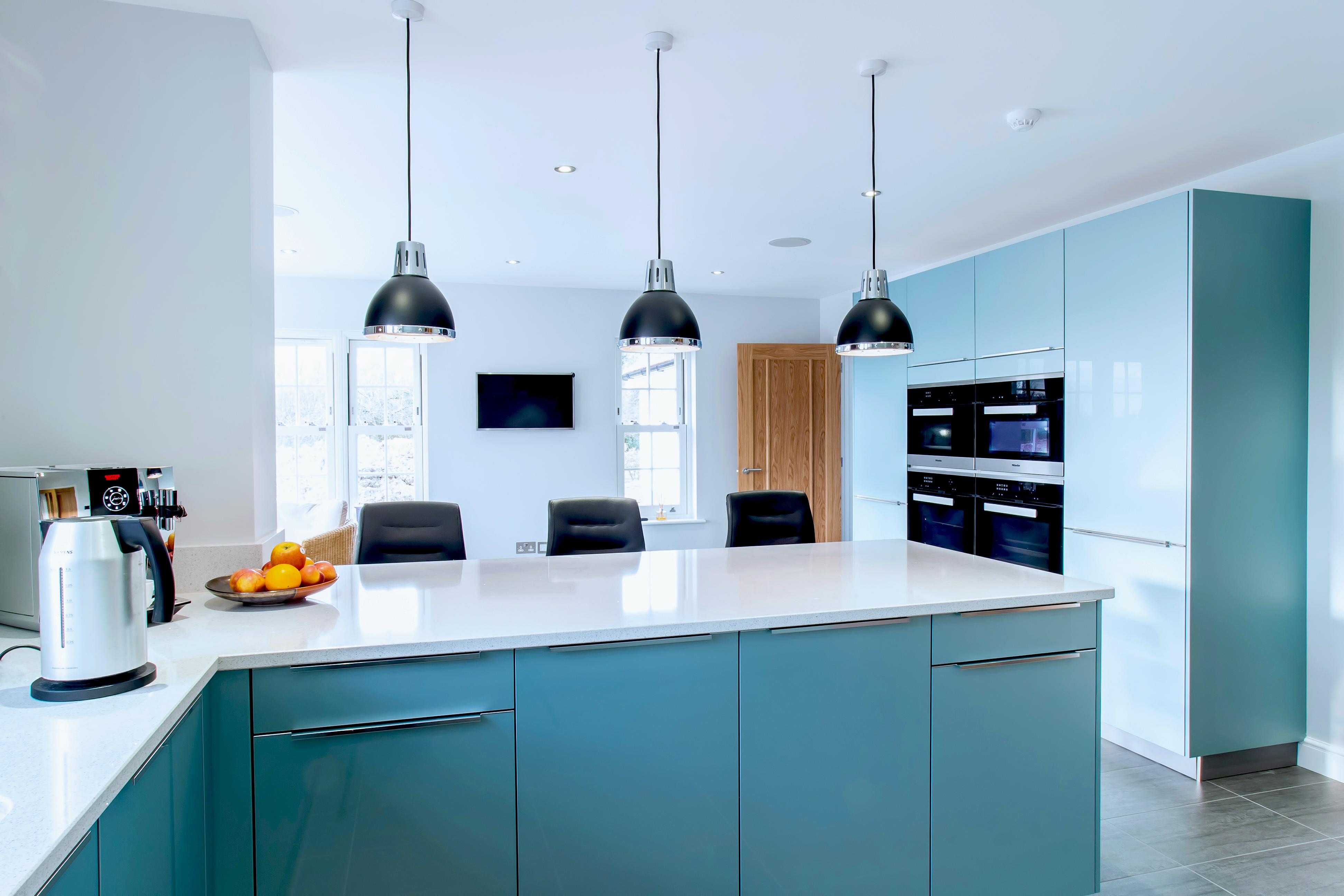 This eye-catching kitchen has been created using a gloss lacquered door in ‘Metallic Ocean Blue’, paired with ‘Speccio White’ quartz worktops, the winning combination for a fresh, clean design.