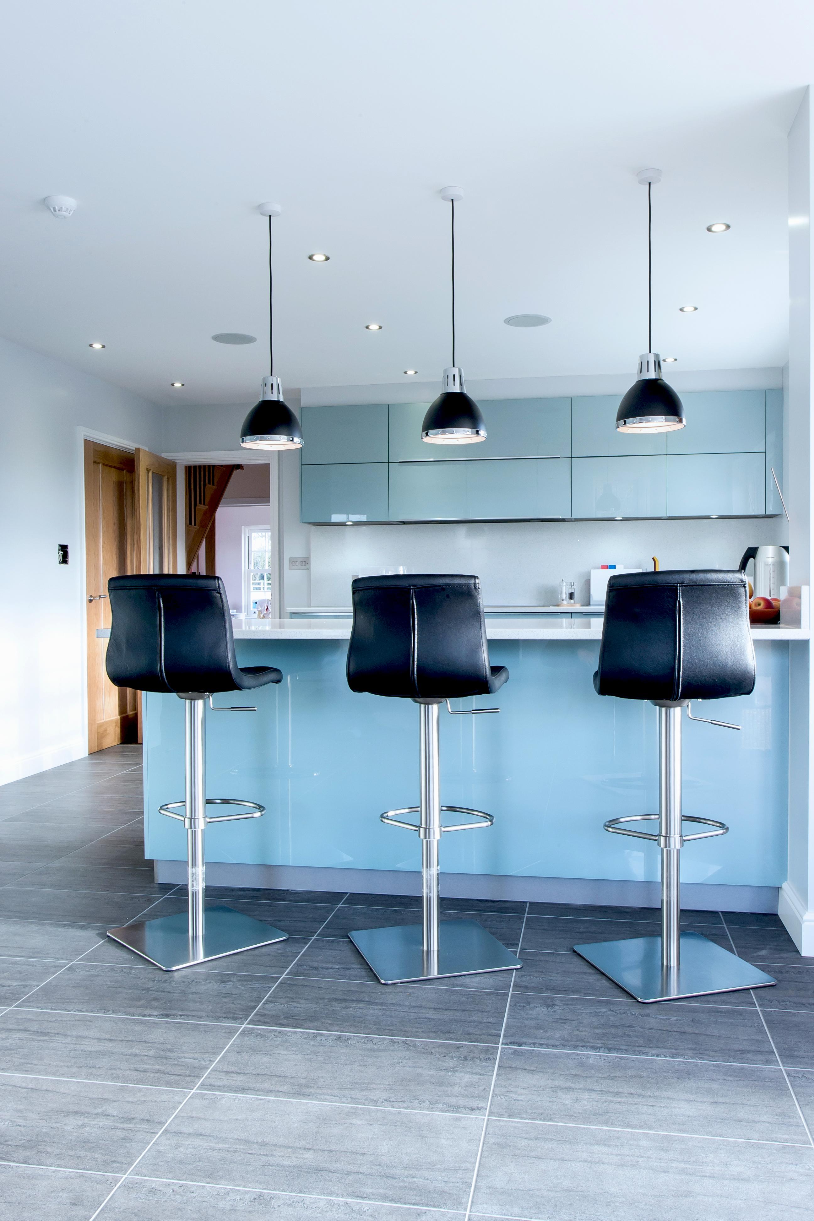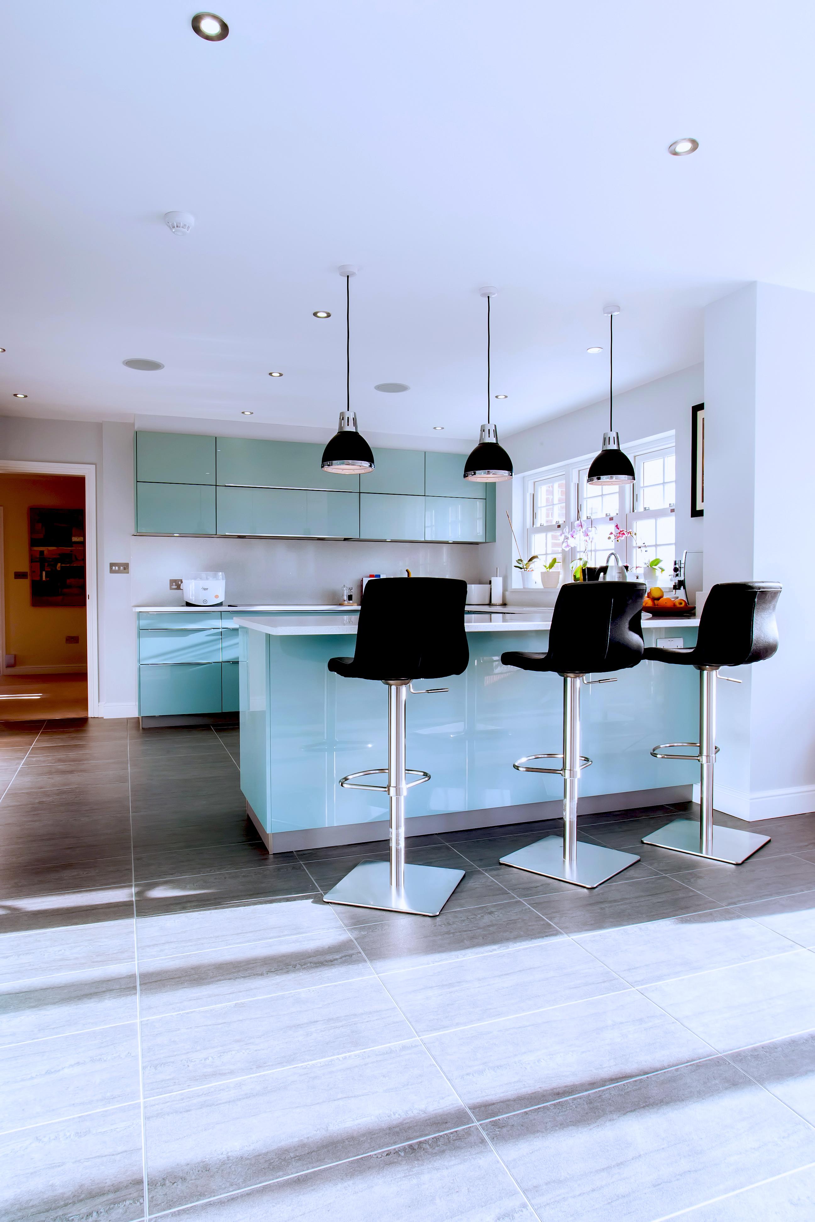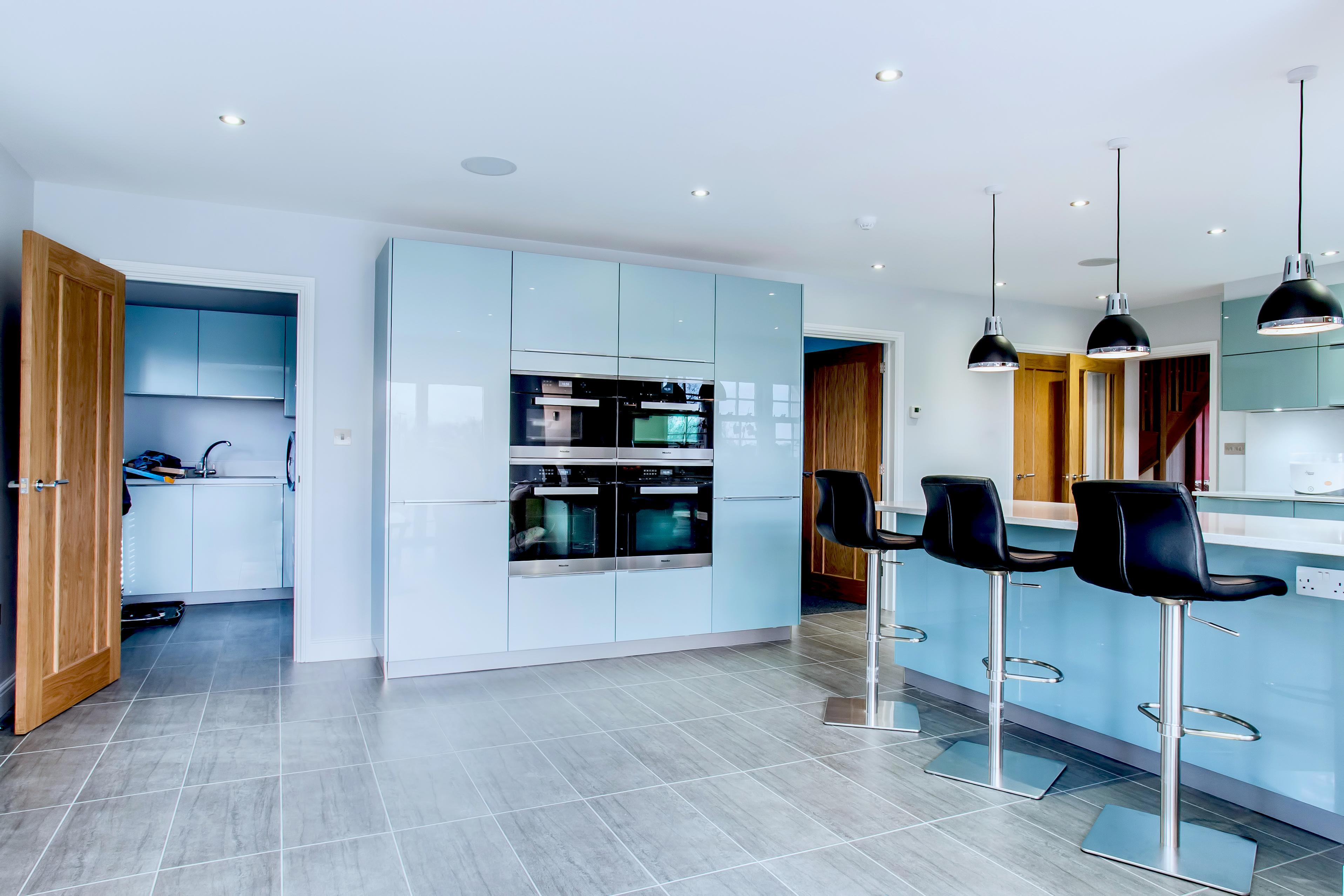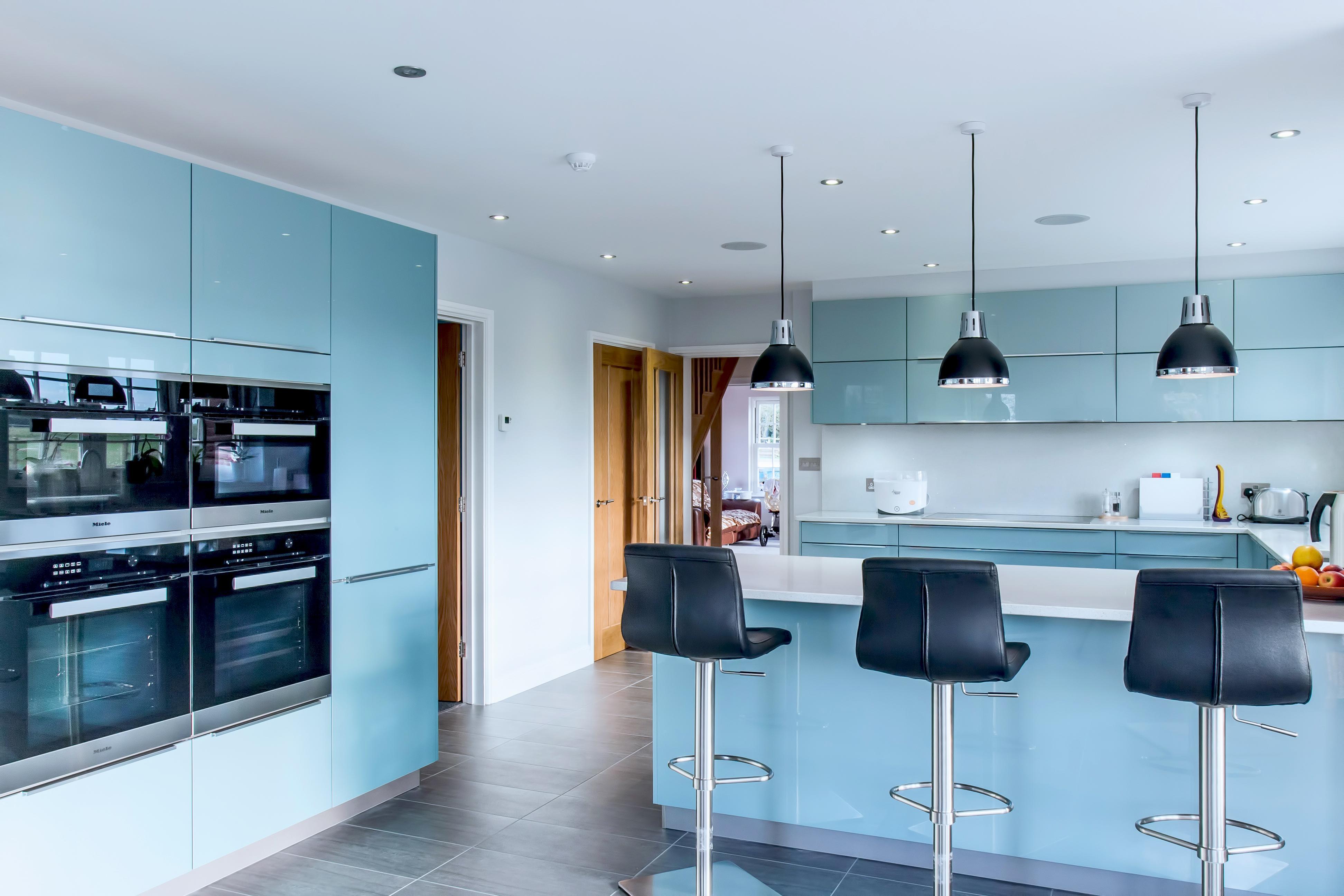 This eye-catching kitchen has been created using a gloss lacquered door in ‘Metallic Ocean Blue’, paired with ‘Speccio White’ quartz worktops, the winning combination for a fresh, clean design.