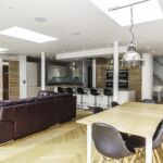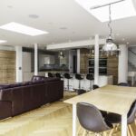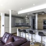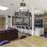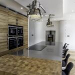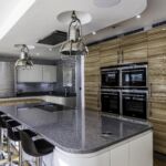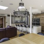 Following the metallic theme, the client has installed stunning pendant search lights over the island and dining table in a chrome finish.