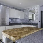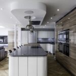 The client opted for white gloss ‘J’ trim units from our English range, combined with a wood effect gloss to blend with and compliment their parquet flooring. The worktop is a grey quartz in ‘Chrome’, which adds a subtle sparkle to the room and blends with the silver wall cladding in the sink area.