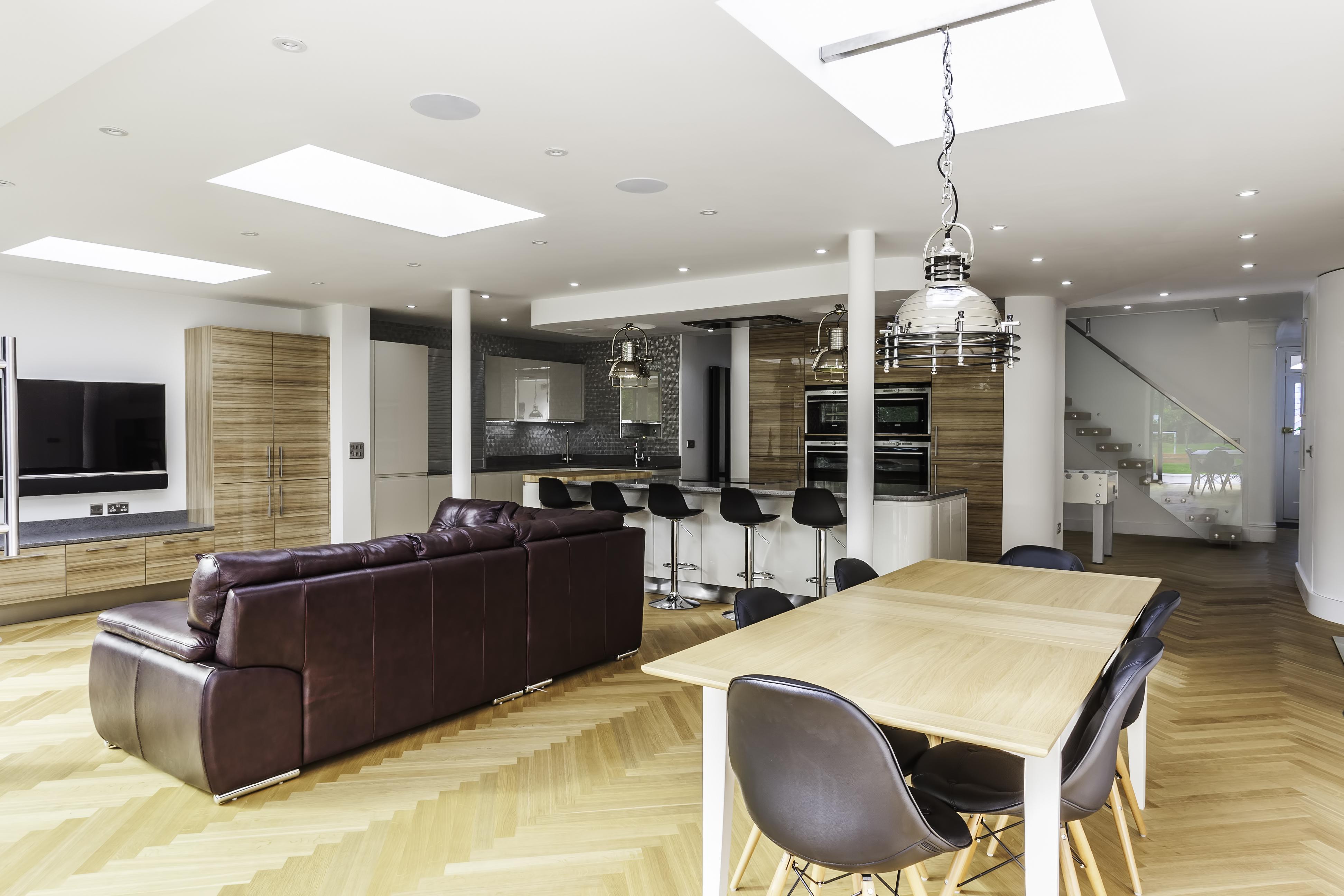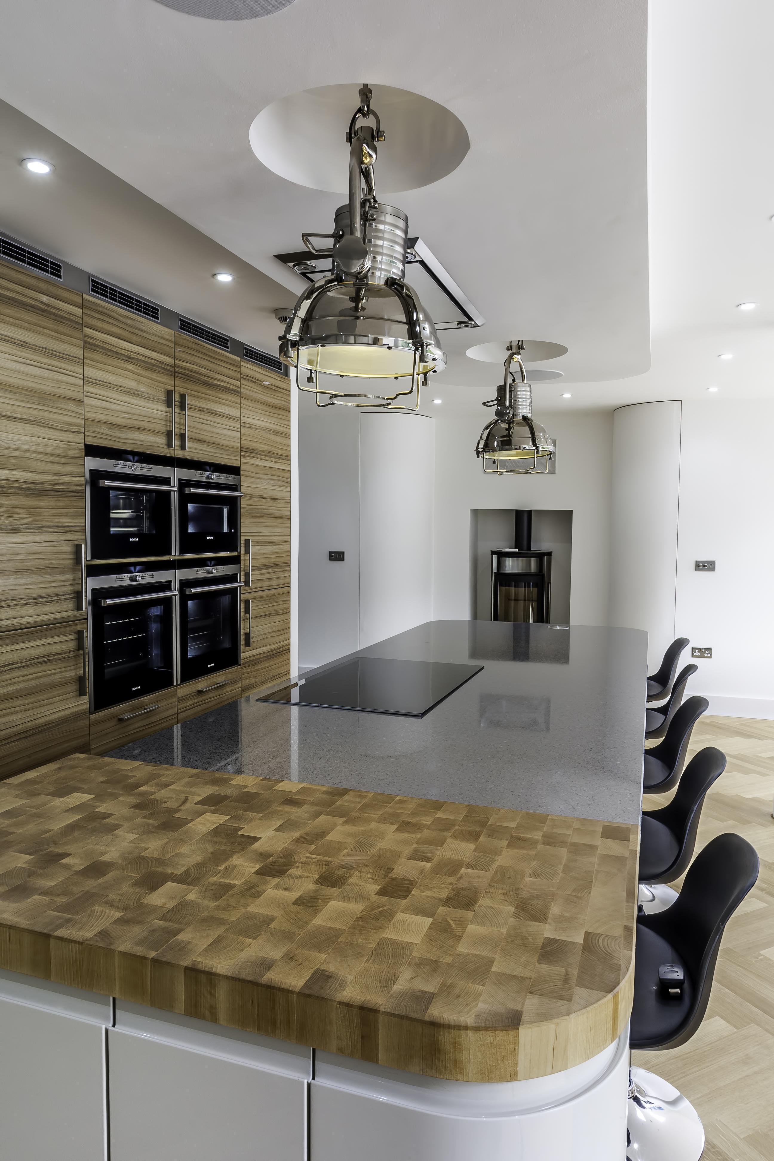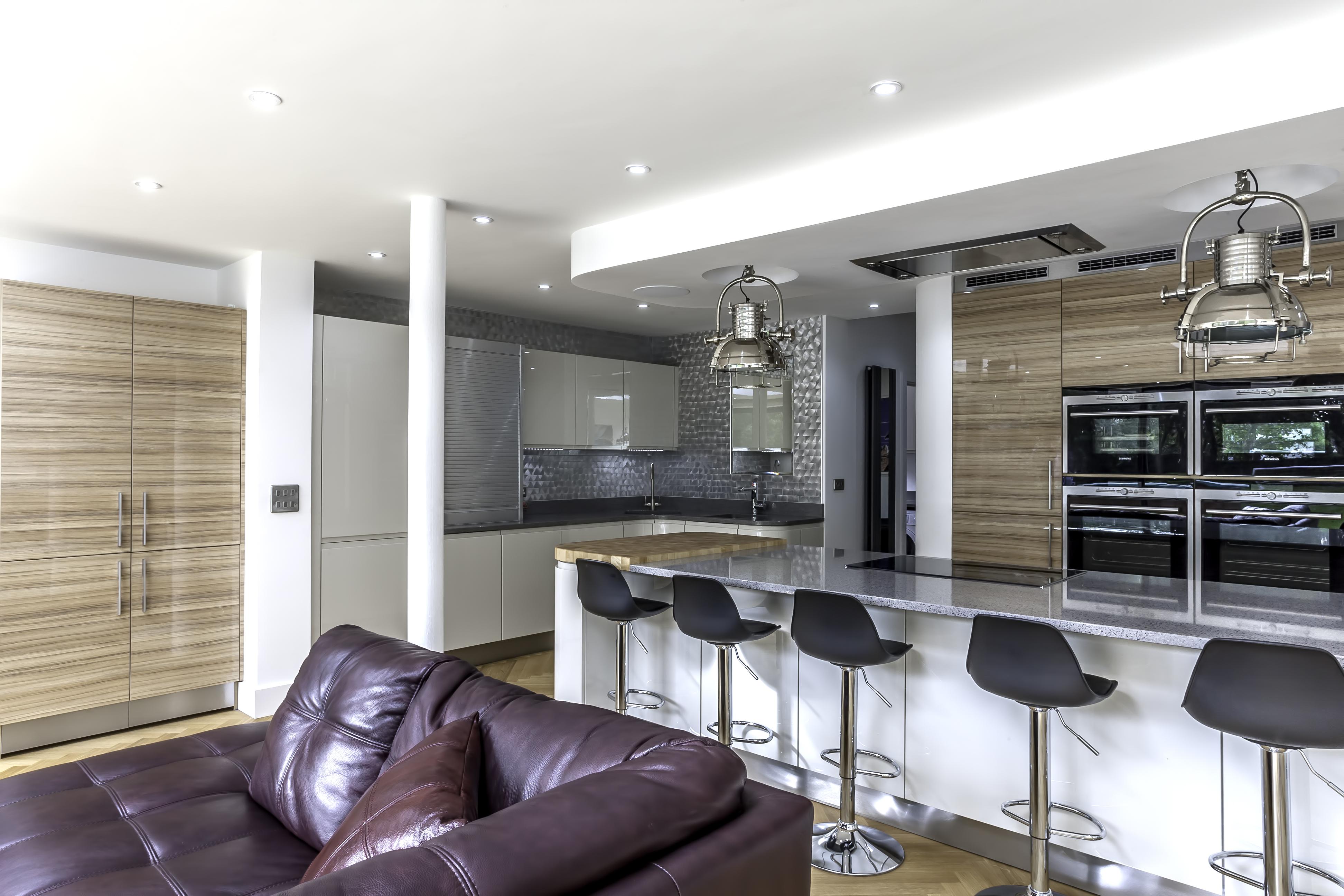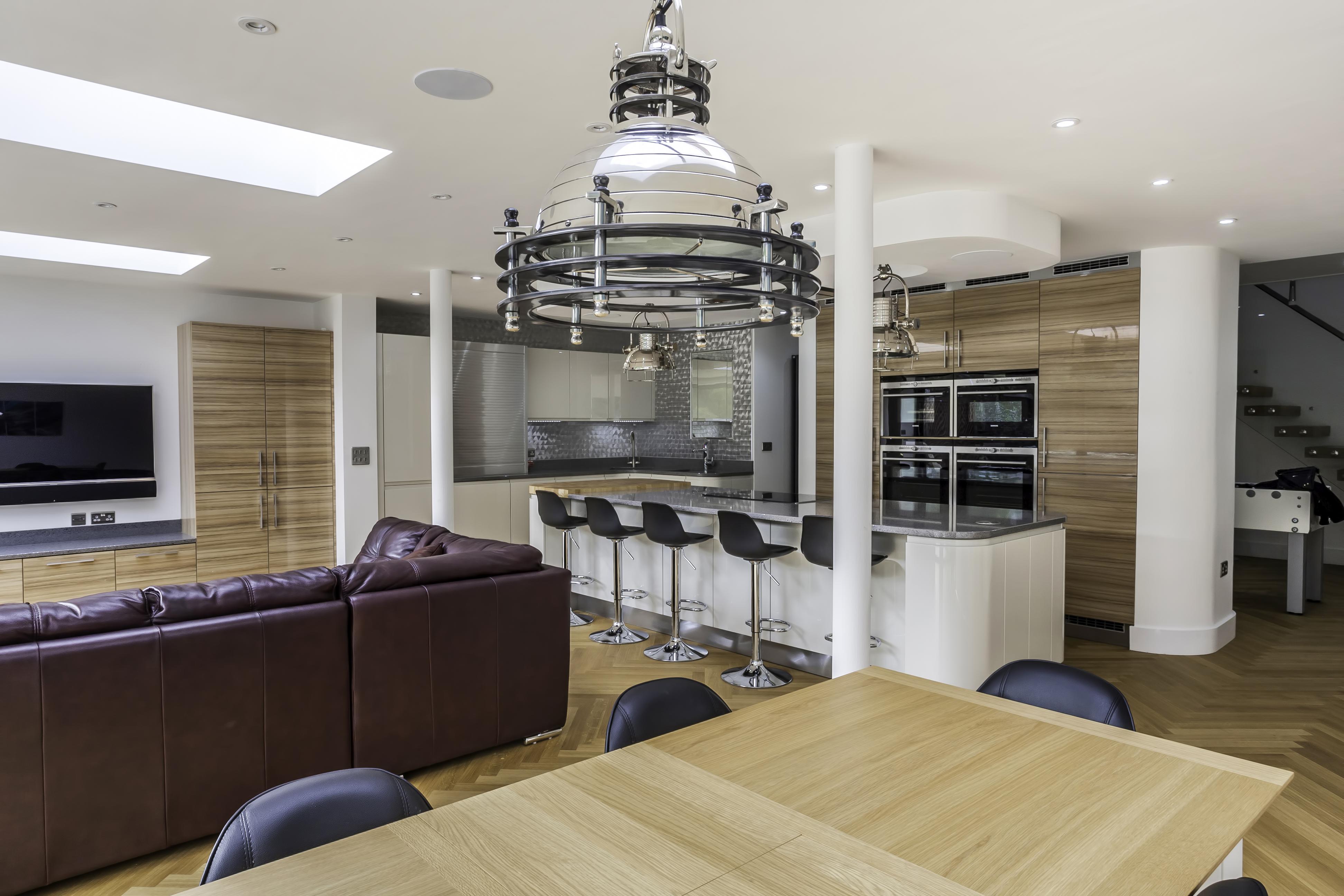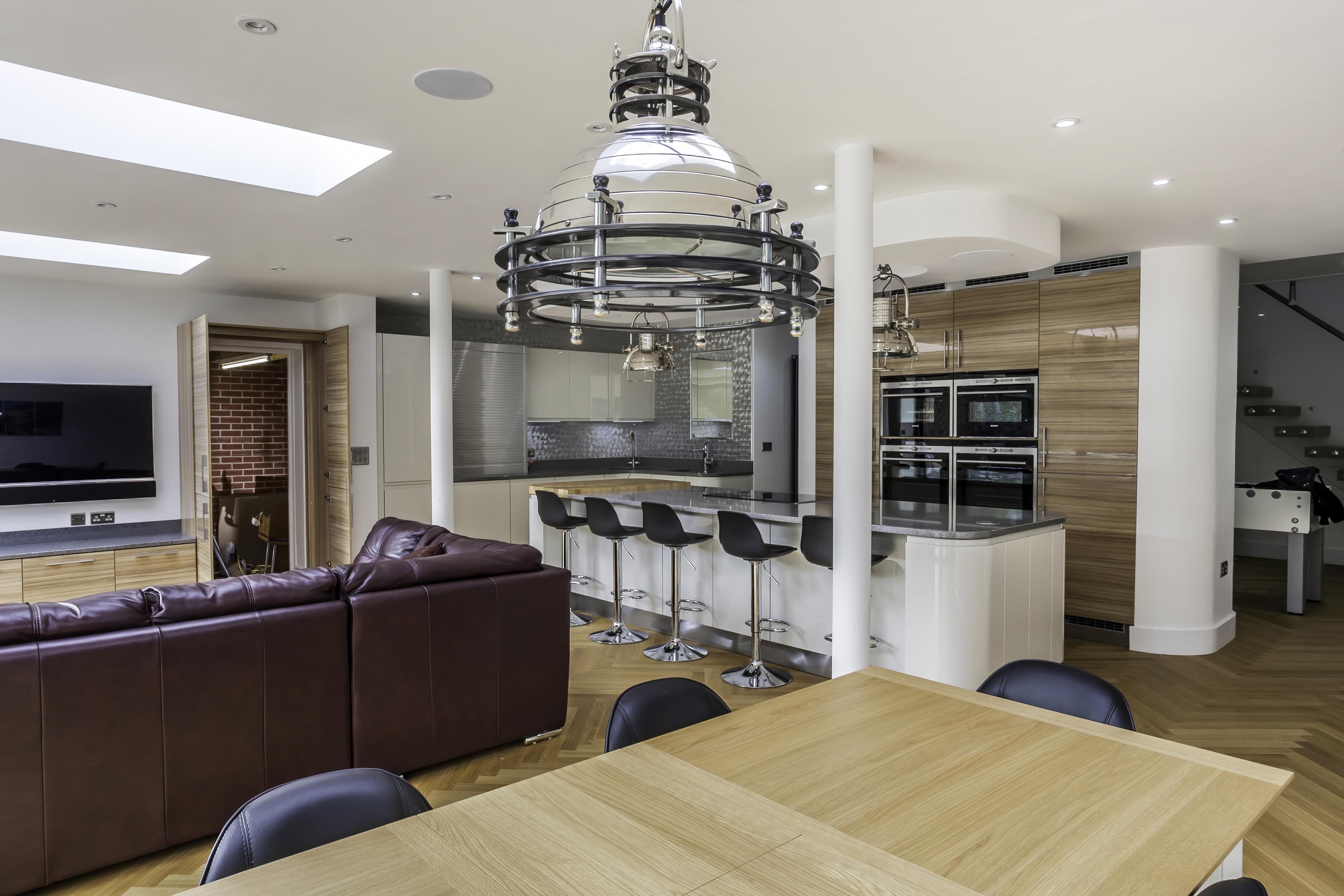 Following the metallic theme, the client has installed stunning pendant search lights over the island and dining table in a chrome finish.