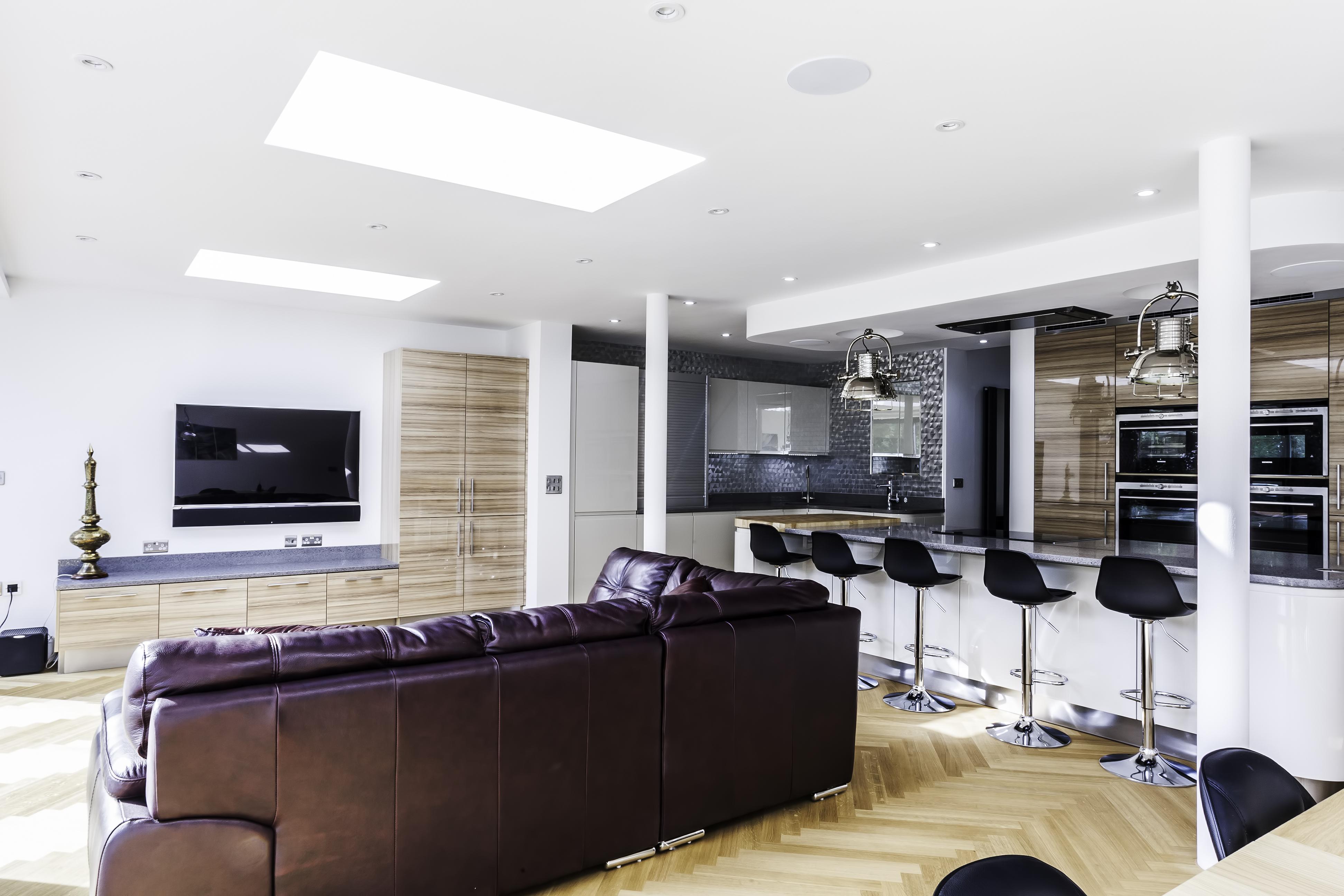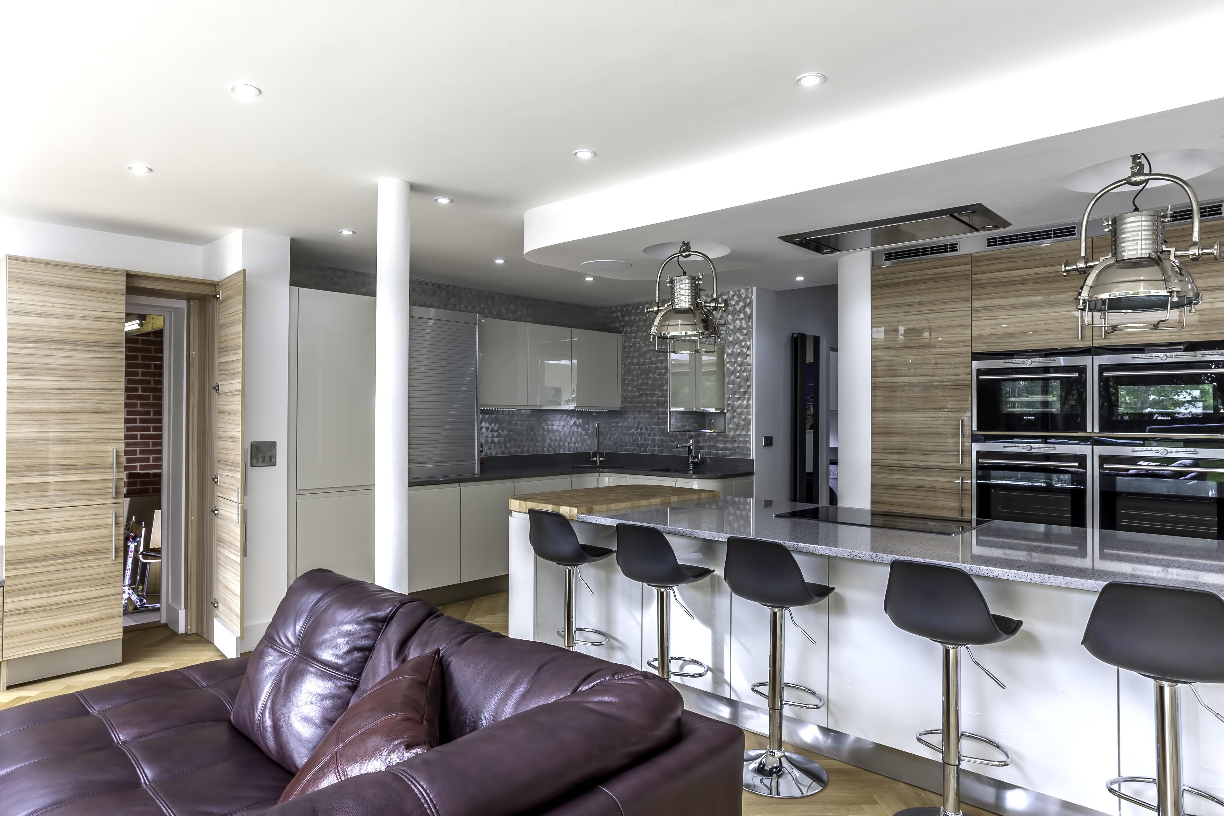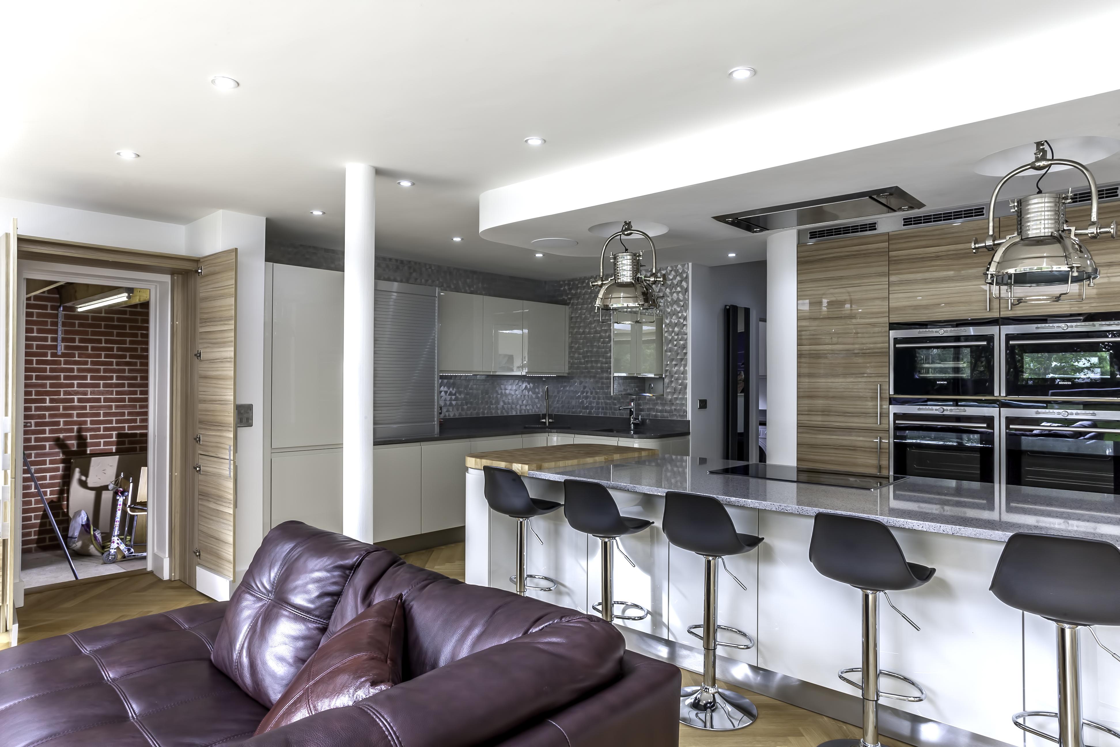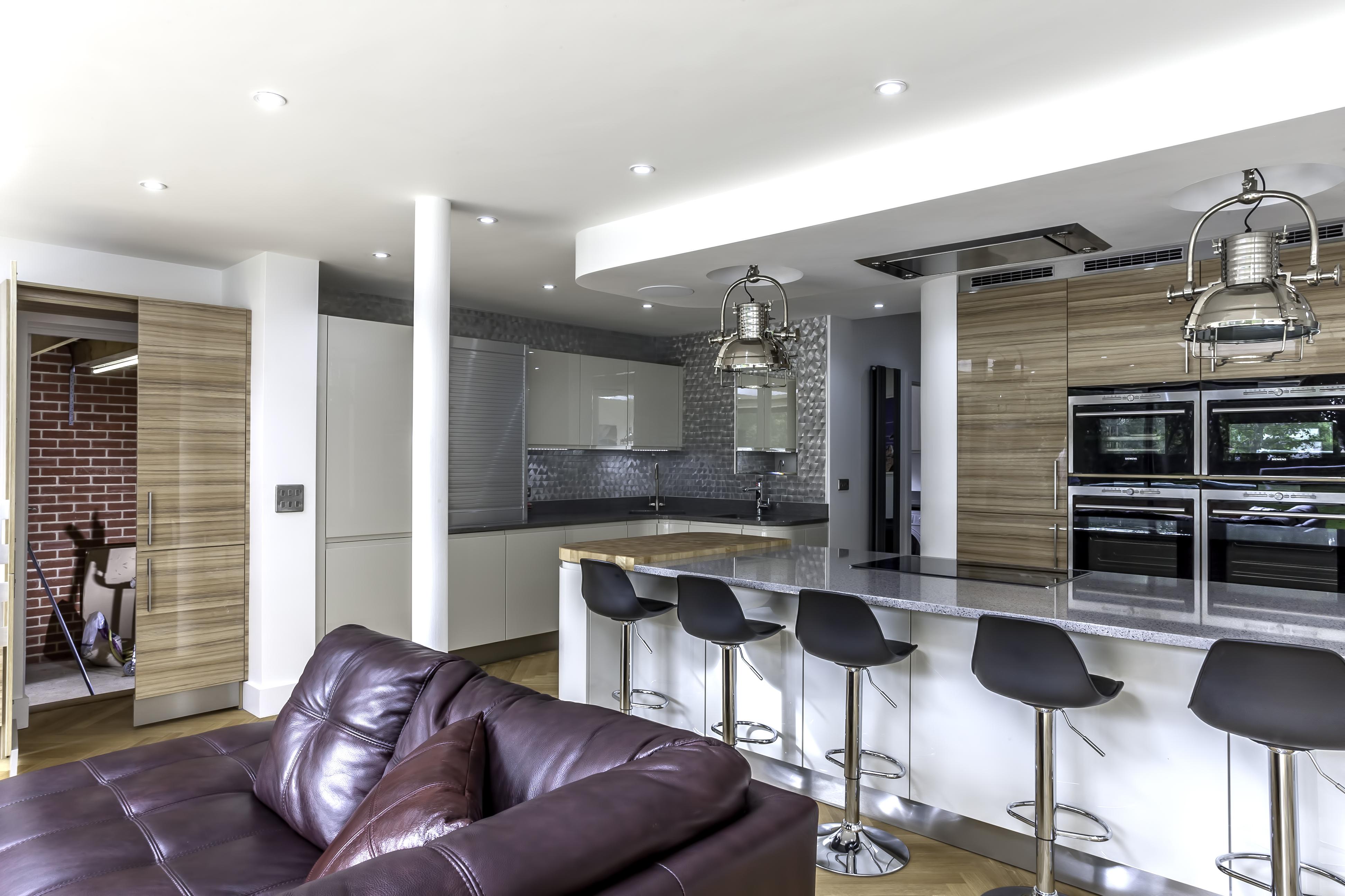 As well as the kitchen, the client wanted us to create a media unit for their TV/lounging space. Our designer, Maxine, used the same finishes as the kitchen to marry the two spaces, she also incorporated a hidden doorway into this area, with the tall cupboard leading to another room.