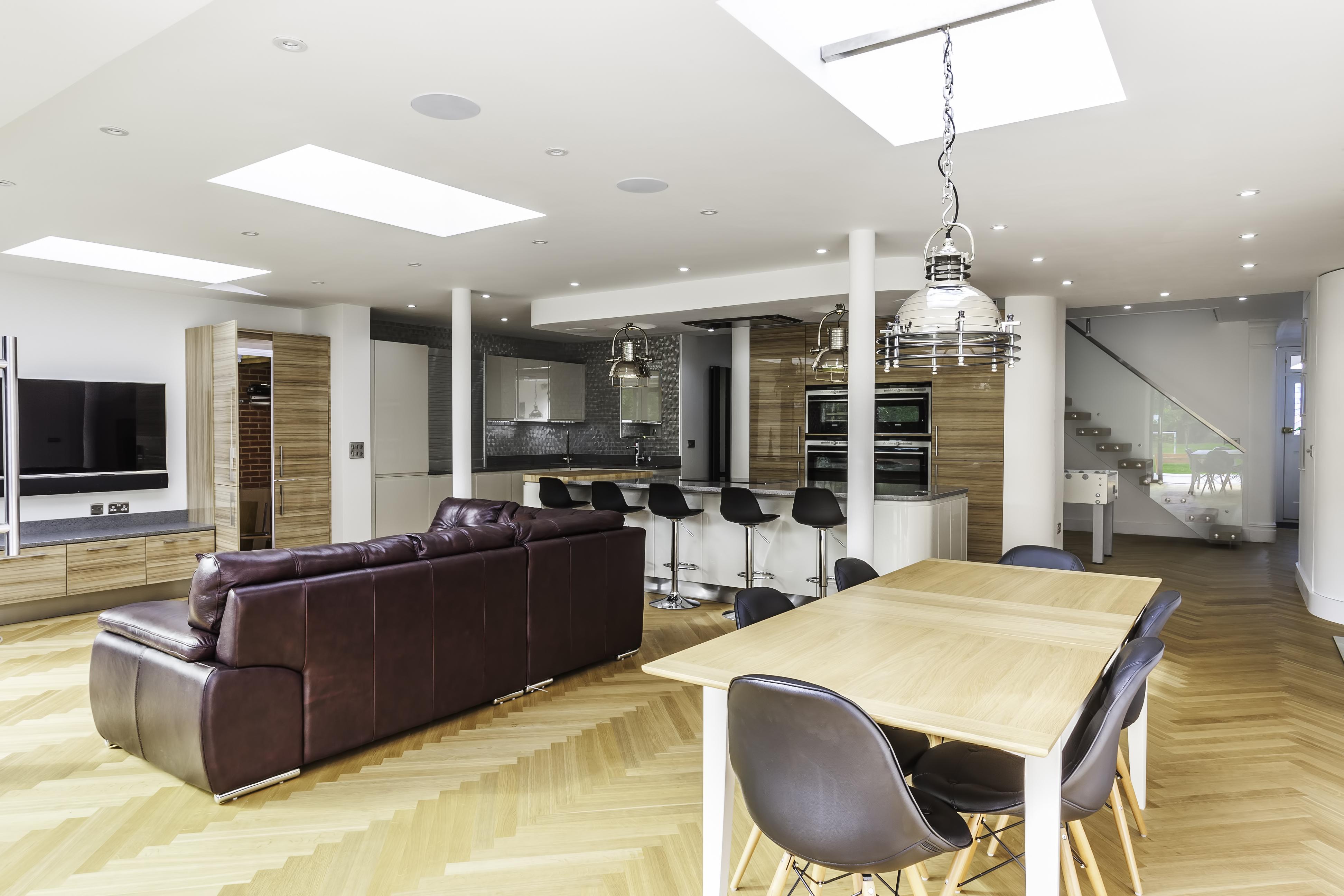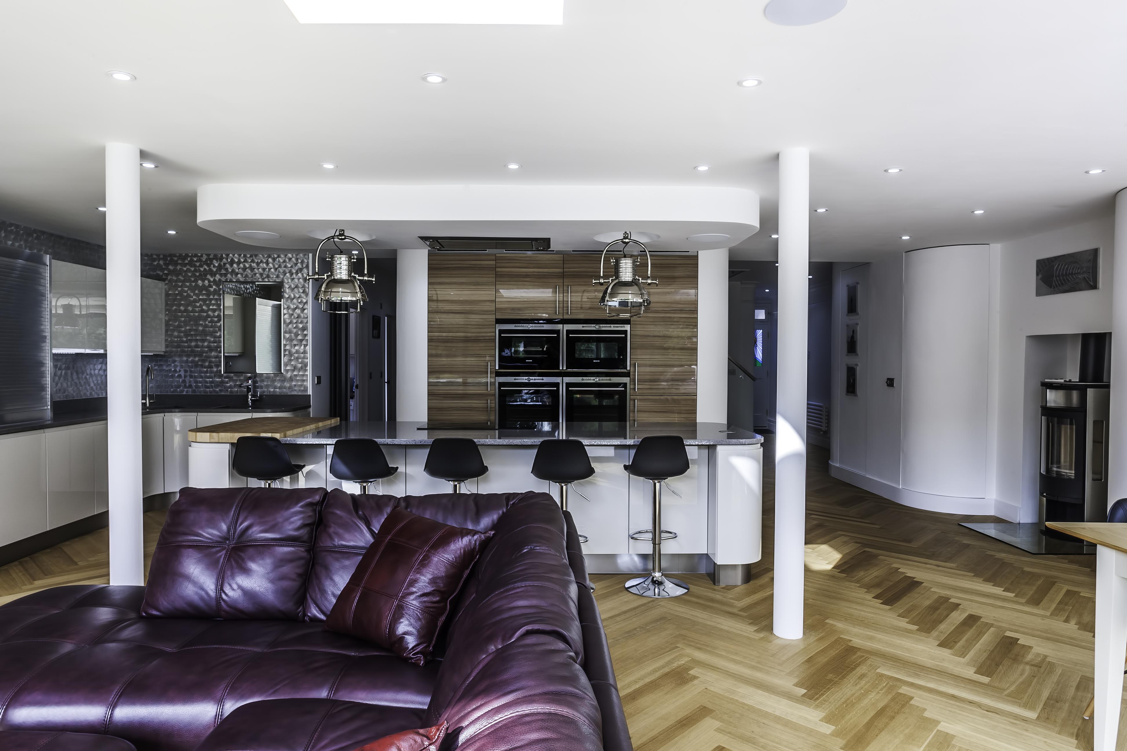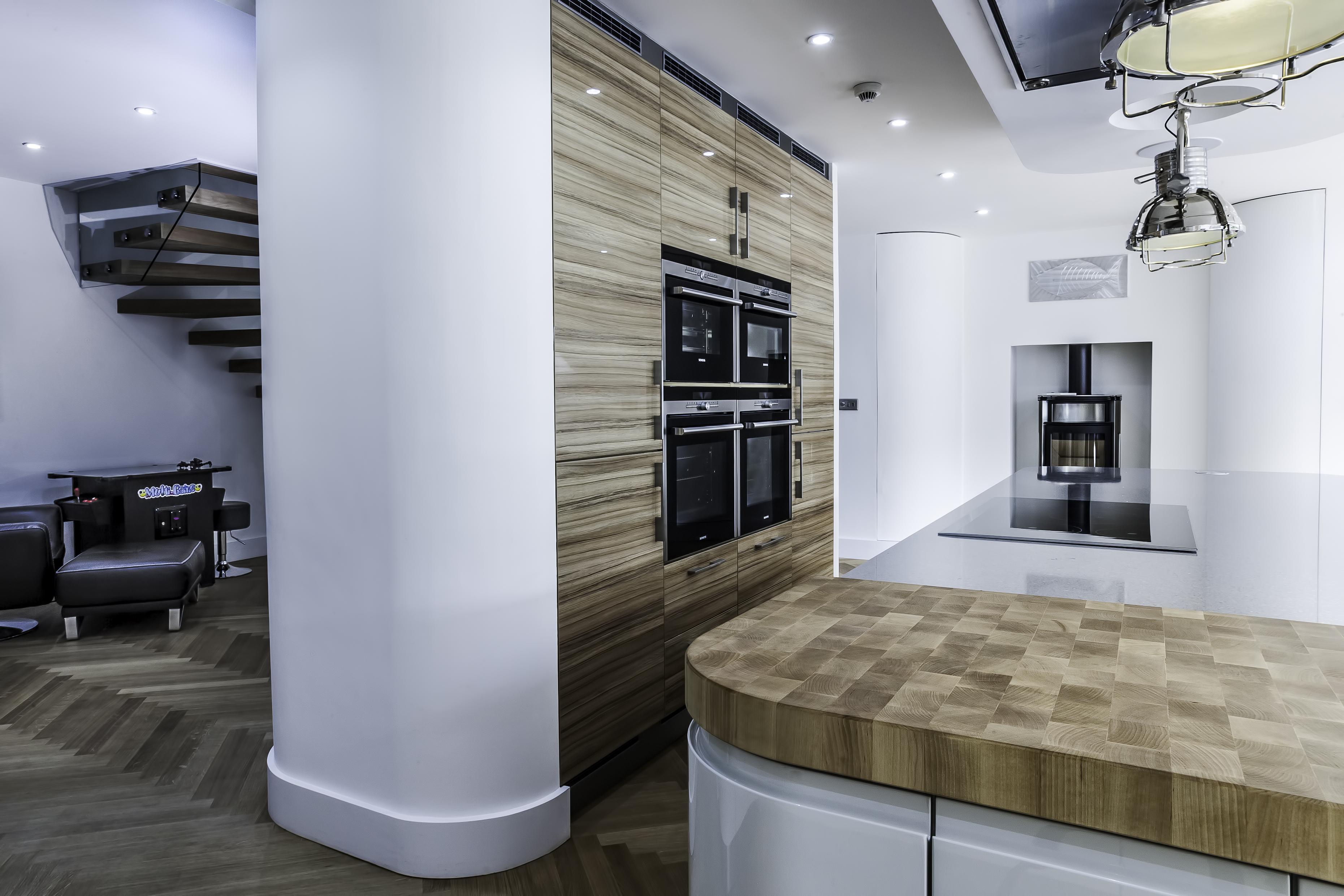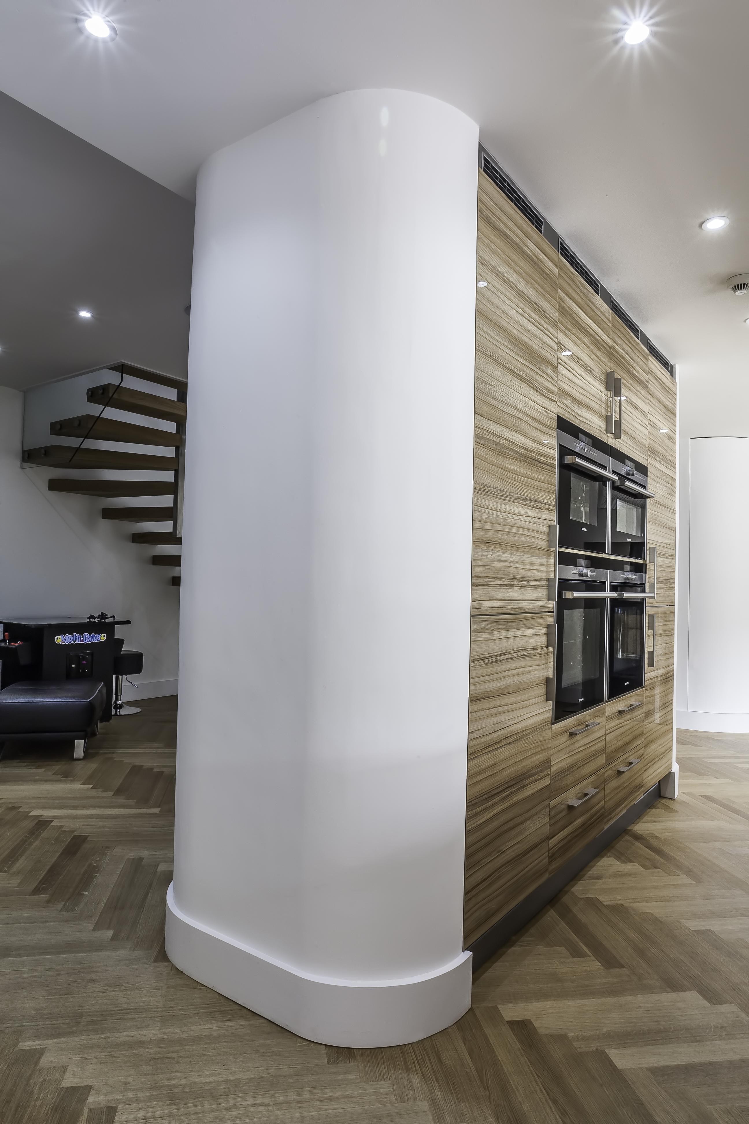 As well as the kitchen, the client wanted us to create a media unit for their TV/lounging space. Our designer, Maxine, used the same finishes as the kitchen to marry the two spaces, she also incorporated a hidden doorway into this area, with the tall cupboard leading to another room.