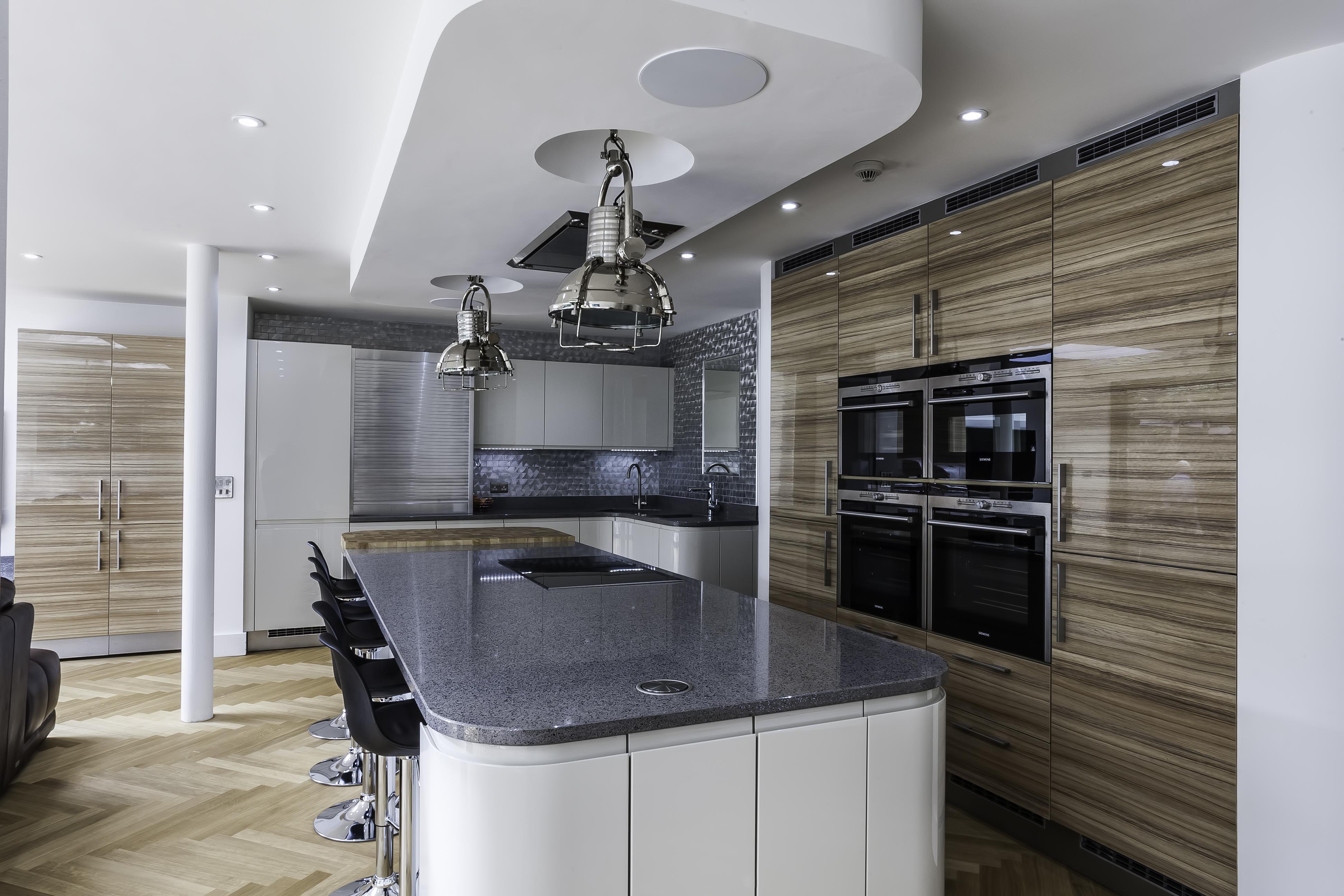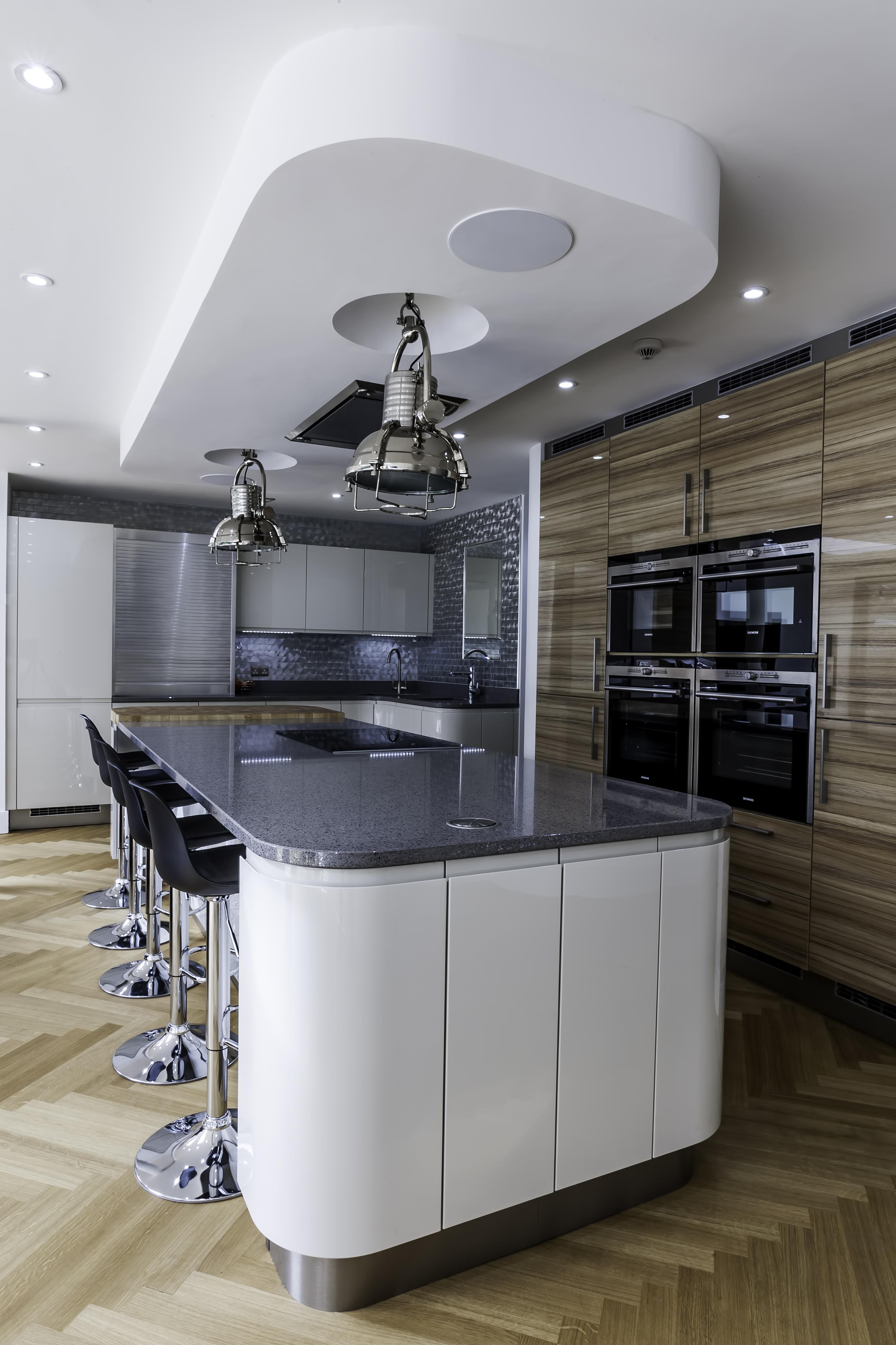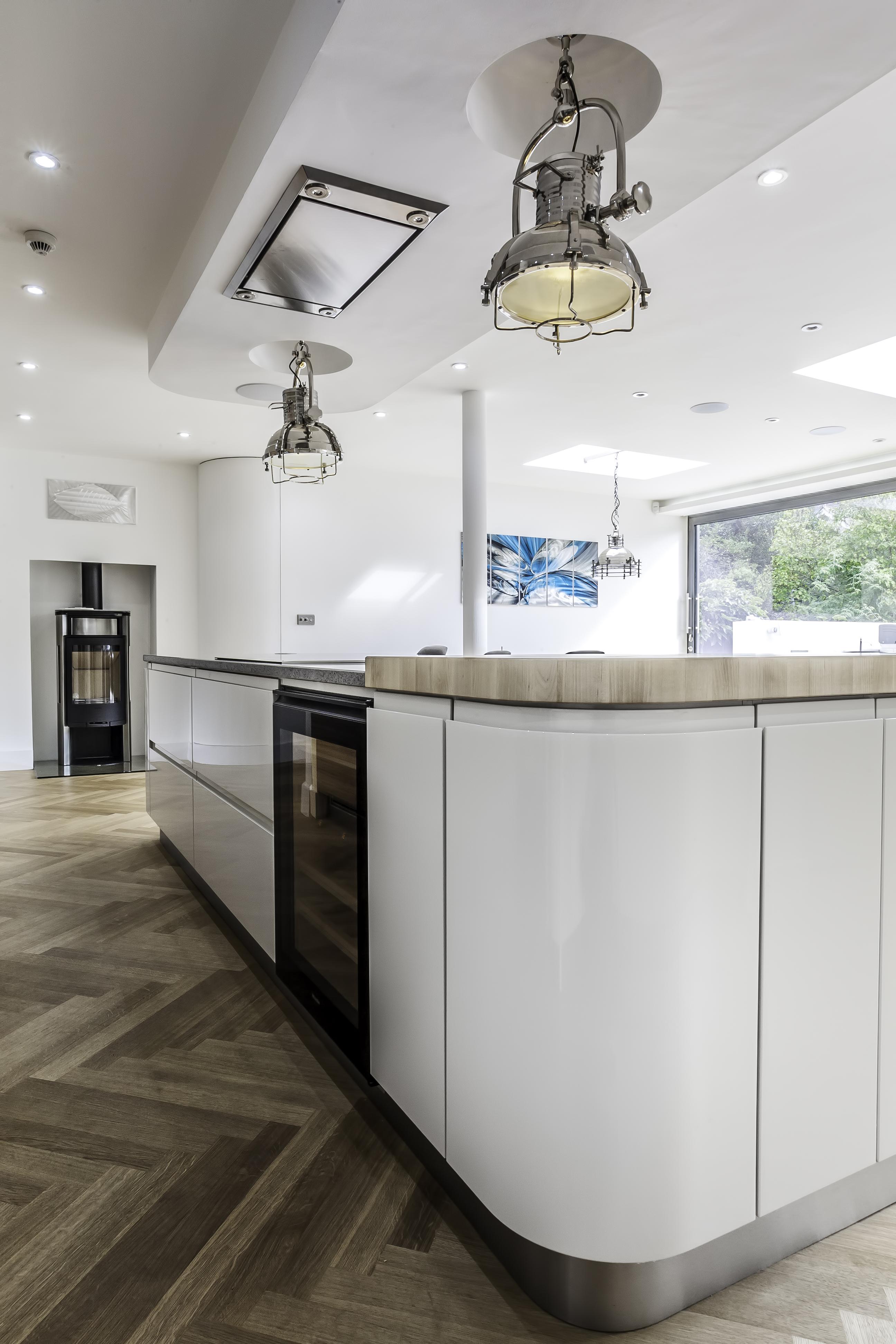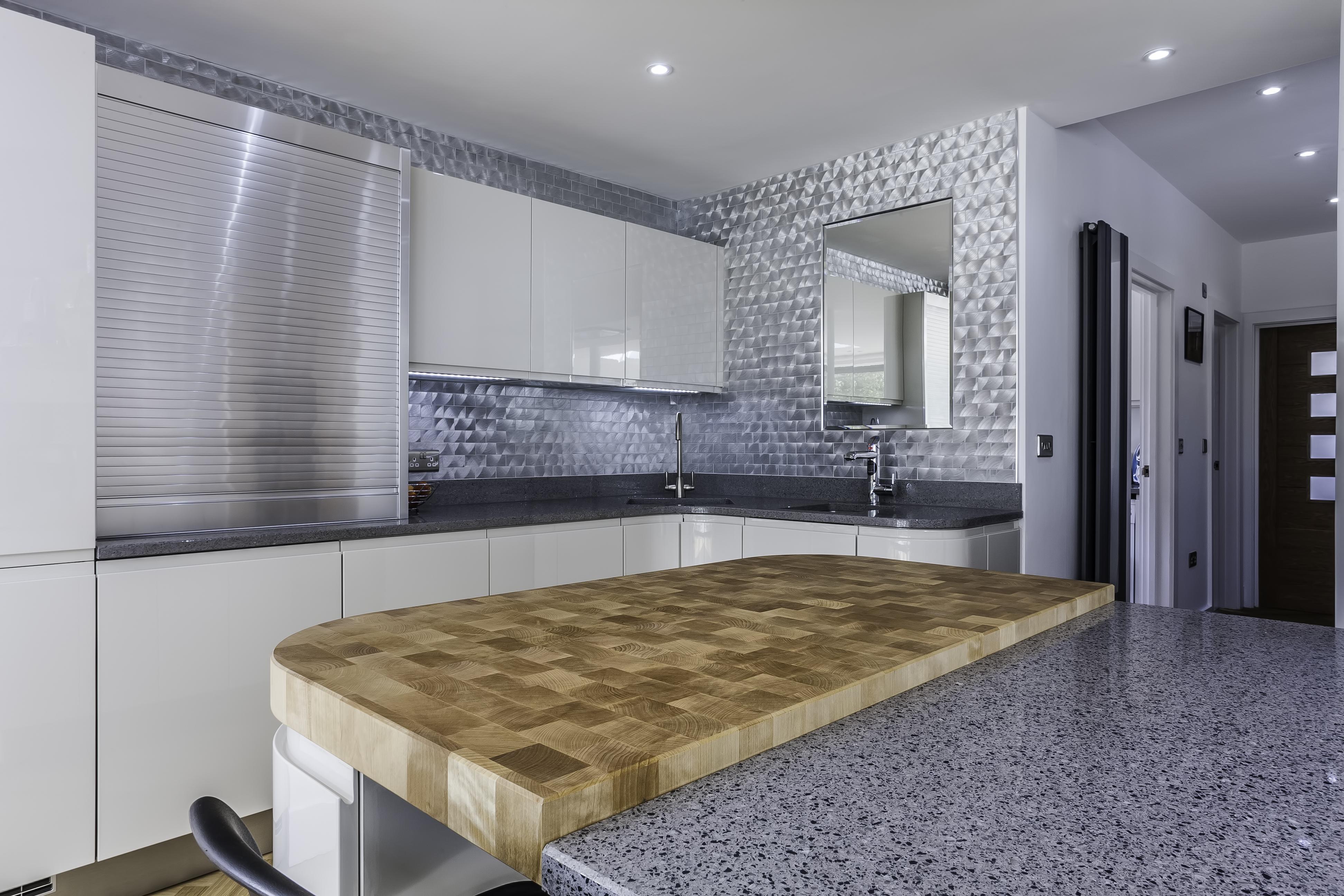 The client opted for white gloss ‘J’ trim units from our English range, combined with a wood effect gloss to blend with and compliment their parquet flooring. The worktop is a grey quartz in ‘Chrome’, which adds a subtle sparkle to the room and blends with the silver wall cladding in the sink area.