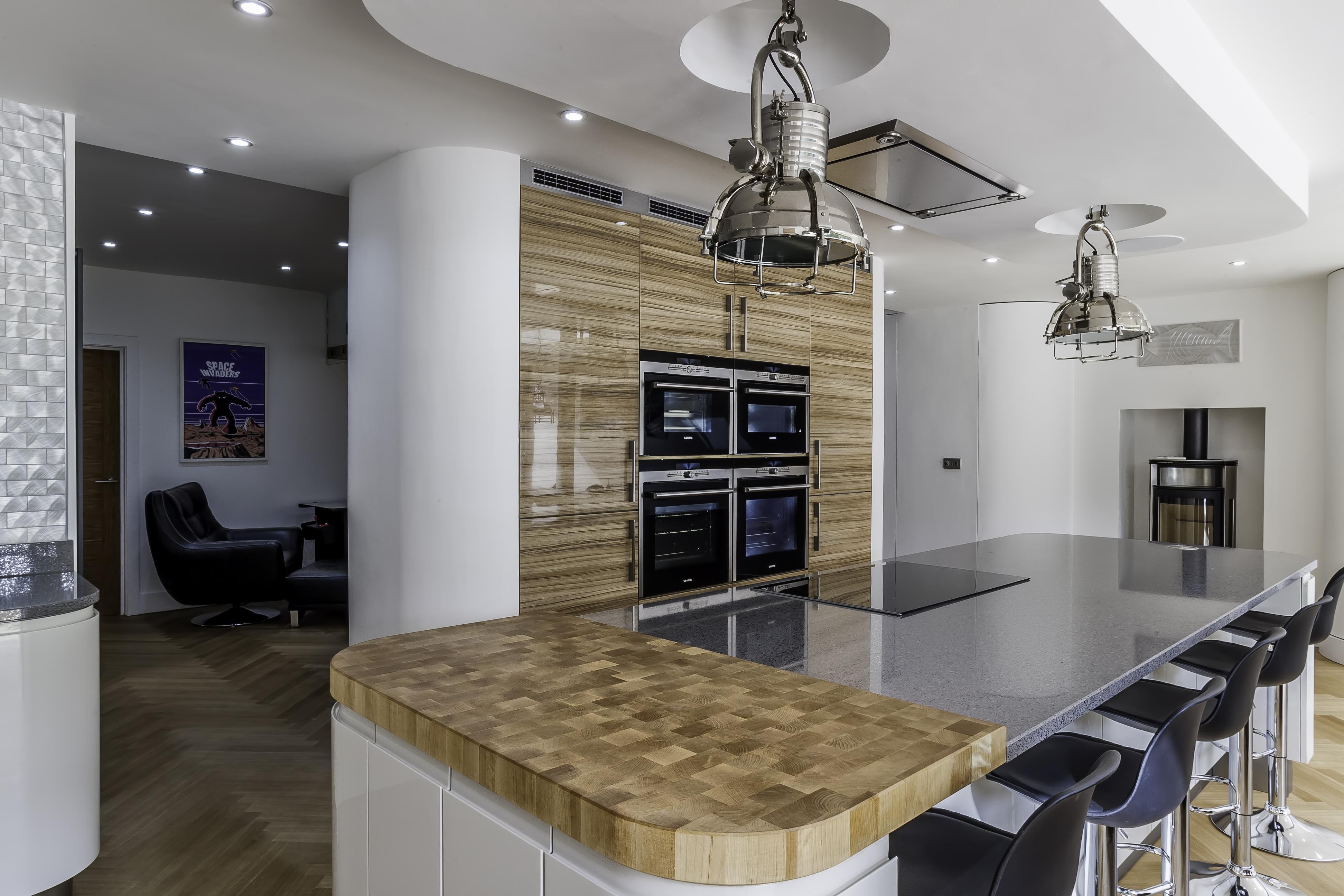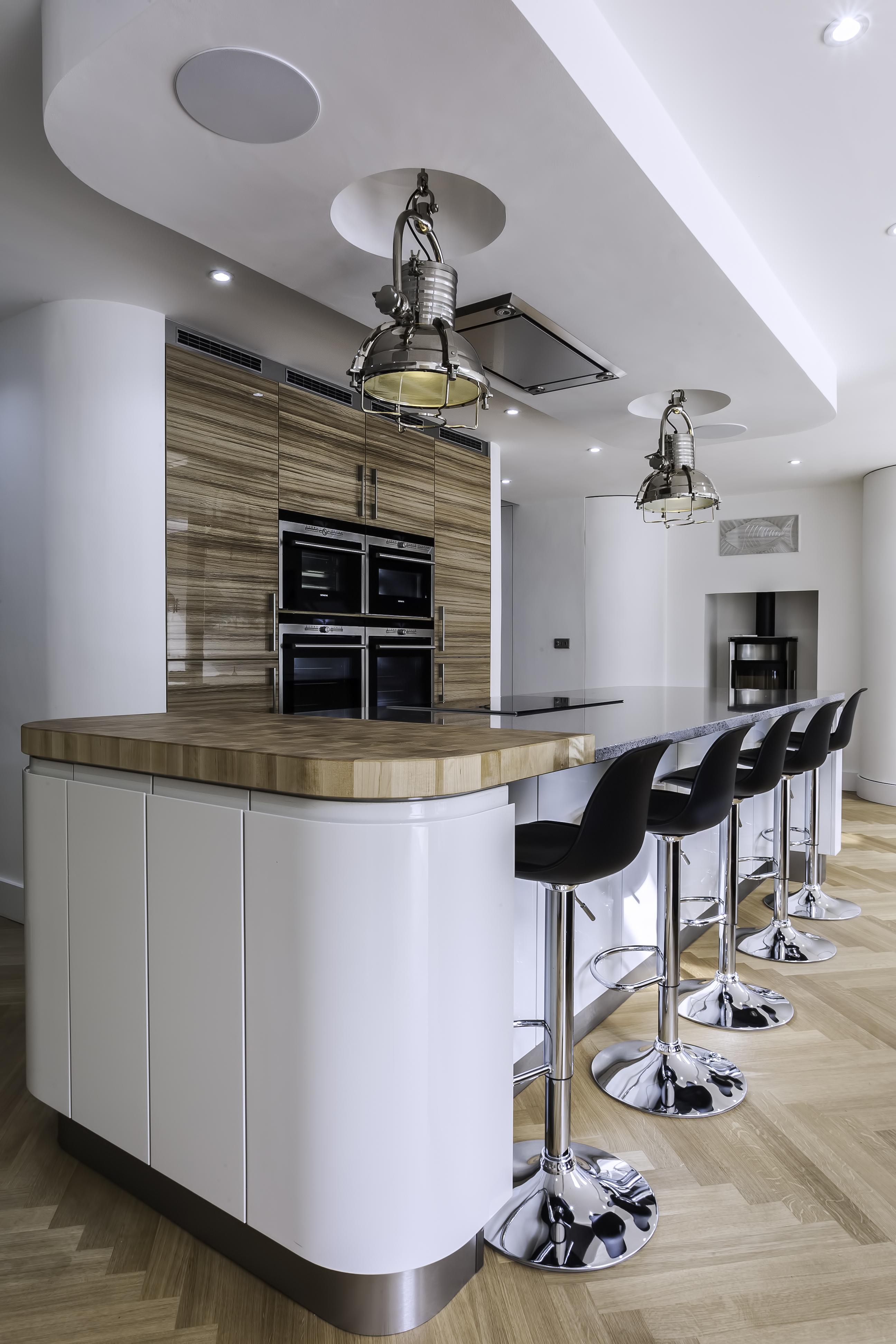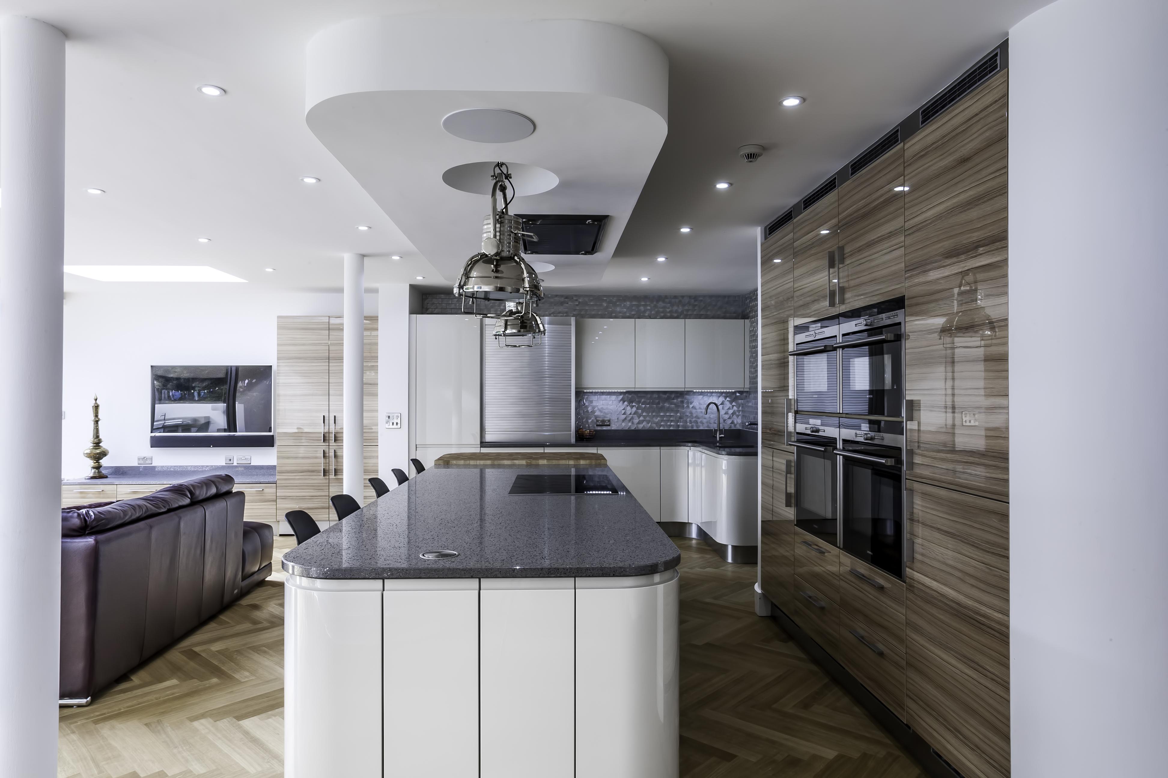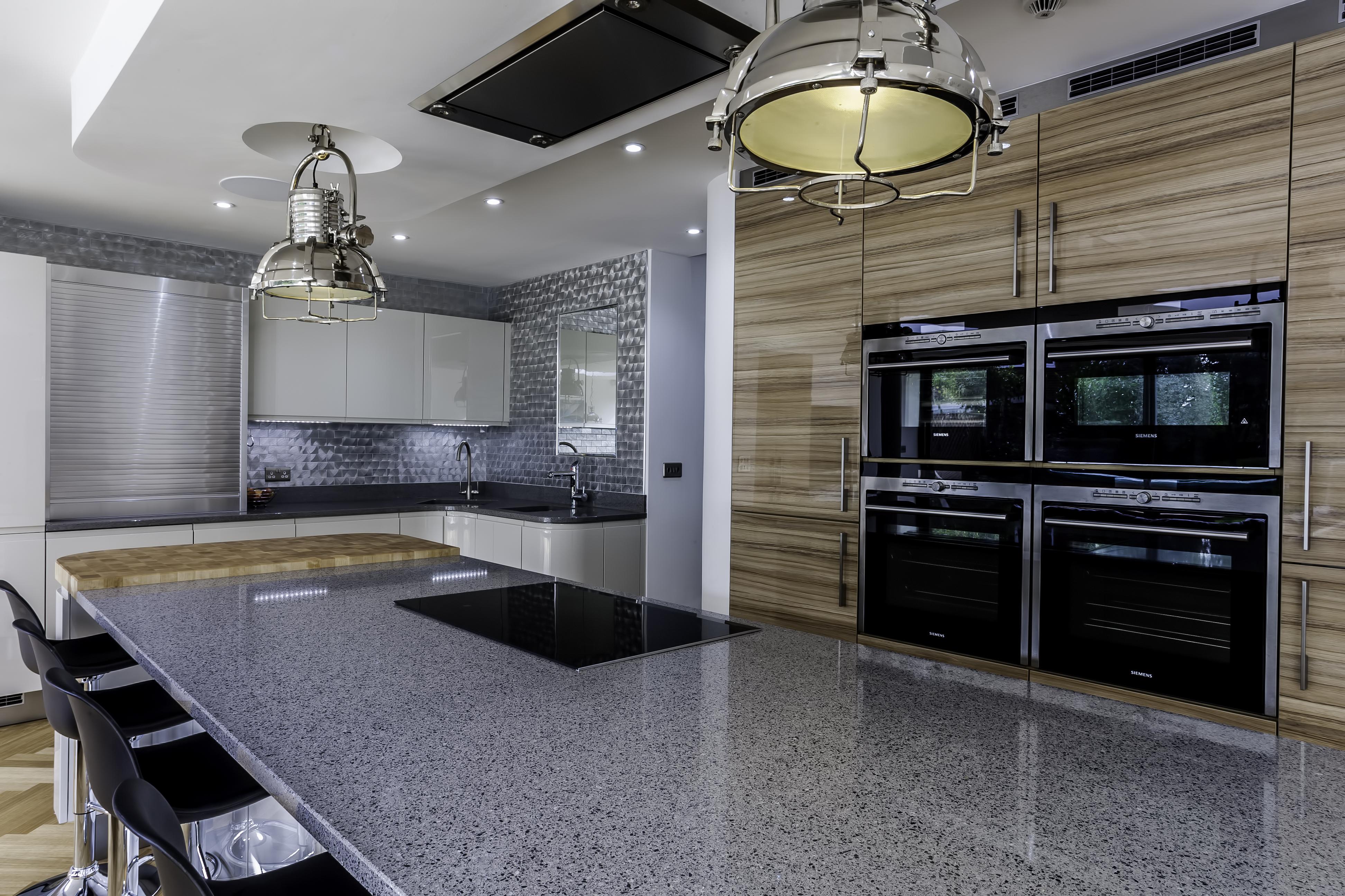 The client opted for white gloss ‘J’ trim units from our English range, combined with a wood effect gloss to blend with and compliment their parquet flooring. The worktop is a grey quartz in ‘Chrome’, which adds a subtle sparkle to the room and blends with the silver wall cladding in the sink area.