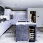 In this design, a mix of two worktops were chosen, ‘Steel Grey’ granite on the sink run and ‘Lyra’ quartz on the island, each complimenting the colour scheme.