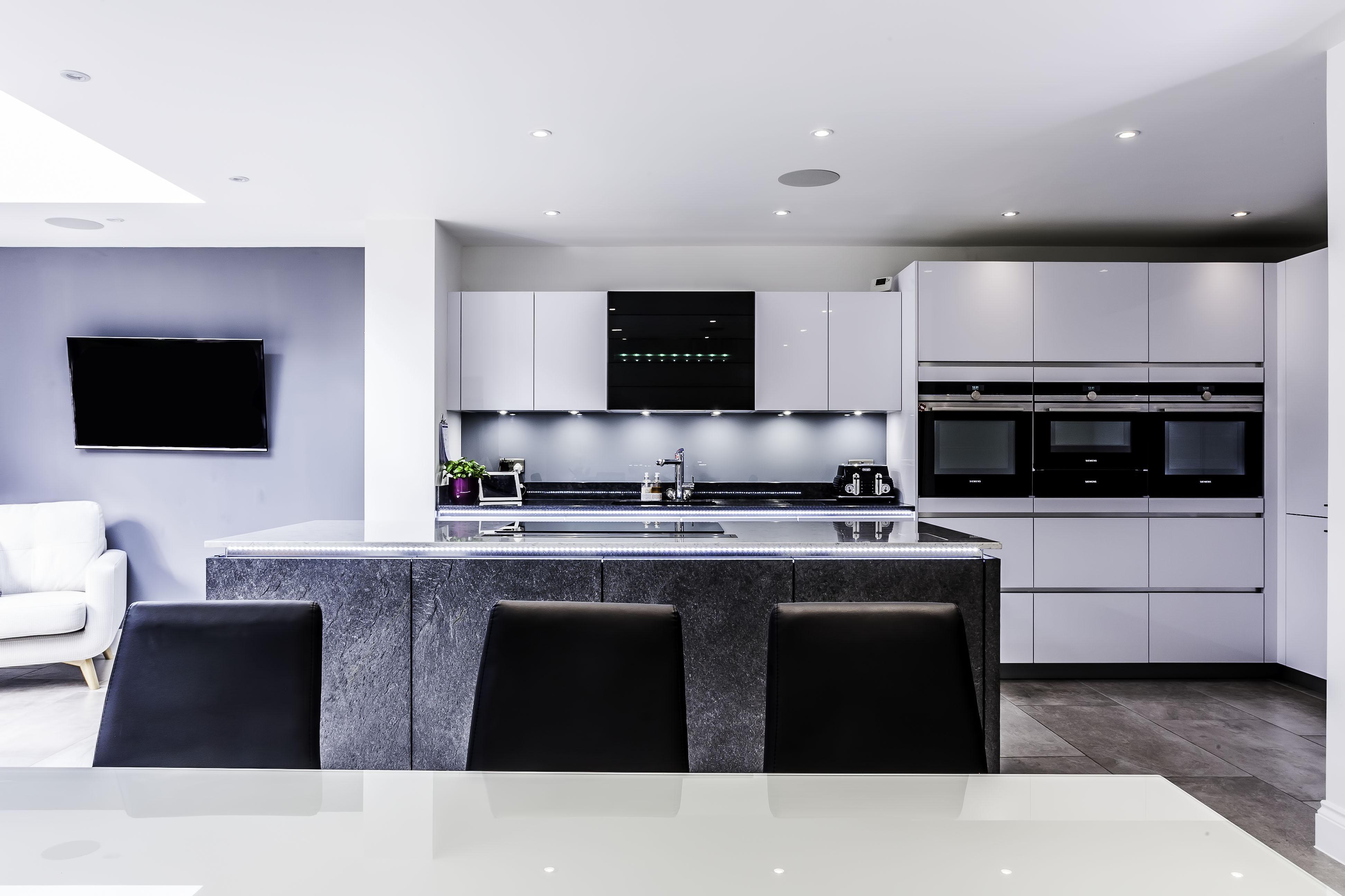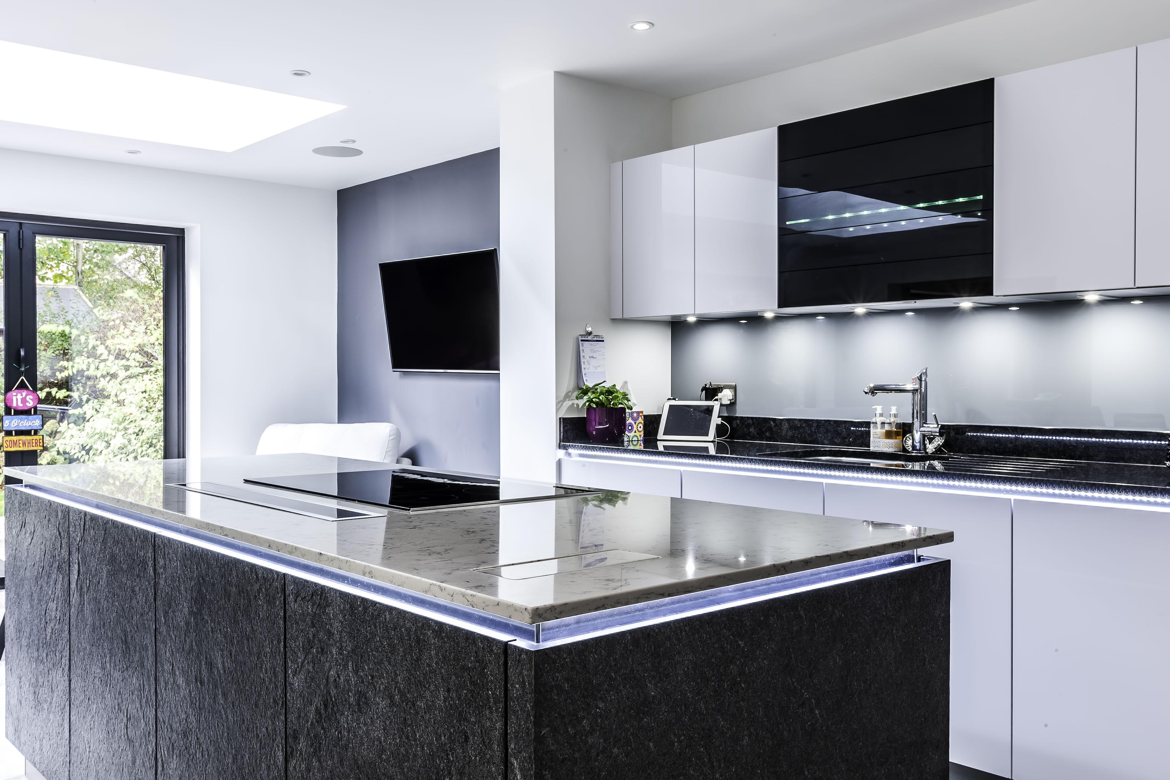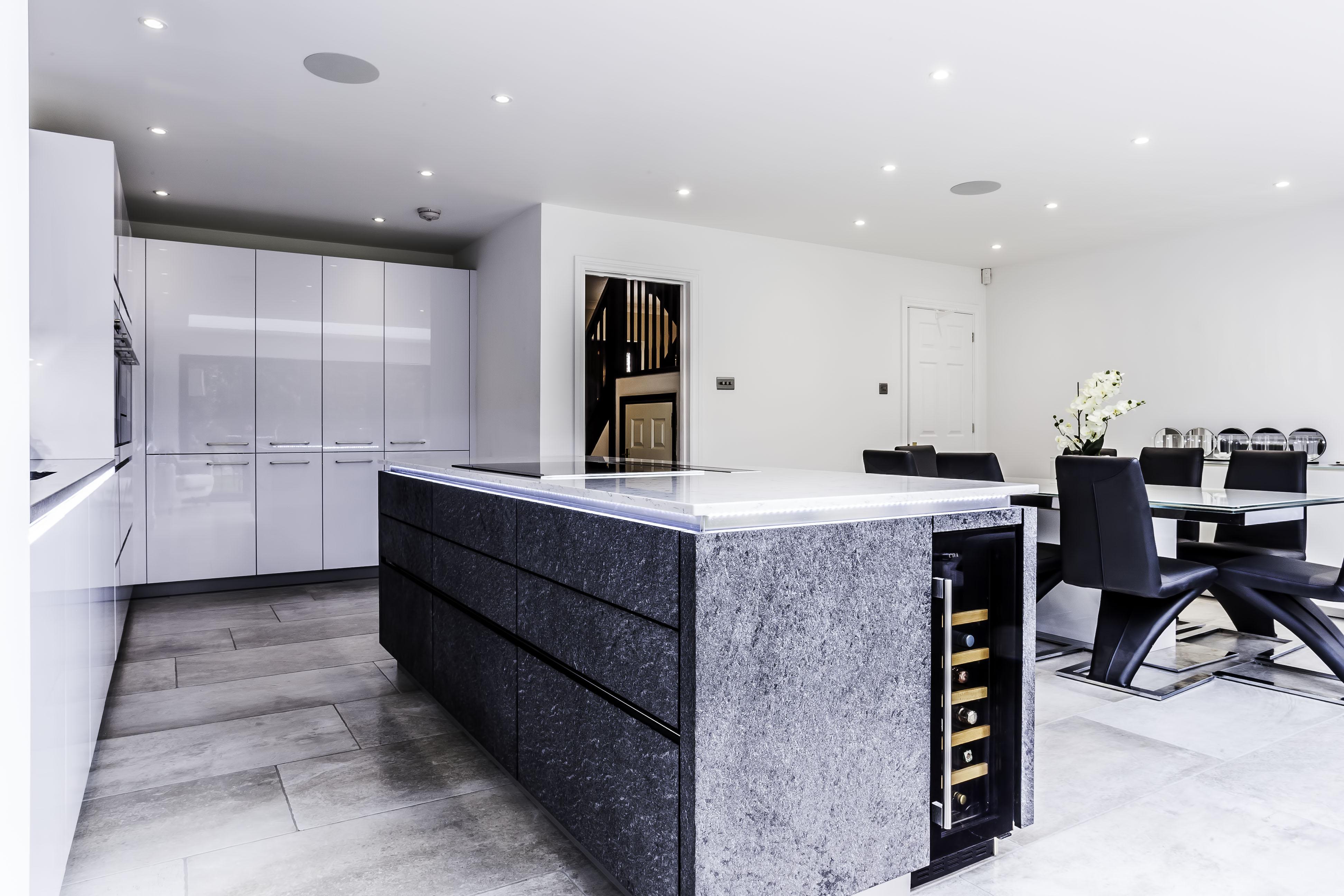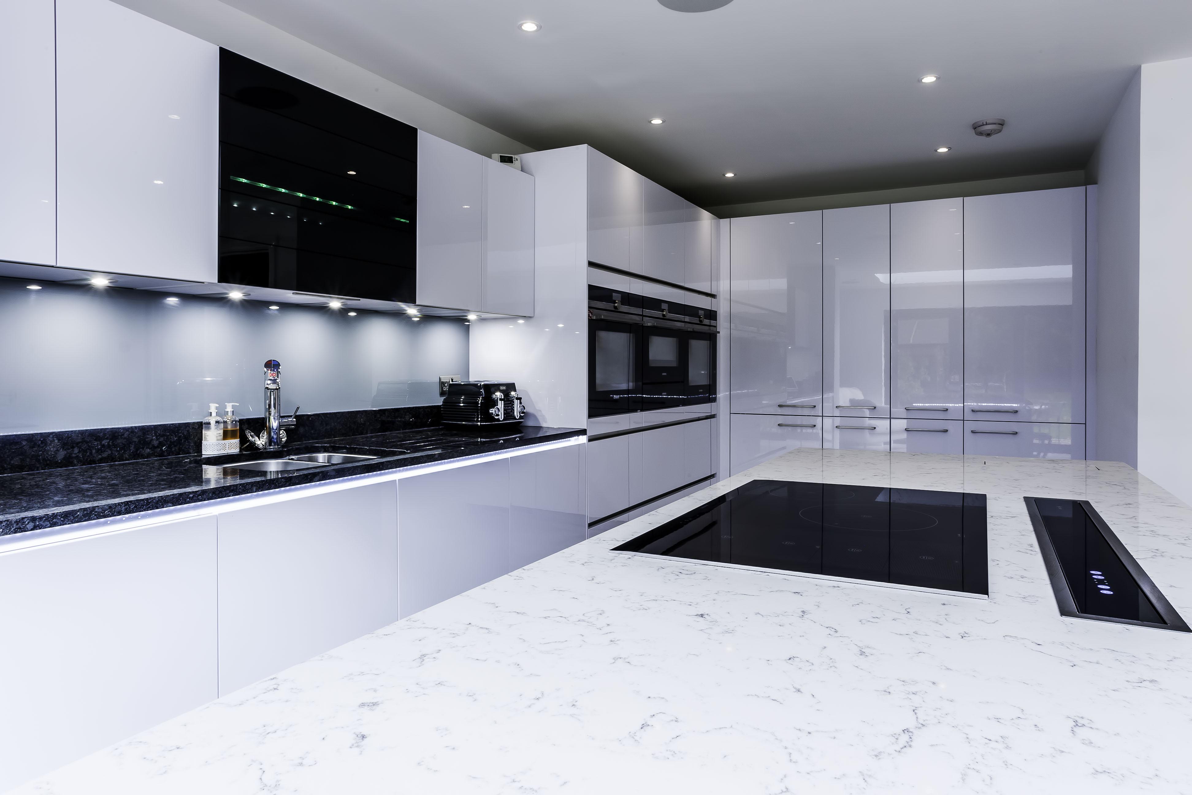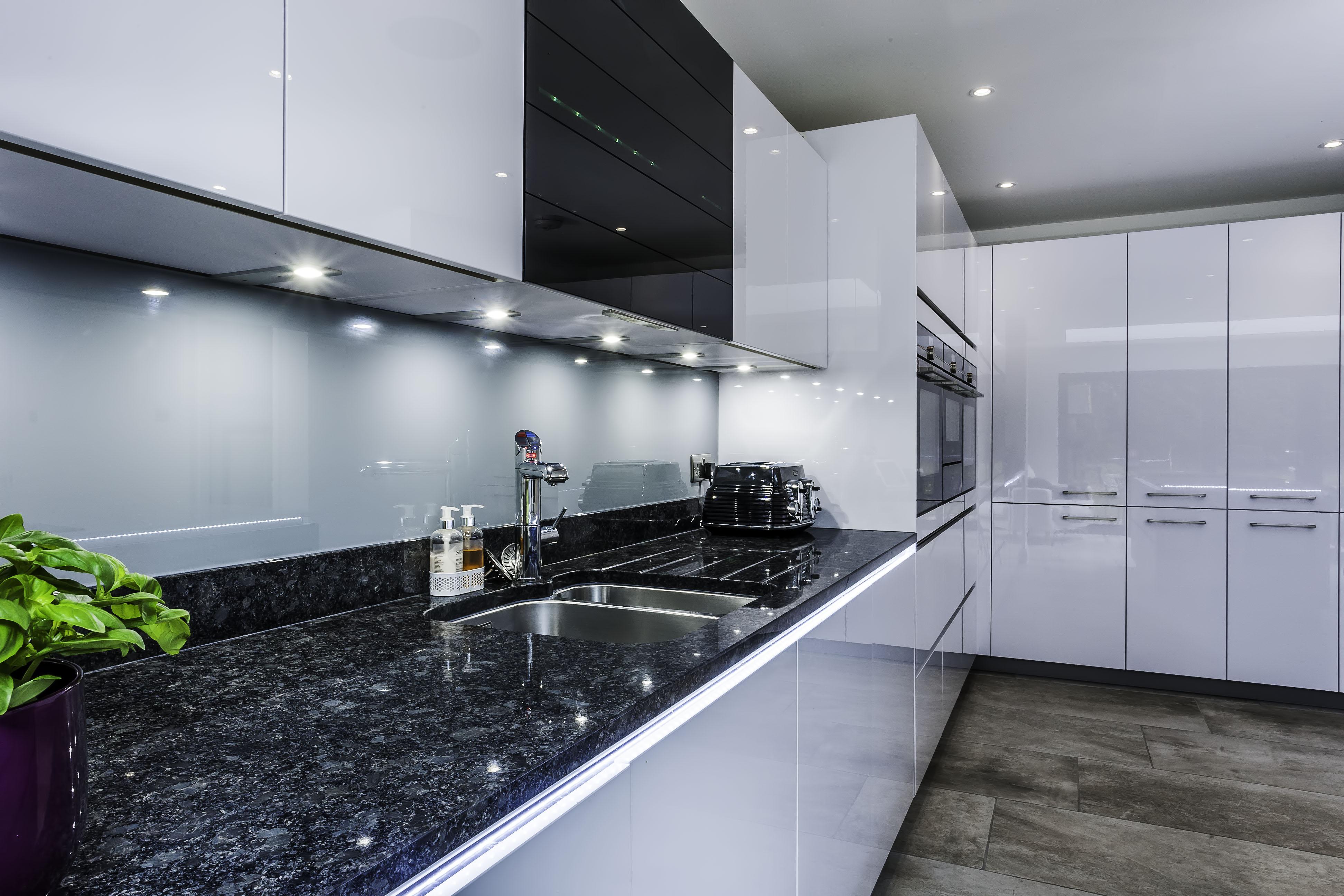 This beautiful kitchen is a mix of ‘Polar White’ gloss and ‘Black Star’ cabinetry.