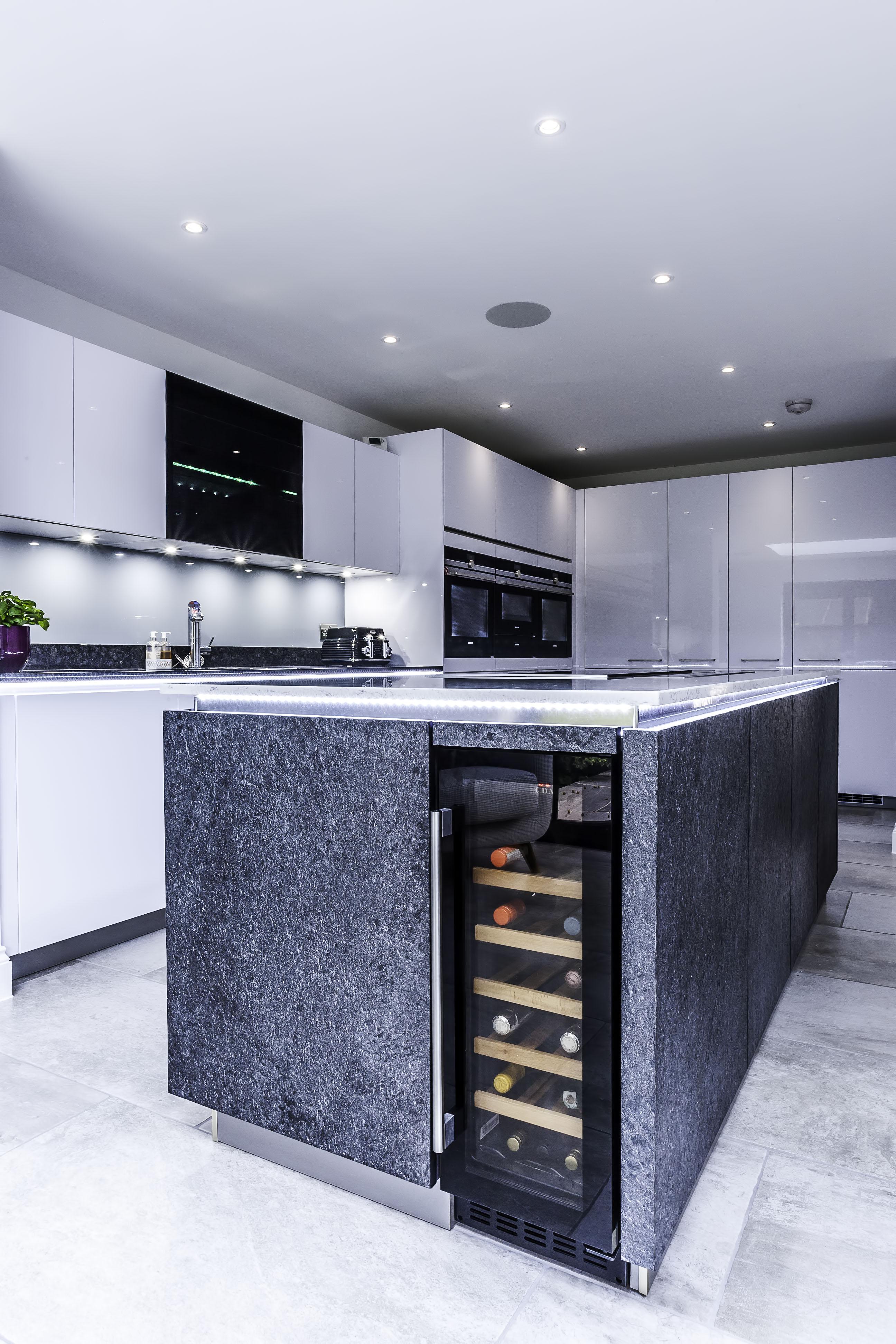 The stunning island takes centre stage, with the slate veneer doors providing texture and contrast in a light room. An island is often the hub of the kitchen and a great entertaining area, especially in an open plan space. The Siemens induction hob with down-draft extractor makes for a social cooking area, perfect for those all-important dinner parties!
