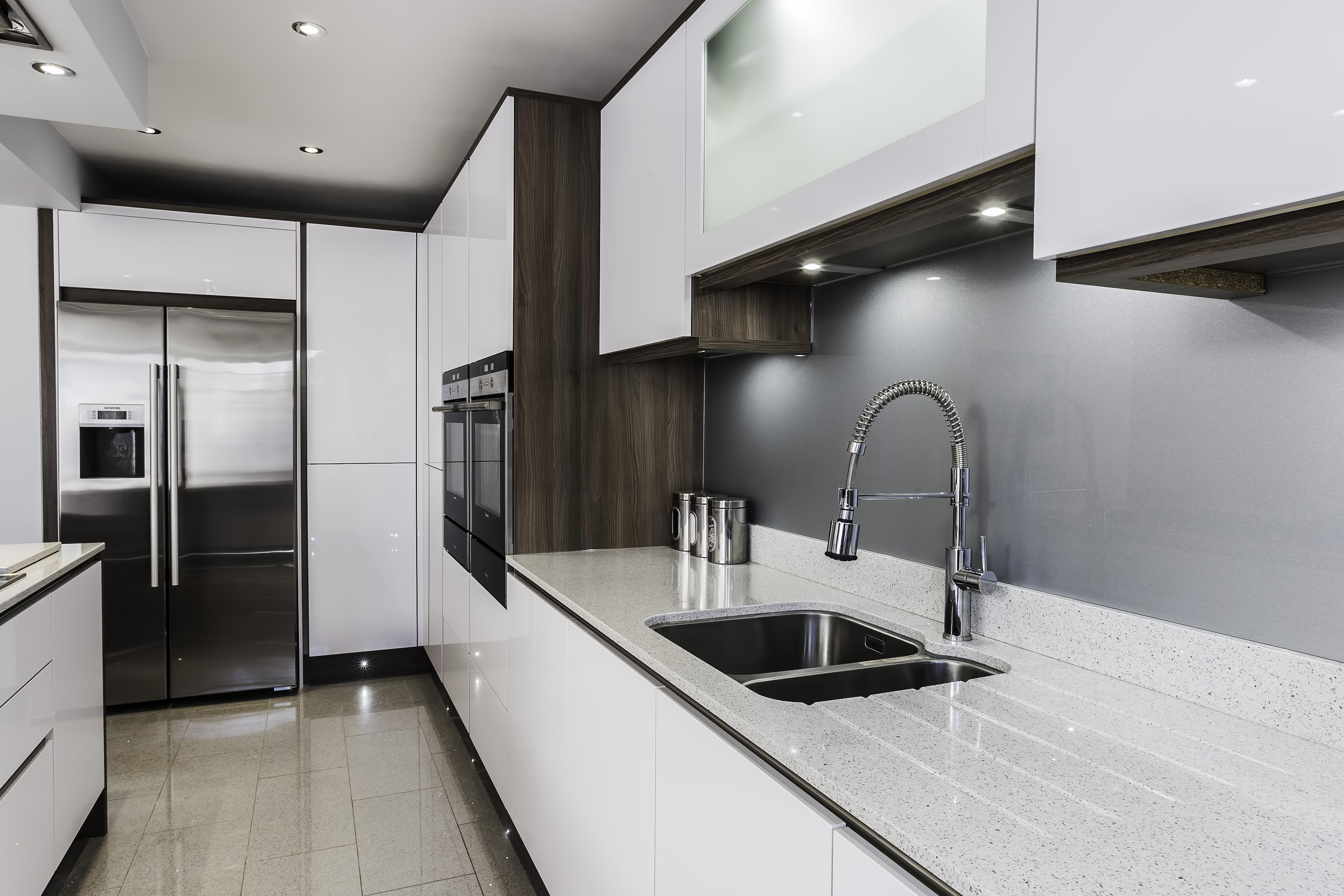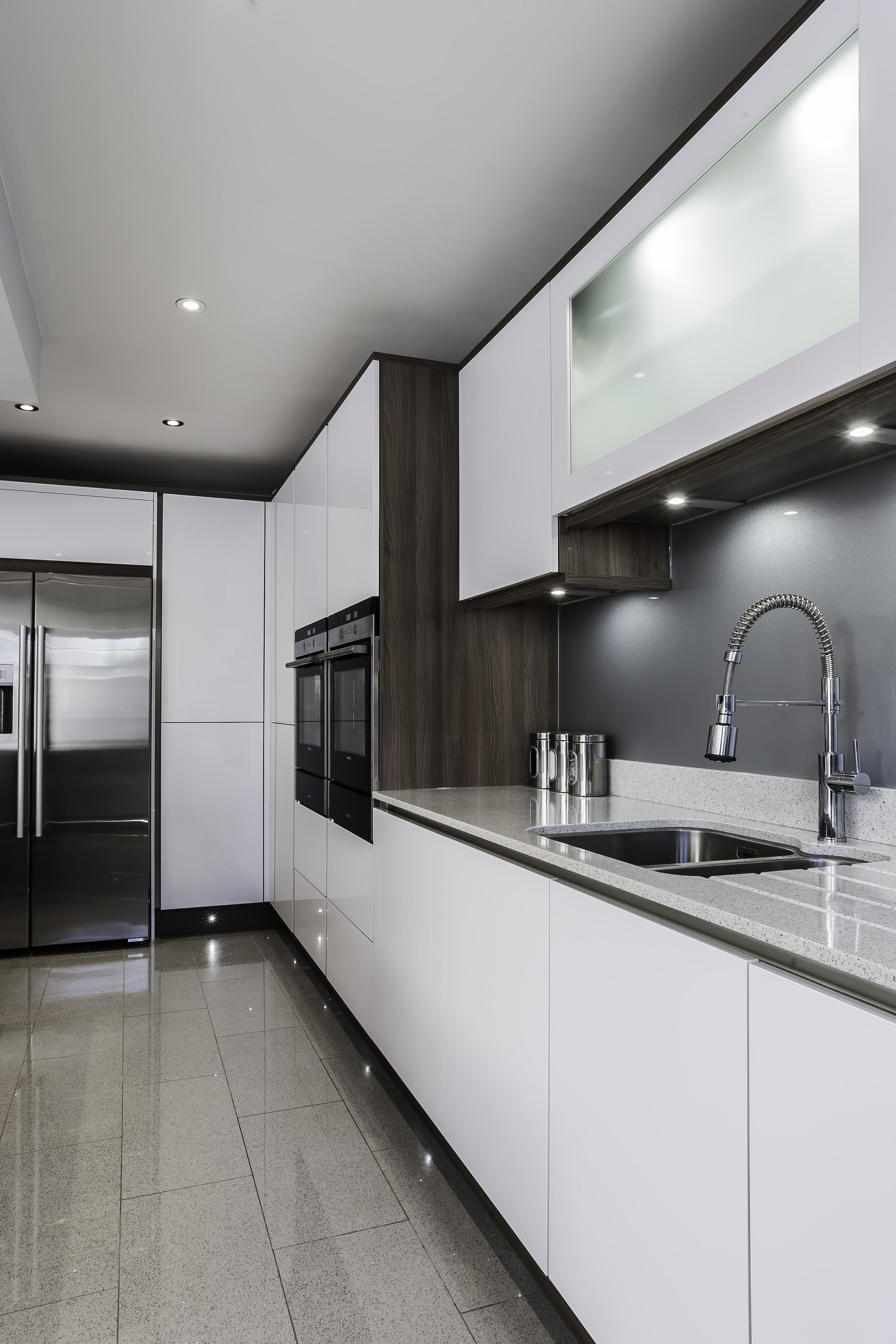 A backsplash of grey glass breaks up the white, as well as the feature wood side panels on the units.