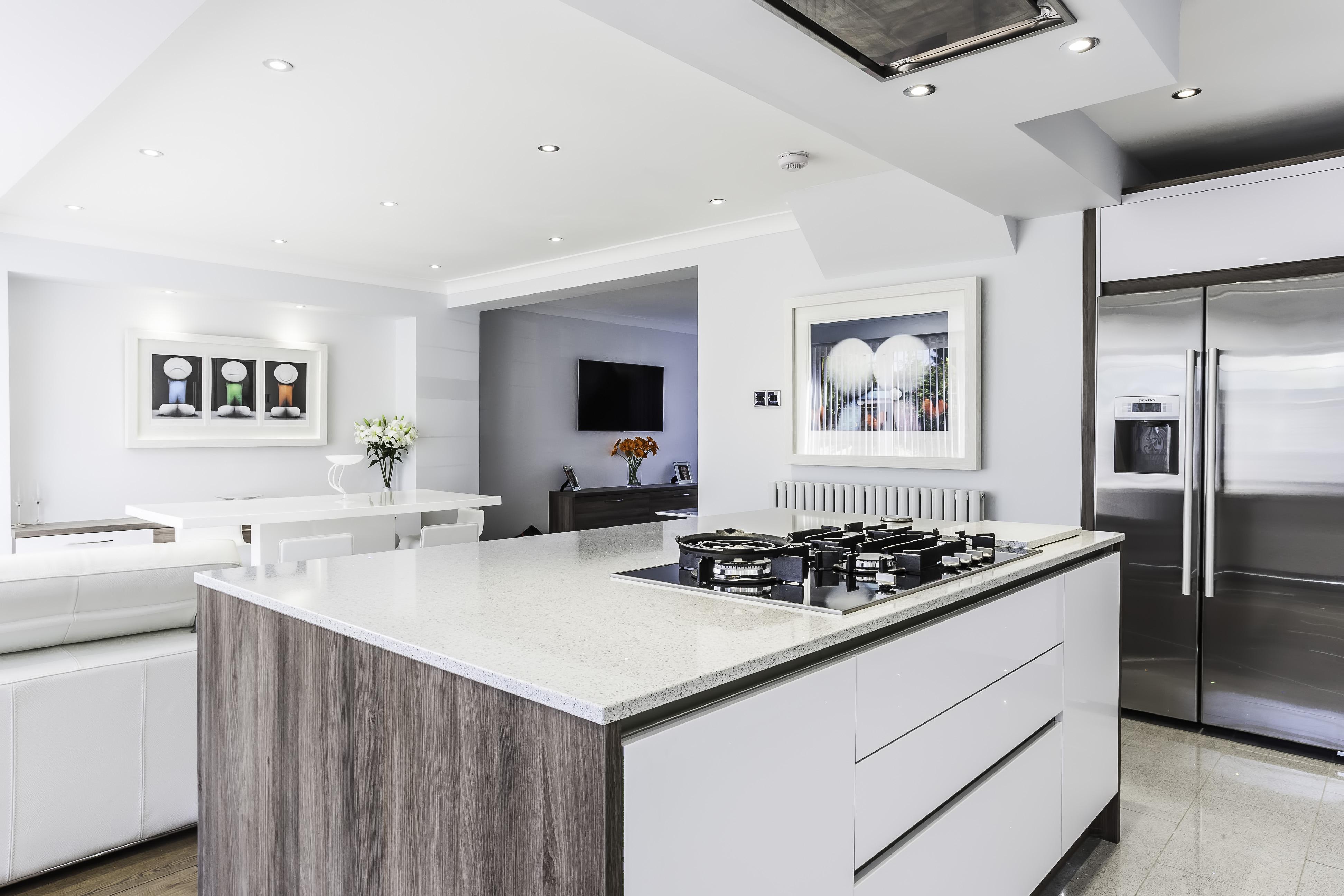 The white quartz worktop in ‘Lactea’ compliments the cabinets and maximises the light in the kitchen, it also blends with the rest of the clients interior choices.
