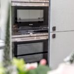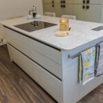 A calming combination of wood painted handleless cabinetry in Prosecco and Light Sage, paired with the stunning Bianco Drift quartz work surface.