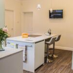 As well as the island, tall units along the back wall are great for storing larger items. Glass display units sit on a tiled feature wall and showcase the client’s glass collection.