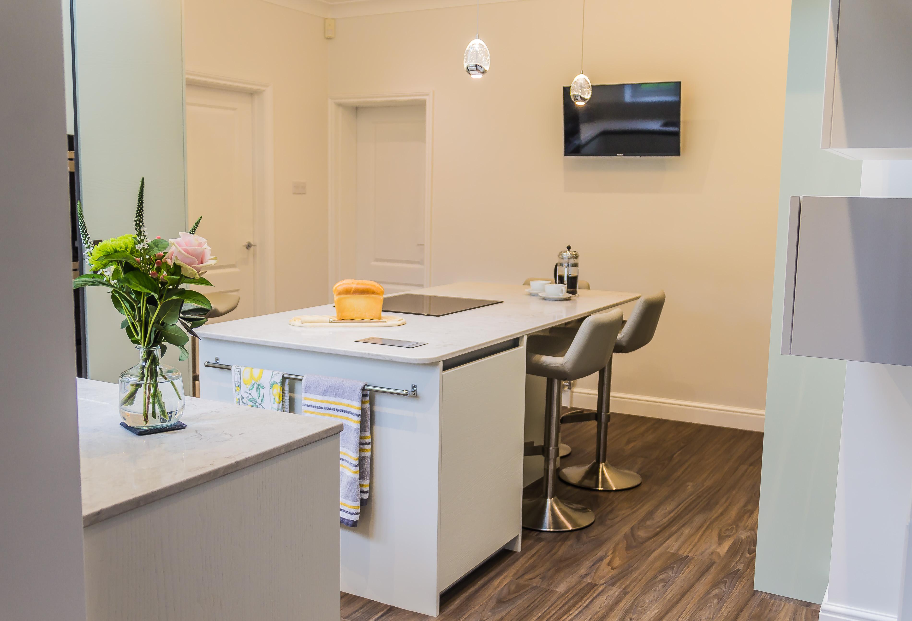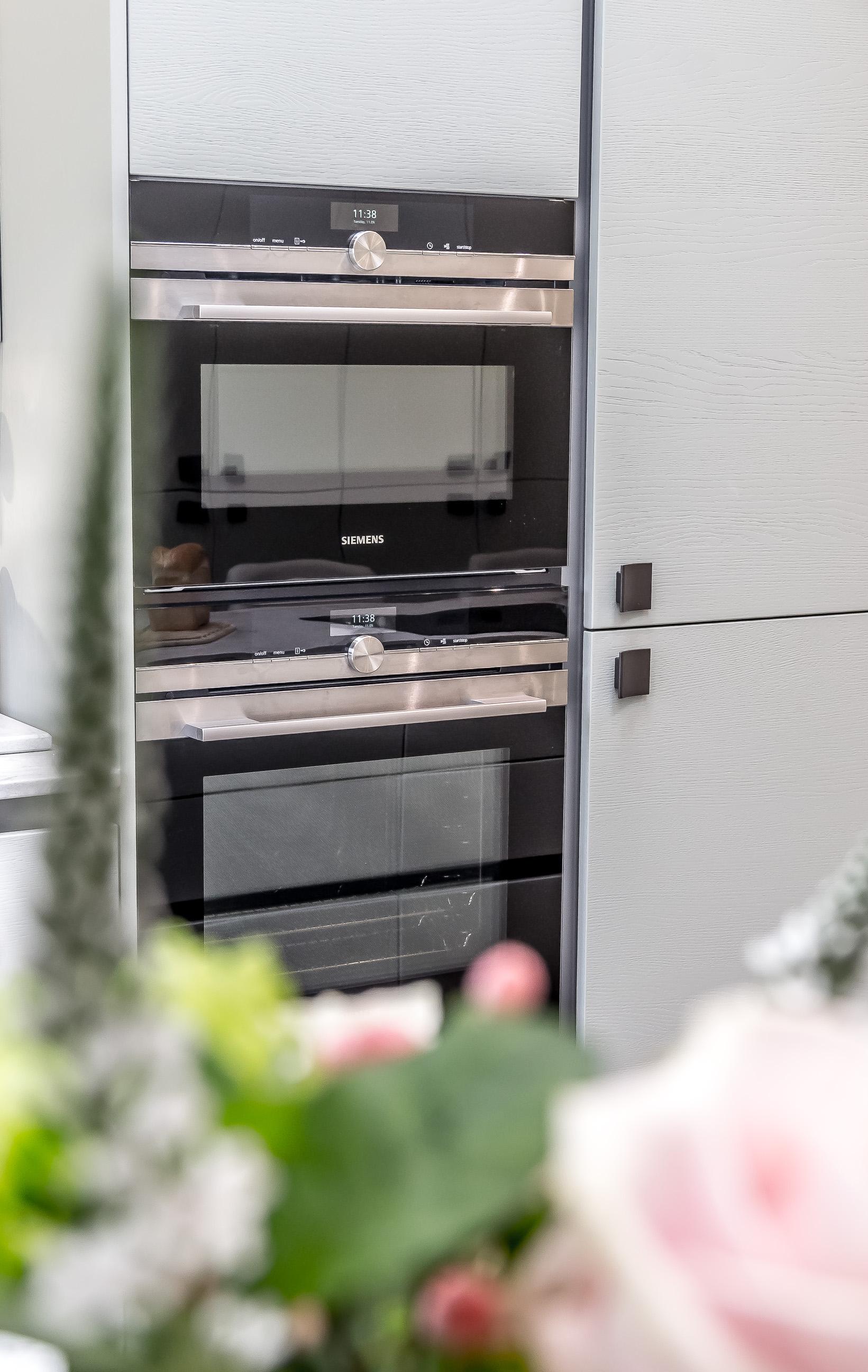 A calming combination of wood painted handleless cabinetry in Prosecco and Light Sage, paired with the stunning Bianco Drift quartz work surface.