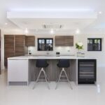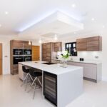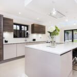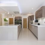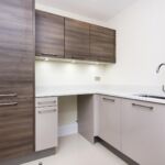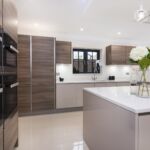 The developers wanted a high specification kitchen, including quality cabinetry and state of the art appliances. Gloss Cashmere and wood effect Grey Acacia units have been combined with Nova White quartz worktops for a simple yet sleek statement kitchen.