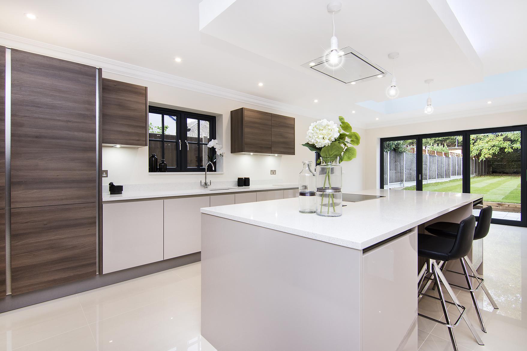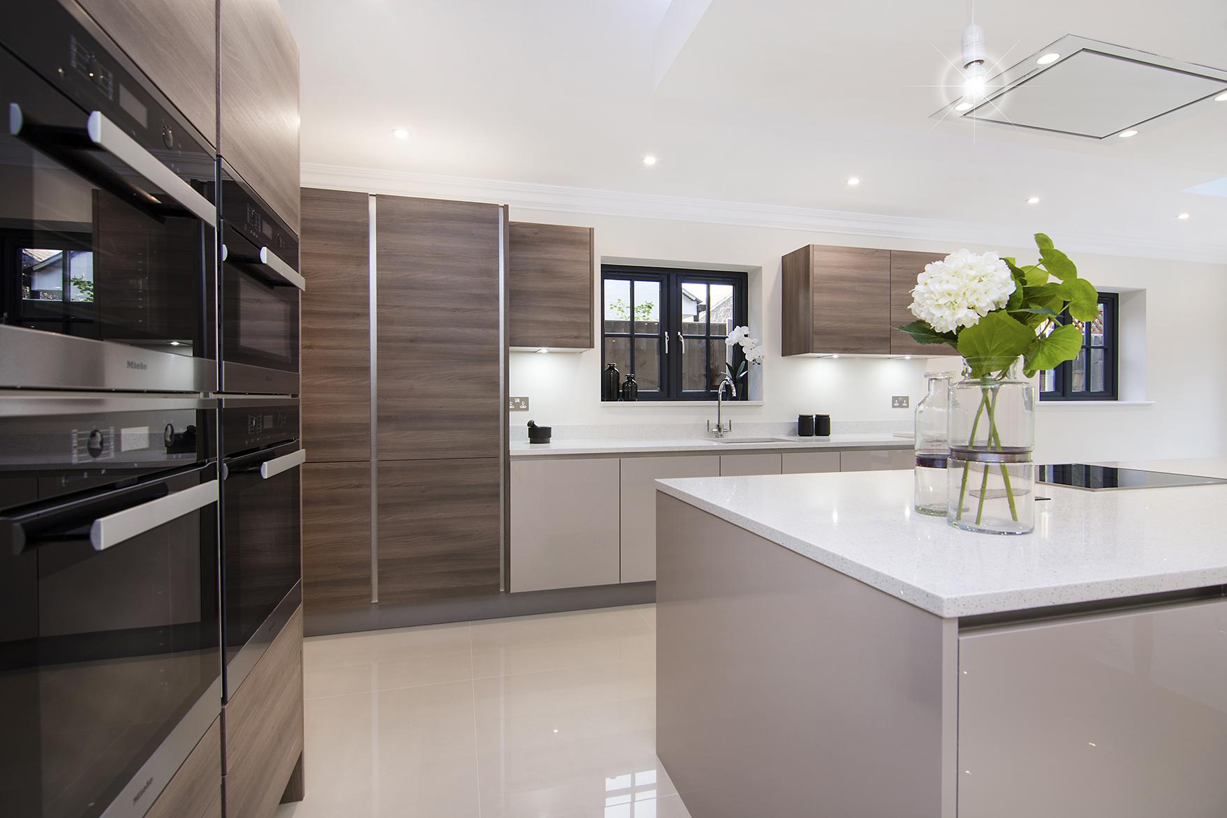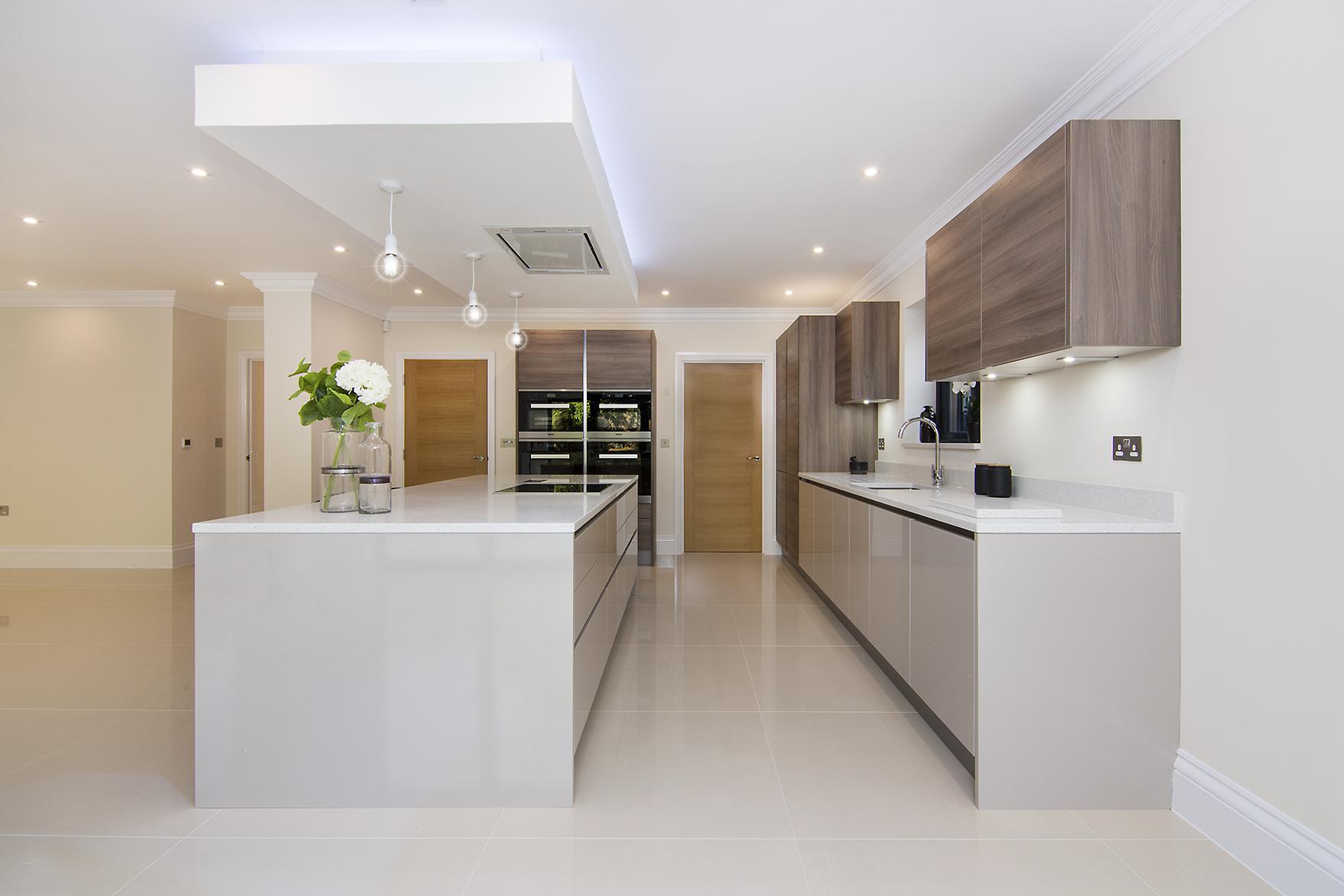The developers wanted a high specification kitchen, including quality cabinetry and state of the art appliances. Gloss Cashmere and wood effect Grey Acacia units have been combined with Nova White quartz worktops for a simple yet sleek statement kitchen.