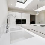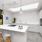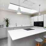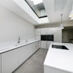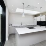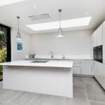 This modern kitchen has been created by using a neutral colour pallet of ‘AV4030 gloss Taupe’ with ‘Iconic white quartz’ worktop. The use of the neutral colour pallet keeps the space feeling light bright and open especially with the help of the sky lights and, huge bi-fold doors bringing the outside in.