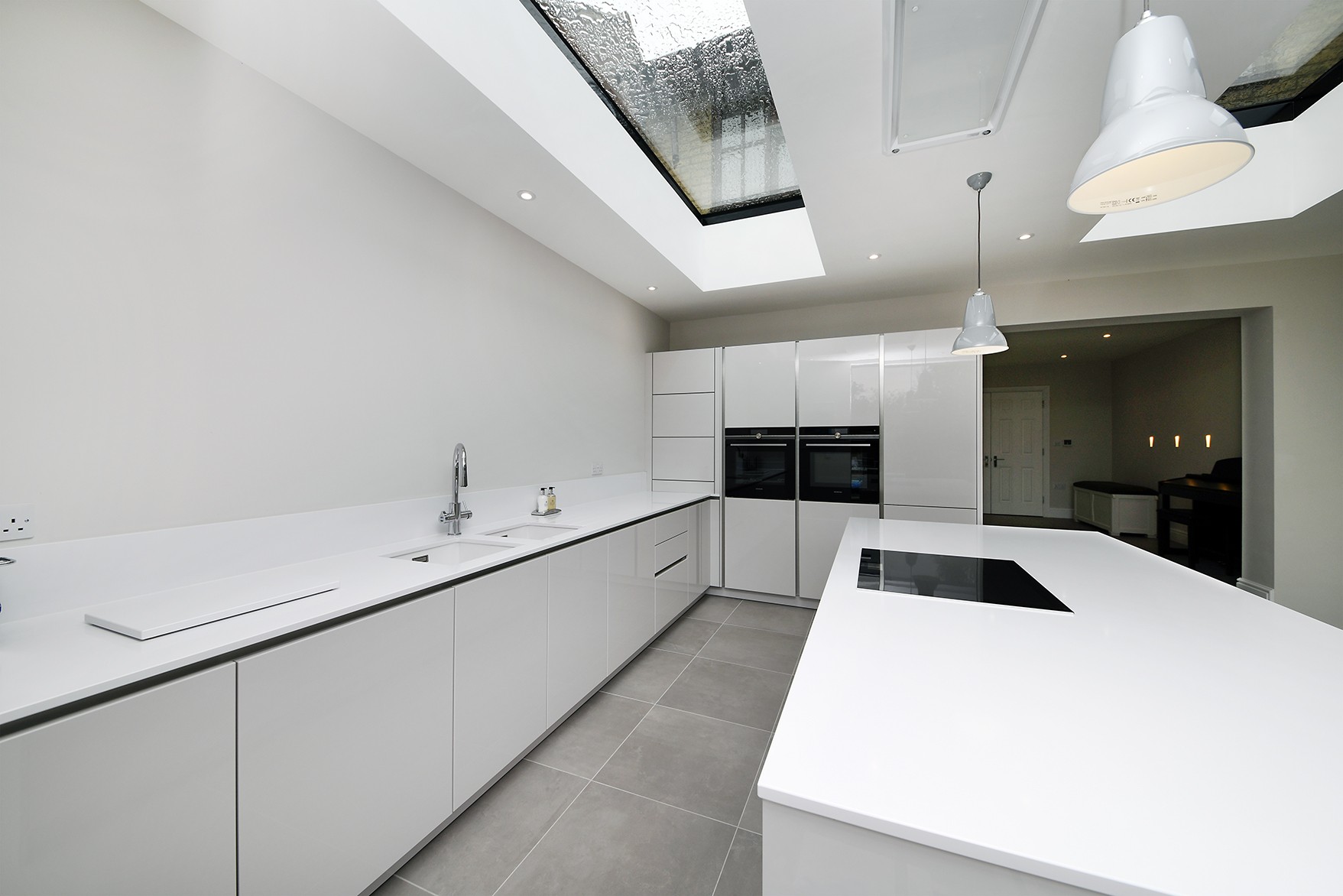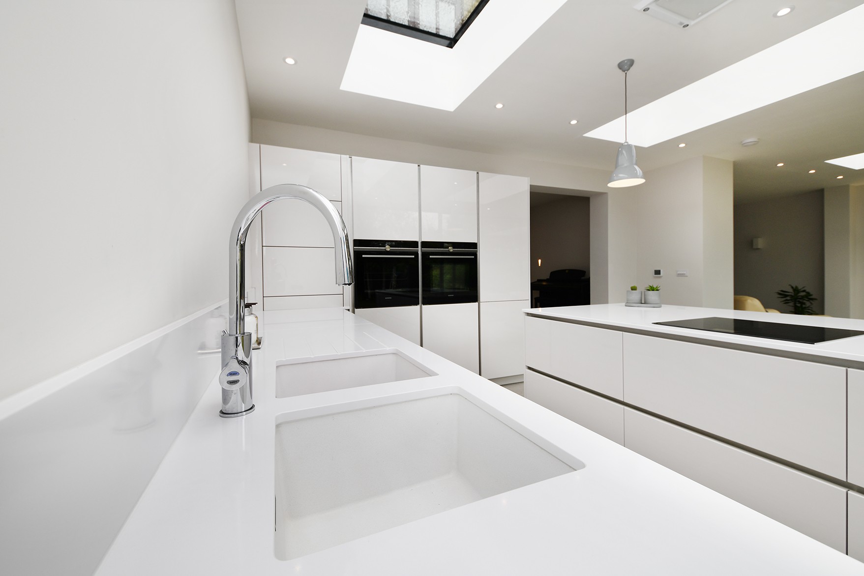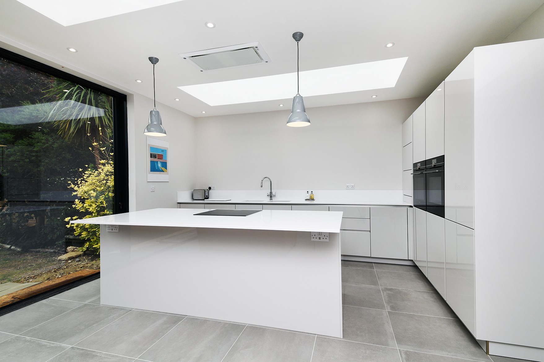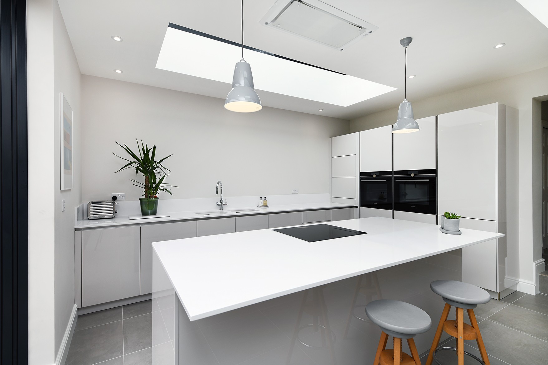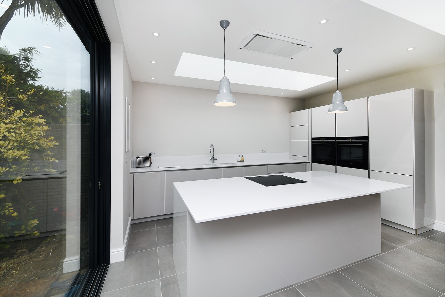 This modern kitchen has been created by using a neutral colour pallet of ‘AV4030 gloss Taupe’ with ‘Iconic white quartz’ worktop. The use of the neutral colour pallet keeps the space feeling light bright and open especially with the help of the sky lights and, huge bi-fold doors bringing the outside in.
