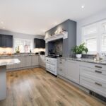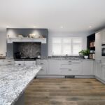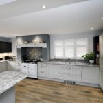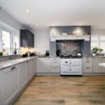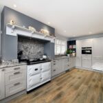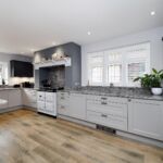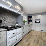 This shaker style kitchen has been created by using ‘Charnwood pebble grey’ on the base and tall units with ‘Charnwood diamond grey’ on the wall units. These two colours are tied in together beautifully by pairing them up with a granite worktop with upstand and matching window sill in ‘Sense antico Bianco’.