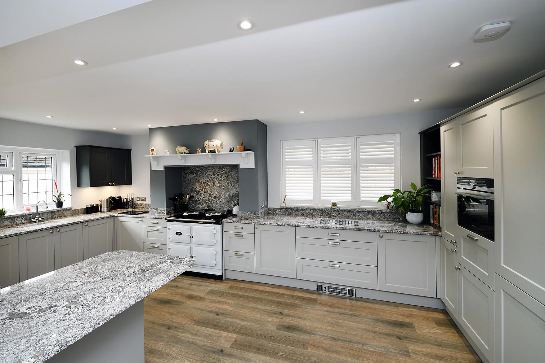 This shaker style kitchen has been created by using ‘Charnwood pebble grey’ on the base and tall units with ‘Charnwood diamond grey’ on the wall units. These two colours are tied in together beautifully by pairing them up with a granite worktop with upstand and matching window sill in ‘Sense antico Bianco’.