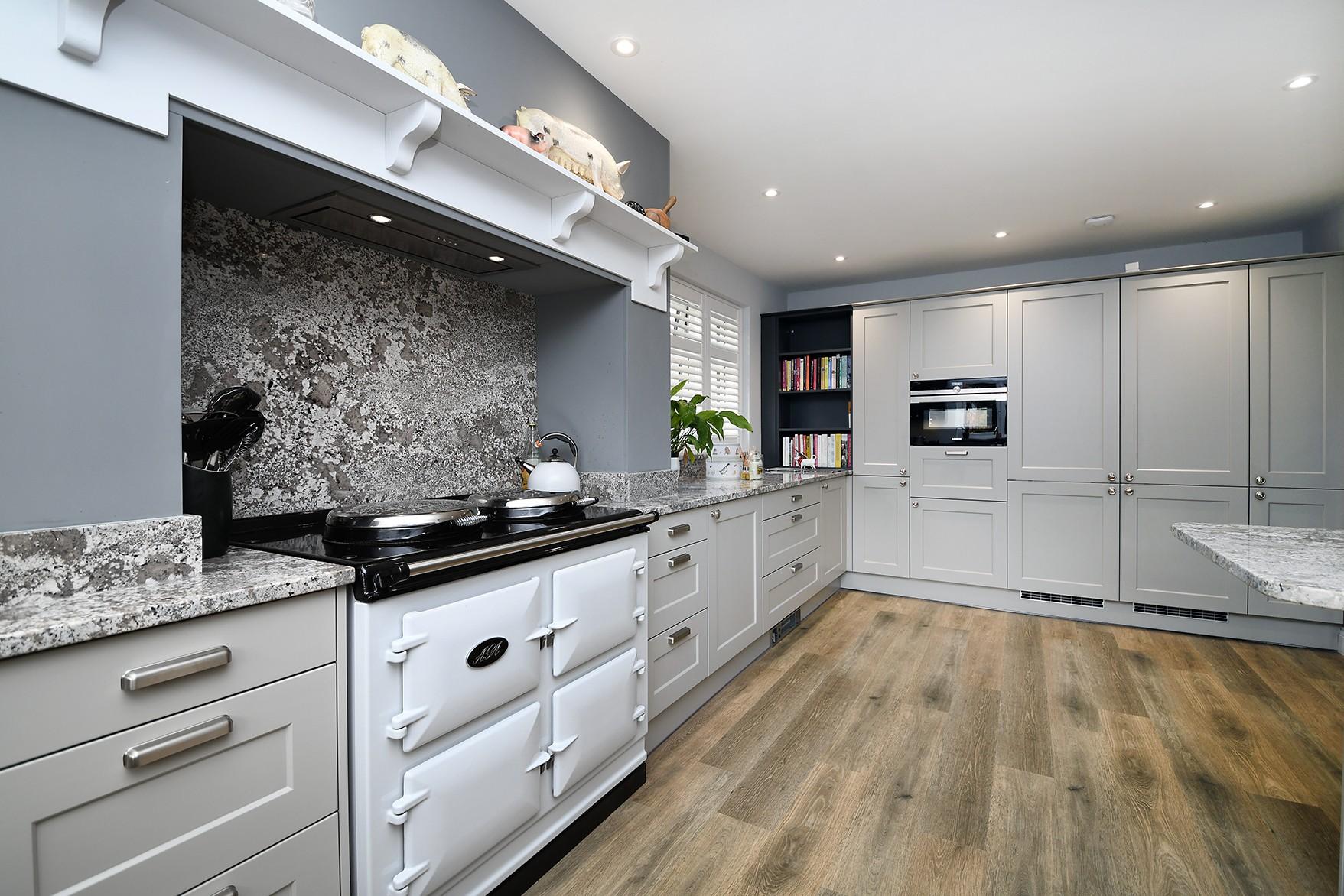 The main focal point of the kitchen is the beautiful white Aga oven placed neatly in the old fireplace. The decorative shelf above also in white ads yet more character to the kitchen as well as allowing the customer to display a bit of their own personality. The other appliances to finish the kitchen off are a full size integrated Siemens fridge and freezer along with, a canopy extractor hood as well as, a compact oven with a microwave, this is perfect for the customer when they want to quickly cook a pizza for dinner rather than having to wait for the Aga to heat up.